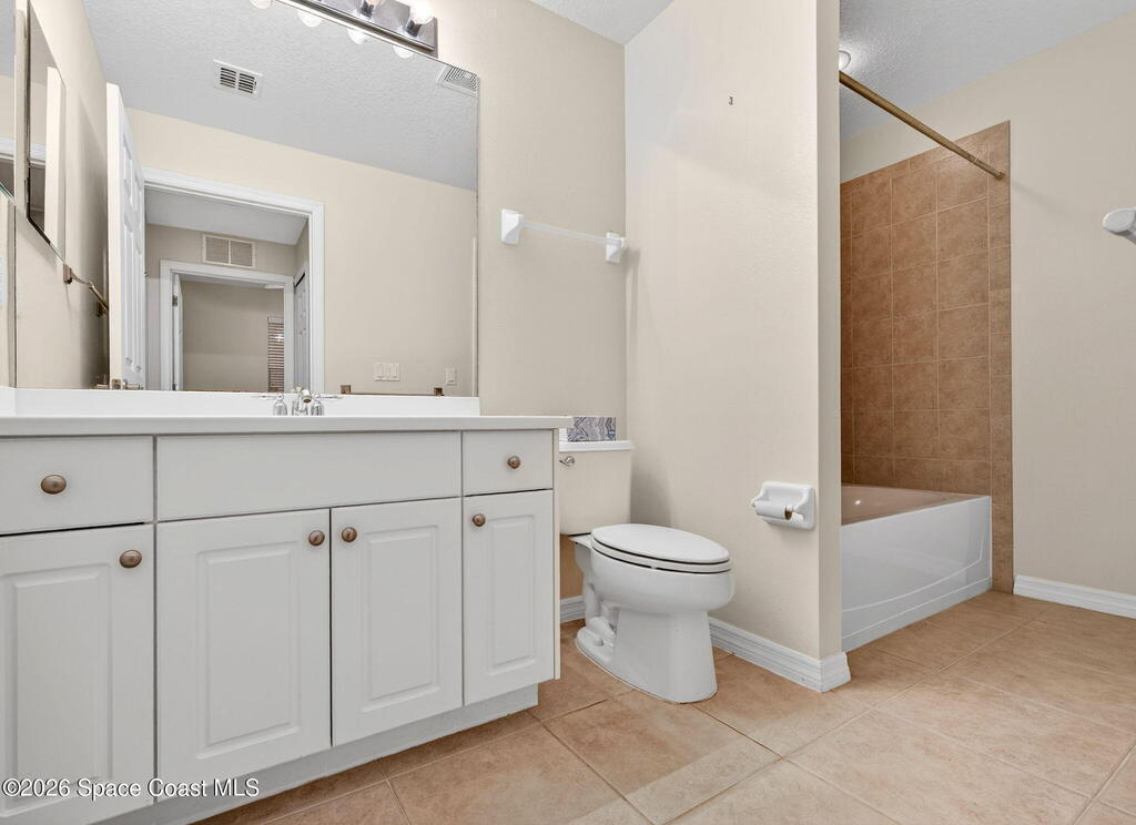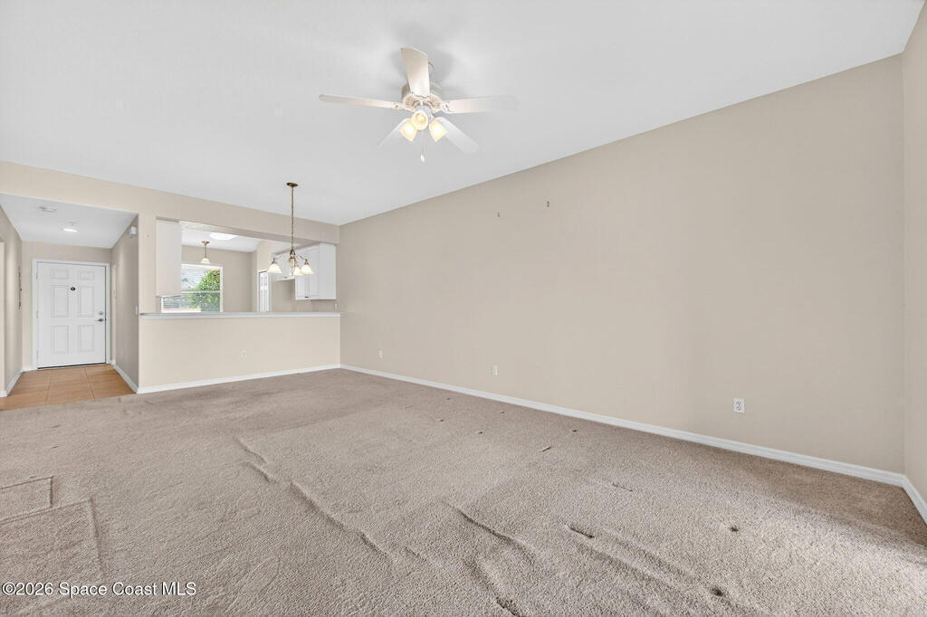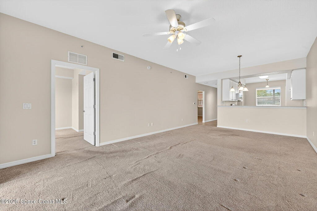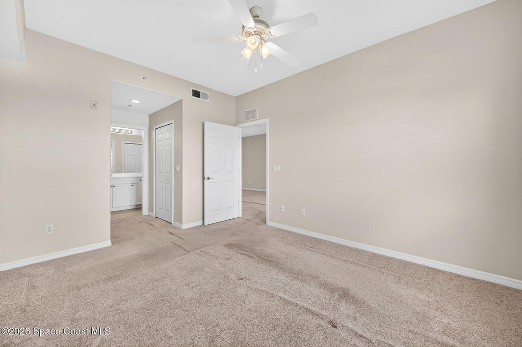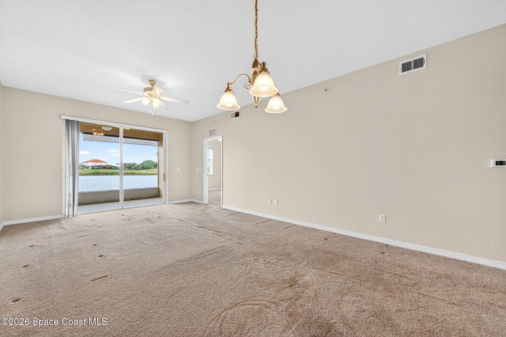 This is the best priced condo in Heritage Isle, Viera's most prestigious 55+ community. This lovely 2 bedroom 2 bath unit offers a spacious eat-in kitchen with loads of white raised panel cabinets, solid surface countertops, tile flooring and lake views! The kitchen is open to the large great room - living / dining combo with an 8 foot sliding glass door to the large screen porch. Watch waterfowl from your living room! Your view beyond the lake is of estate homes, Primary suite is large enough for a king size bed and also has a lake view. His and hers walk-in closets, and a lovely primary bath with a large vanity and a glass door to the walk-in shower. The guest bath offers a tub/shower arrangement along with a single sink vanity, This area also accommodates a laundry closet. Overall a neat clean unit that just needs some new carpeting. Come home to live the luxury Heritage Isle lifestyle.