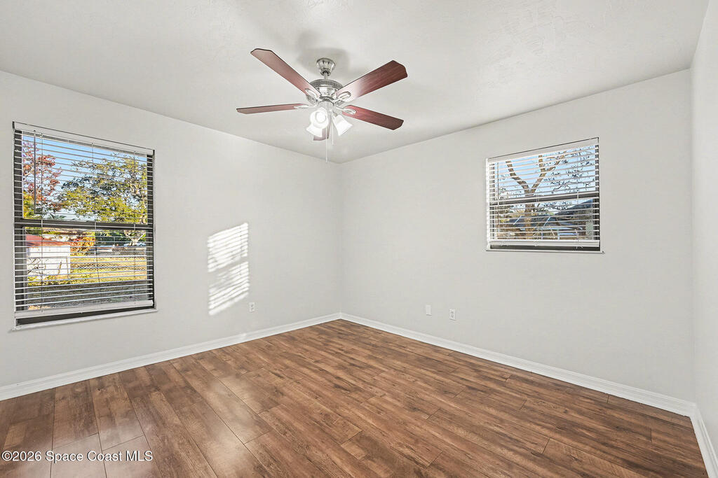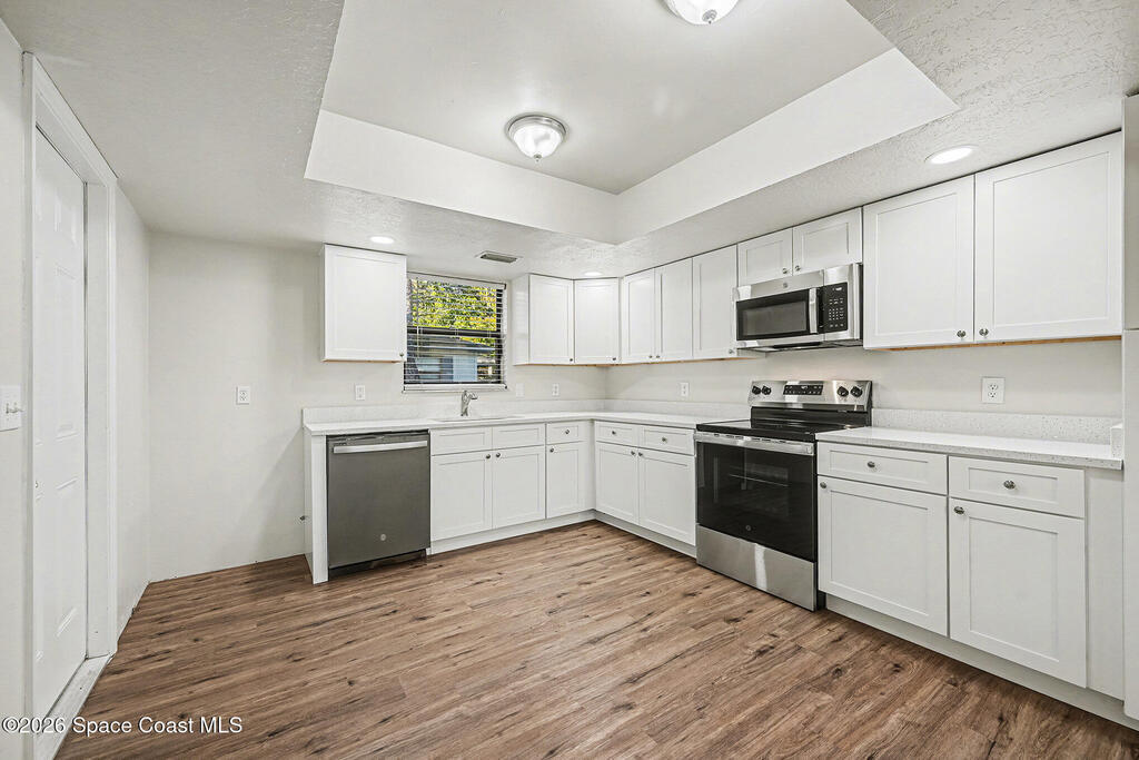 This move-in-ready home offers stylish updates and a functional layout, perfectly positioned between Kildare Park and Schumann Dr Park. Laminate flooring flows throughout the living areas and bedrooms, with durable vinyl plank in all wet areas. The living room is anchored by a cozy fireplace, creating a warm focal point for everyday living and entertaining. The kitchen features white shaker cabinetry, quartz countertops, and an appliance package including dishwasher, electric range, and microwave. The primary suite offers a walk-in closet, double-sink vanity with quartz tops, a walk-in shower, and a separate garden tub. The guest bath includes an updated vanity and a tub/shower combo. Additional highlights include a 2-car garage with electric washer/dryer hookups and a garage door opener. Enjoy outdoor living in the screened lanai overlooking a fully fenced chain-link backyard--ideal for pets, play, or relaxing evenings.