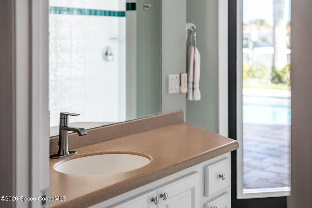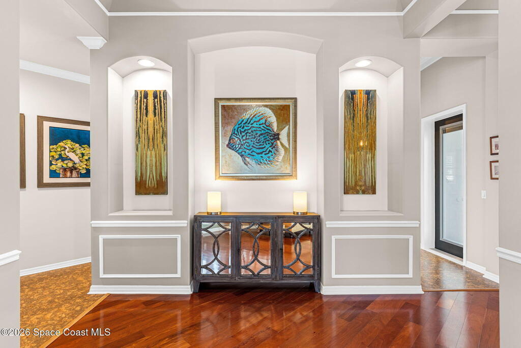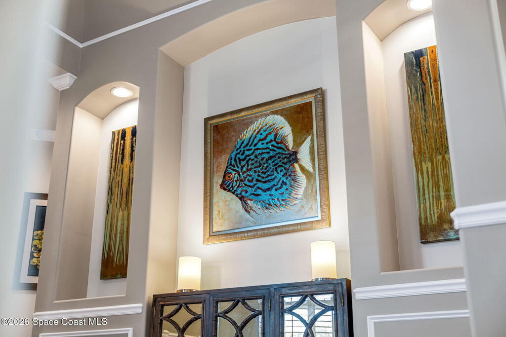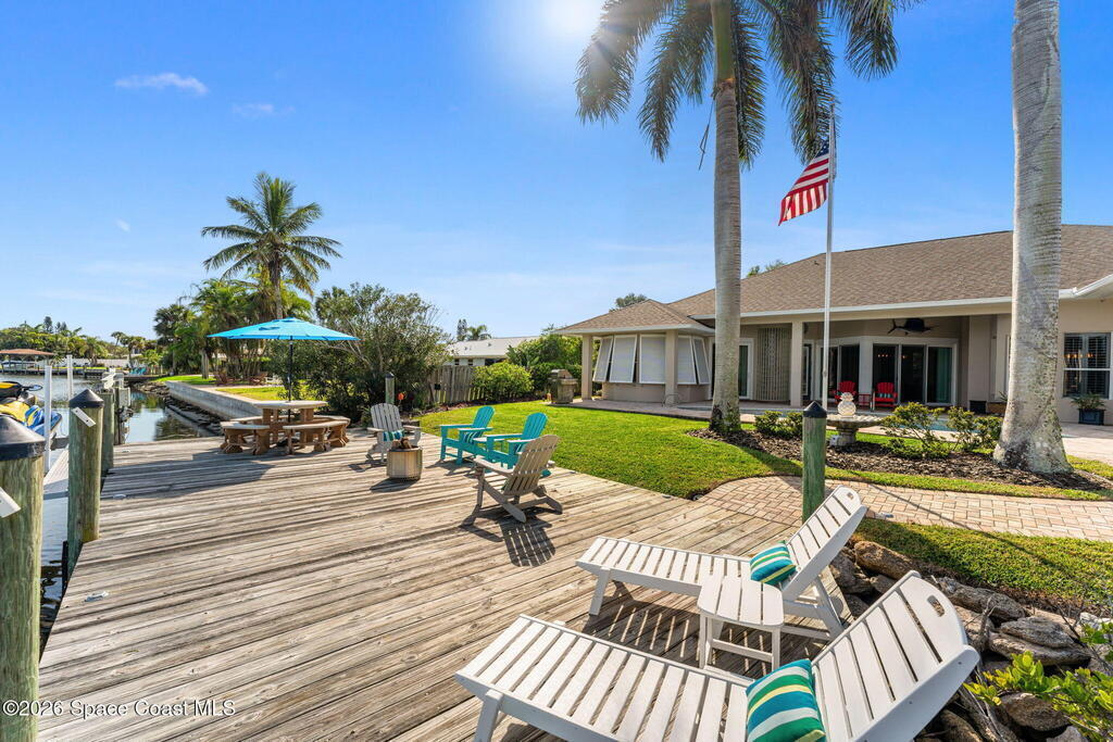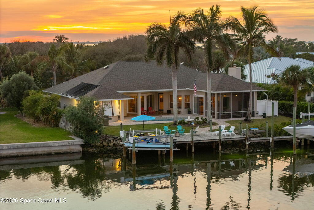 WIDE-CANAL WATERFRONT LIVING in Cocoa Beach. This 3 bed, 3 full bath home + office is positioned on a DEEP, OPEN CANAL offering exceptional maneuverability & boating functionality. The office, located near a full bath, provides flexibility as a potential 4th bedroom. Inside features include 12-ft ceilings, an open & livable floor plan, impact-rated sliders, water views throughout, & retractable front door screens. 12' ceilings in main living areas, 10' ceilings in other rooms. The kitchen offers cork flooring, under-cabinet lighting, a warming drawer, large pantry, a 5-burner induction cooktop, convection & combi-steam wall ovens, dishwasher drawers (vs standard dishwasher), & a gas water heater. Outdoor living includes a screened patio w/ refrigerator, sink, & pre-plumbed connections for an outdoor kitchen, built-in Sonos speakers, pool (refinished 2022) & spa. The dock is equipped w/ 2 boat lifts (9,000 lb & 16,000 lb), underwater fish lights, & 30-amp shore power.