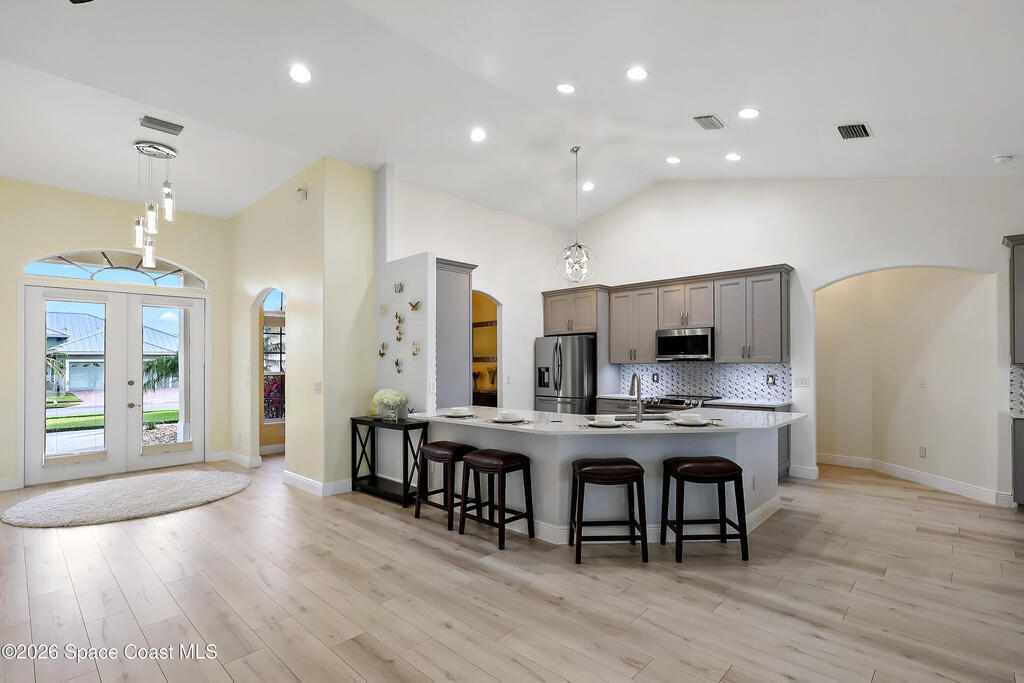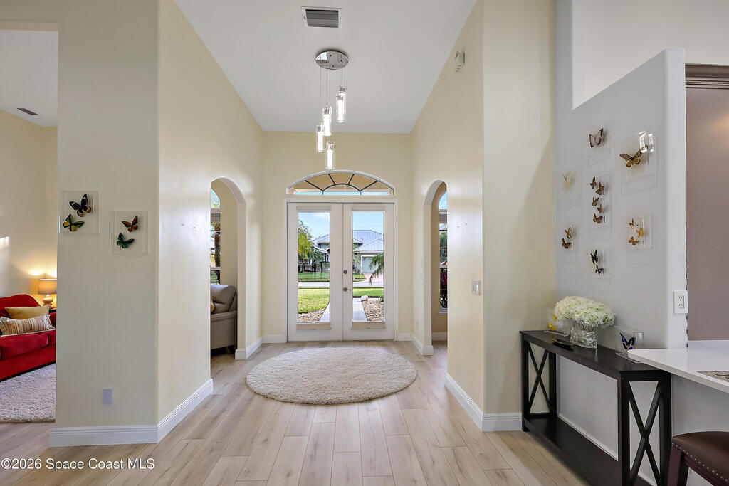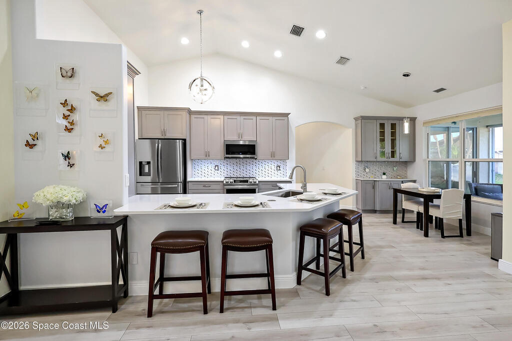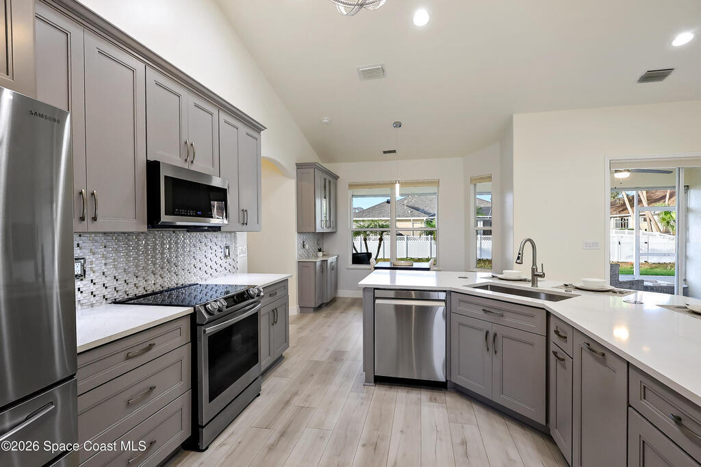 Tucked on a quiet cul-de-sac in the gated Oak Chase community in Vero Beach, this bright, modern home shines with an open floor plan, soaring ceilings, and abundant natural light. The beautifully updated kitchen--featuring quartz counters, soft-close cabinetry, and stainless-steel appliances--will inspire any home chef. Double split 4BR/3BA layout offers space and privacy. Unwind in the spacious primary suite with walk-out to lanai, walk-in closet, and spa-style wet room with tandem panel showers. Enjoy year-round entertaining on the screened lanai. Extras include a 2-car garage with epoxy floors and screen door, whole-home water purification, accordion shutters, and pre-wired for security system and portable generator. Centrally located!