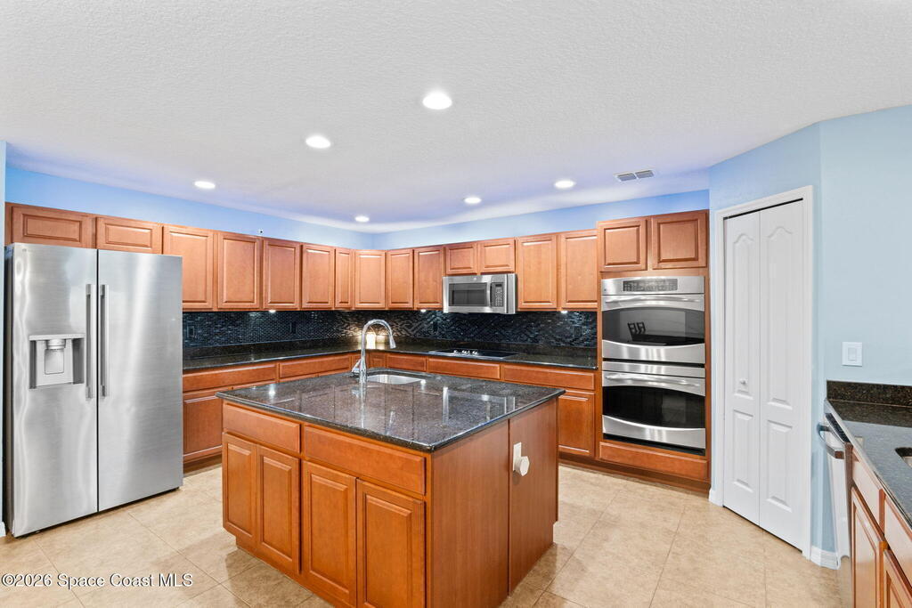 This home stands apart immediately thanks to its intentional layout & exceptional room sizes. With five bedrooms and five bathrooms, three bedrooms function as true master-style suites, each positioned for privacy and featuring its own full en-suite bathroom and walk-in closet. Every bedroom throughout the home is generously sized, eliminating the compromises often found in smaller homes.The first floor is thoughtfully designed for both daily living and entertaining. Anchoring the space is a remarkably large kitchen, offering two pantries, a highly sought-after dual wall oven setup, granite countertops, a prep island with sink, new backsplash, updated lighting, and a refrigerator just two months old. The scale of the kitchen is immediately evident, with abundant counter space and storage that comfortably supports large gatherings and busy households. The kitchen flows effortlessly into the dining and family room areas, creating a wide-open yet functional layout. The family room is