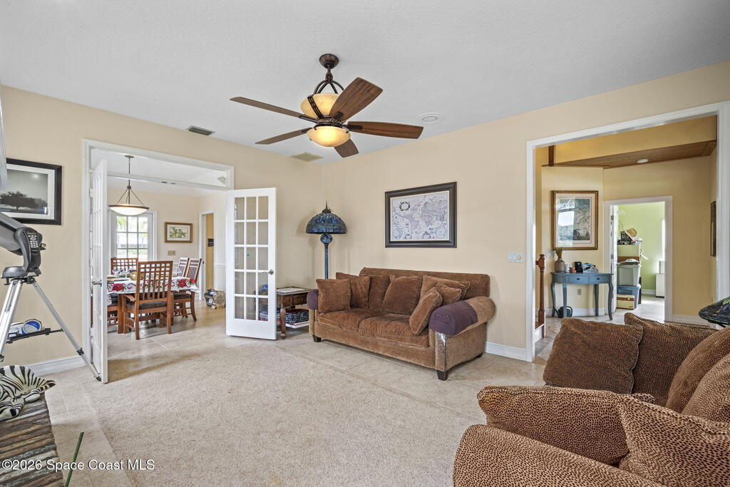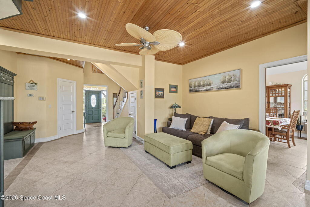 Tucked behind the guarded gates of Tortoise Island, this extraordinary waterfront estate commands approximately 120-feet of prime frontage along a 17-foot dredged canal, quietly asserting itself as one of the most significant offerings the community has seen in decades. With a newly reimagined dock and a private beach style shoreline, the property offers a level of boating access, scale, and permanence that discerning buyers often wait a lifetime to secure.The residence unfolds across more than 4,600 square feet of thoughtfully curated interior space, where timeless materials meet architectural volume. Tile flooring flows seamlessly throughout, complemented by soaring vaulted ceilings that create a sense of openness without sacrificing warmth. A private office anchors the front of the home, offering a refined workspace, while the primary living and dining areas extend naturally toward the water through French doors, dissolving the boundary between indoors and out.