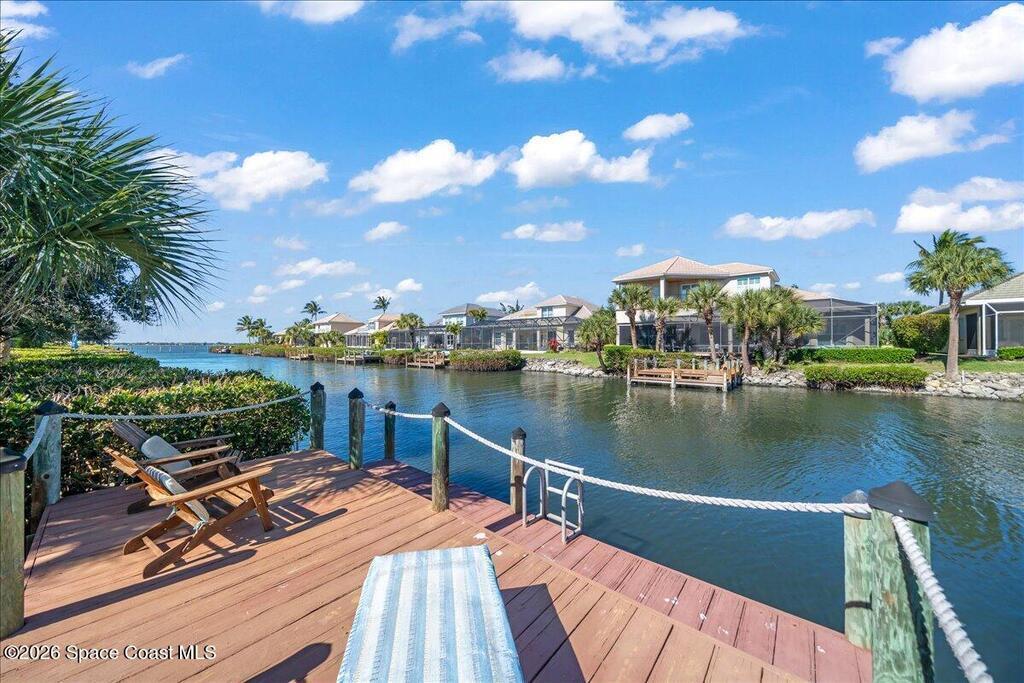 Elegant, larger, waterfront home in manicured, gated Indian Landing, an Ocean to River community in the nature rich zone of friendly Melbourne Beach. This home features 2 boat docks ! A deeded wet slip with a lift that will accommodate up to a 22' boat & one directly behind the home, which is perfect for soaking in our beautiful Florida skies over the water and launching kayaks, stand up paddle boards, etc into the open River at the end of the canal. A generous screened lanai features a sparkling, private, salt system pool and stand alone hot tub, as well as lots of covered area to enjoy some fresh, coastal air. User friendly floor plan highlighted by the primary suite + a 4th bedroom or office on the ground floor & an oversize bonus suite/ potential 5th bedroom + a balcony upstairs. Lots more to love here, so come on down.. the price is right!