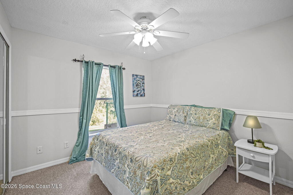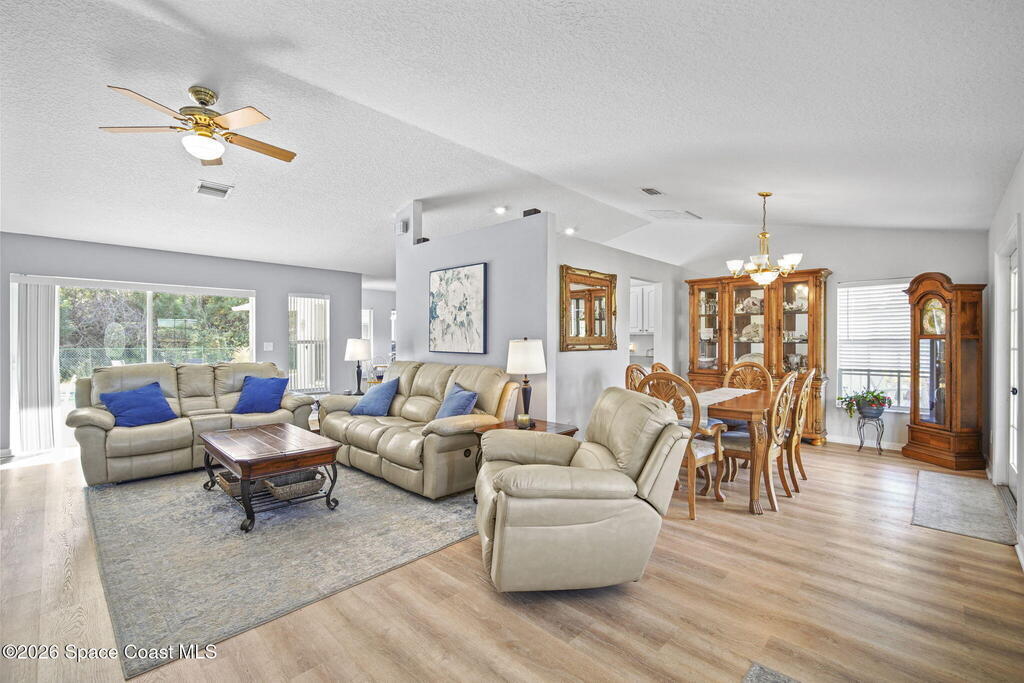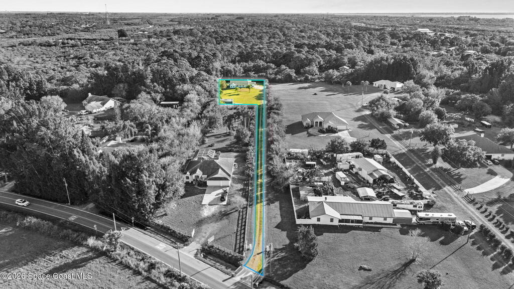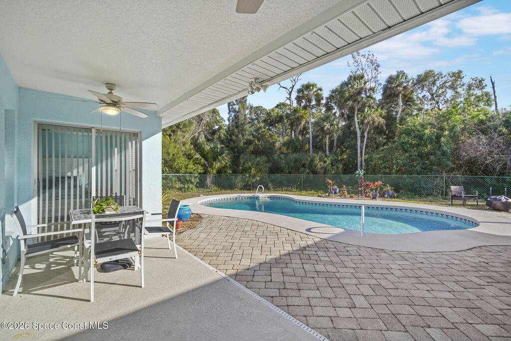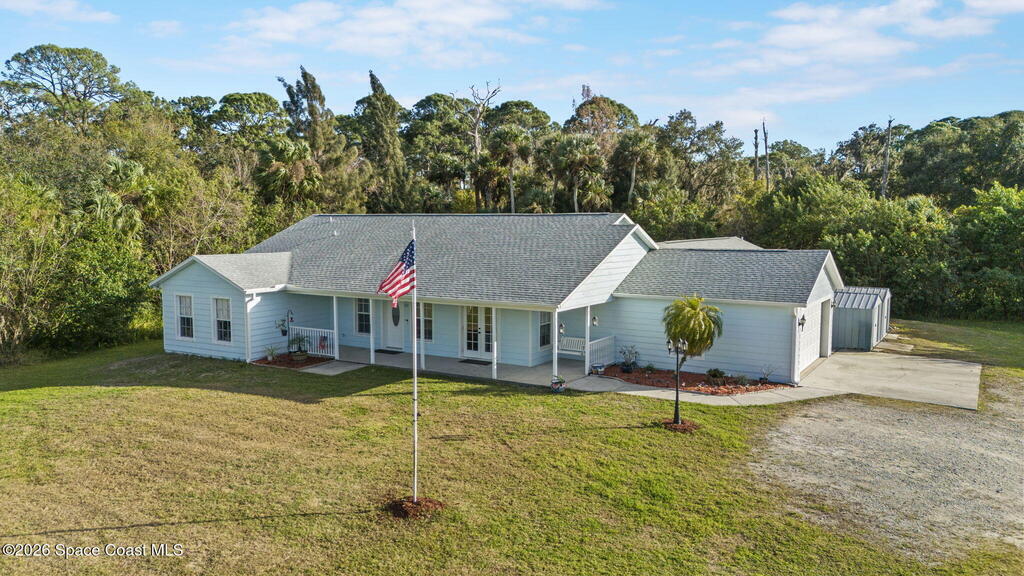 Beautifully situated residential home in a well-established N. Merritt Island neighborhood, offering a 1.5 acre lot with mature surroundings and wooded adjacent property that provides your own private back yard oasis . The level site is well suited for residential living and offers generous space for both indoor comfort and outdoor enjoyment.The property features a private drive with expansive outdoor living areas, including an open lanai with fenced in pool, multiple utility sheds and a additional 720 square foot detached garage with concrete slab - ideal for storage, workshop use, or additional recreational needs. The interior has an open floor plan with vaulted ceilings giving the space an open and airy feel making it perfect for entertaining. This three bed three bath has an attached mother in law suite / game room with a private bath and walk in closet giving you multiple options for living configuration and function. Roof and pool equipment 2 years old.
