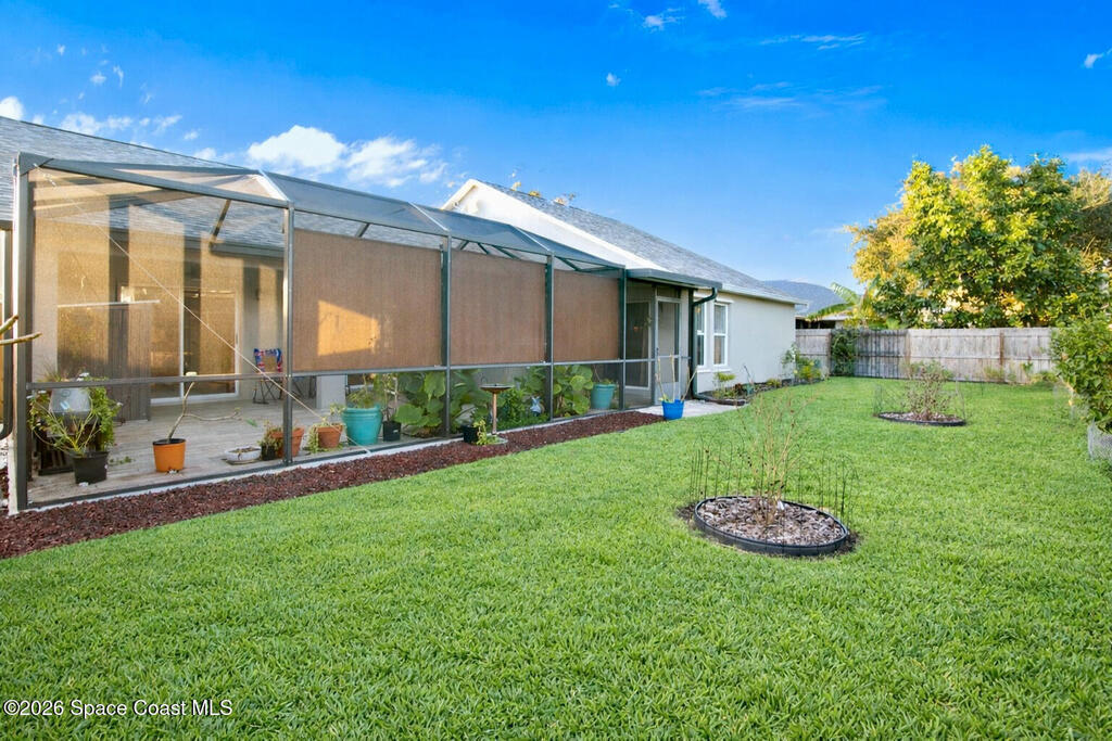 Comfort, style, and thoughtful upgrades come together in this over 2,000 sq ft home offering 3 bedrooms, 2 bathrooms, plus a versatile den - ideal for a home office, gym, or nursery. Located in the highly sought-after, deed-restricted Sunrise community of Suntree, this home combines comfort, convenience, and a quiet neighborhood setting.Thoughtfully updated throughout, highlights include all-new interior and exterior paint, a new smart thermostat, updated lighting and ceiling fans, and a new garage door opener with exterior keypad. The backyard has been completely refreshed with new sod, irrigation, fencing, fresh landscaping, and an added shed, creating a private outdoor retreat. The covered lanai features ceiling fans and privacy roll-up blinds (2025)--perfect for relaxing year-round.Enjoy easy access to Melbourne and Viera shopping and dining, with I-95 just minutes away, all while tucked into a peaceful, well-maintained community. *Virtual tour available*