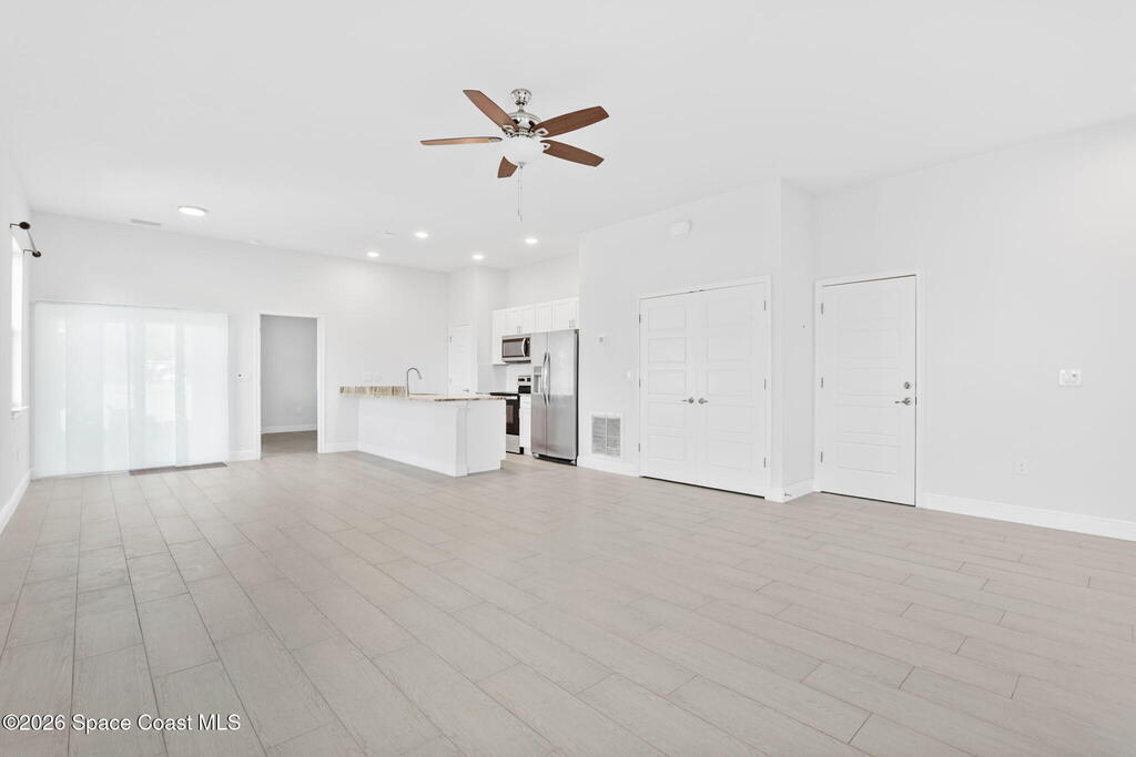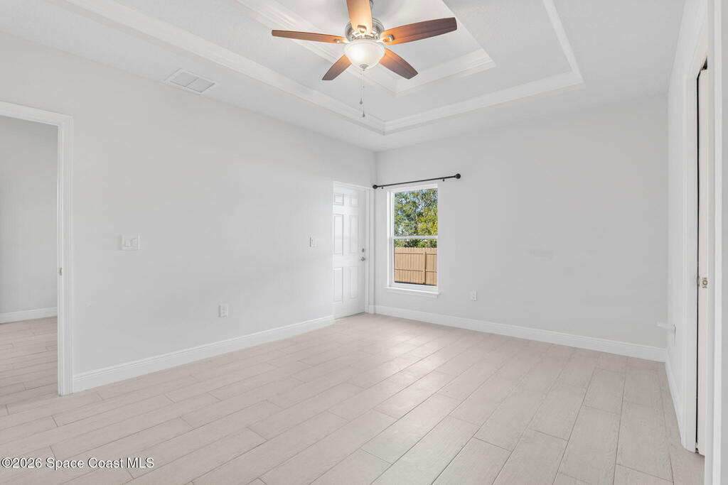 Built in 2022, this well-maintained single-level 3-bedroom, 2-bath home offers approximately 1,600 sq ft of modern, functional living space. The open-concept layout features tile flooring throughout the main living areas, recessed lighting, and a spacious kitchen with granite countertops, stainless steel appliances, ample cabinetry, and a large center island.The primary suite includes a tray ceiling, ceiling fan, private en-suite bath with dual granite vanities and a tiled walk-in shower, plus an adjoining sitting room/flex space ideal for a home office, nursery, or private retreat. Secondary bedrooms are well sized and versatile.Additional highlights include a dedicated laundry area, attached two-car garage, covered patio, and fully fenced backyard. Convenient Palm Bay location near shopping, dining, schools, and major roadways.
