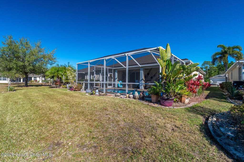 Immaculate and truly turnkey, this pristine pool home reflects exceptional care and pride of ownership throughout. Located in a gated community with HOA-maintained lawn and landscaping, the home features a newer roof and A/C, an upgraded kitchen with granite countertops, black stainless steel appliances, two pantries, and a center island, plus updated bathrooms with granite countertops. Enjoy a screened-in pool with water and amazing sunset views, a spacious entertaining patio, and a hot tub that conveys. The flexible layout includes three bedrooms plus an office or flex space. The primary suite offers dual closets and vanities, a water closet, and a large walk-in shower. Convenient access to Bayside Lakes Community Center. Extras included: hot tub, second refrigerator, washer, dryer, and crystal chandelier. Meticulously maintained and truly move-in ready with furnishings negotiable!