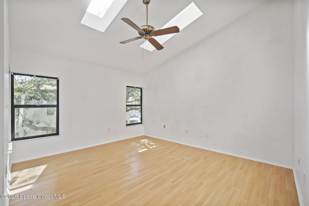 Perfect starter home or investment opportunity in Harbor Woods, Merritt Island! This two-bedroom, two full-bath condo offers an efficient, well-designed layout that lives larger than its square footage. Recently installed hurricane impact windows and a sliding glass door provide peace of mind and energy efficiency. The spacious primary suite features a walk-in shower and single-sink vanity. The main living area features vaulted ceilings accented by two beautiful skylights, creating a bright and open feel. The efficient galley-style kitchen includes a breakfast bar and newer appliances, while the indoor laundry room comes complete with a washer and dryer. Enjoy views from the dining area through the screened lanai overlooking the community pool in the distance. Additional updates include a newer A/C and water heater (2020). Condo fees cover water, cable/internet, and all exterior maintenance. Harbor Woods is a well-managed community. Schedule your showing today!