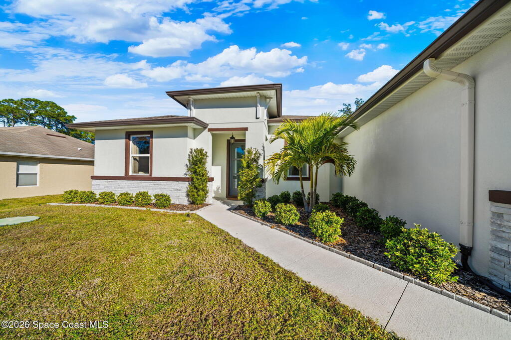 5K towards buyers closing cost! Built in 2021, this energy-efficient concrete block home offers 3 bedrooms, 2 bathrooms, and 1,727 sq ft of modern living on city water in Palm Bay. The open floor plan is enhanced by 9'4'' ceilings and luxury vinyl plank flooring throughout--no carpet--creating a bright and spacious feel. The kitchen features 42'' cabinetry, quartz countertops, and stainless steel appliances, flowing effortlessly into the main living and dining areas, perfect for everyday living and entertaining.Designed with energy efficiency in mind, this home offers newer construction standards that help keep utility costs low while maintaining year-round comfort. The primary suite is a true retreat with a tray ceiling, large walk-in closet, dual sinks, and a beautifully tiled walk-in shower filled with natural light from the transom window. Both bathrooms feature quartz countertops for a cohesive, upscale look.