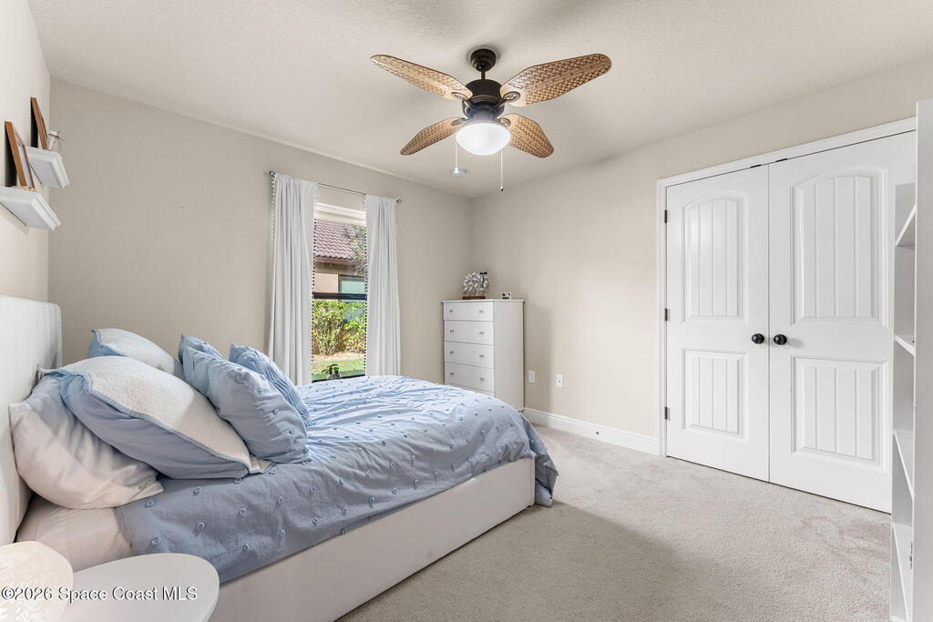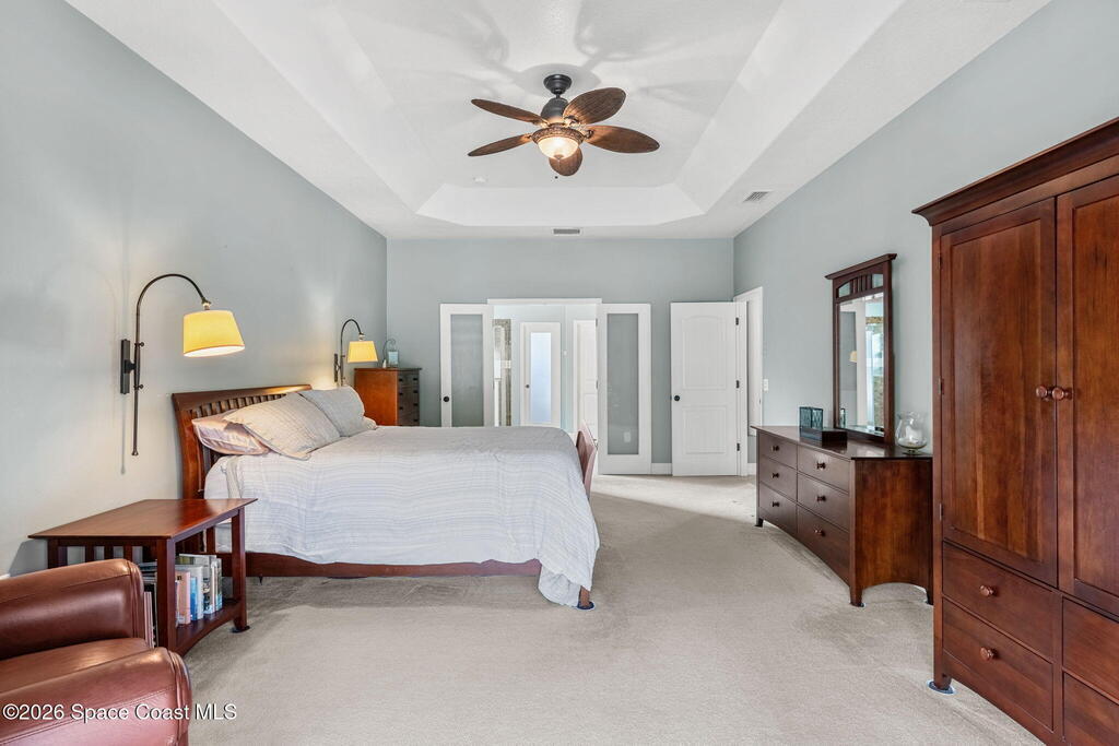 Sunlight, space, and a backyard built for real living define this home from the moment you step inside. Open living and dining areas flow effortlessly beneath coffered ceilings and architectural columns, grounded by continuous tile floors and framed by outdoor views that pull the outside in. The kitchen keeps pace with everyday life and large gatherings alike, centered around a generous granite island, staggered maple cabinetry, double ovens, and a walk-in pantry that supports serious hosting. The primary suite feels quietly indulgent with French doors opening straight to the lanai, a tray ceiling overhead, a spa-inspired bath with jetted tub and walk-in shower, and a walk-in closet washed in natural light. A smart split-bedroom layout adds real-world function, pairing two secondary bedrooms with a full bath while a third secondary bedroom sits near another full bath that also serves as the pool bath, keeping guests comfortable and outdoor days seamless.