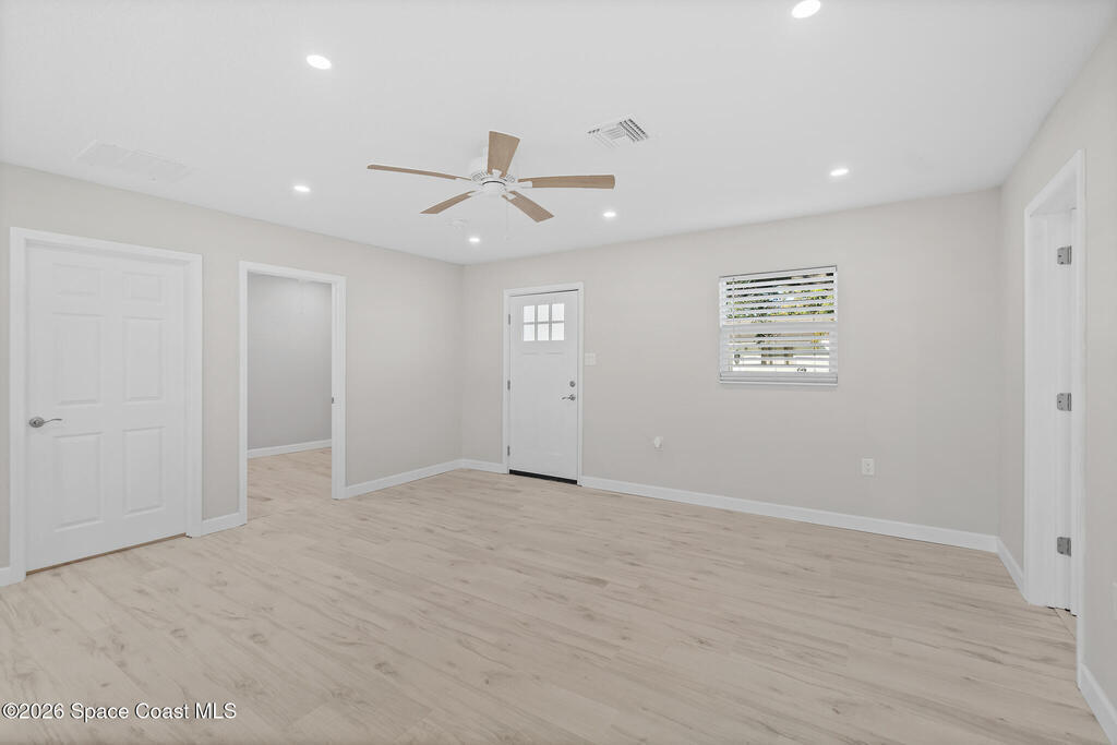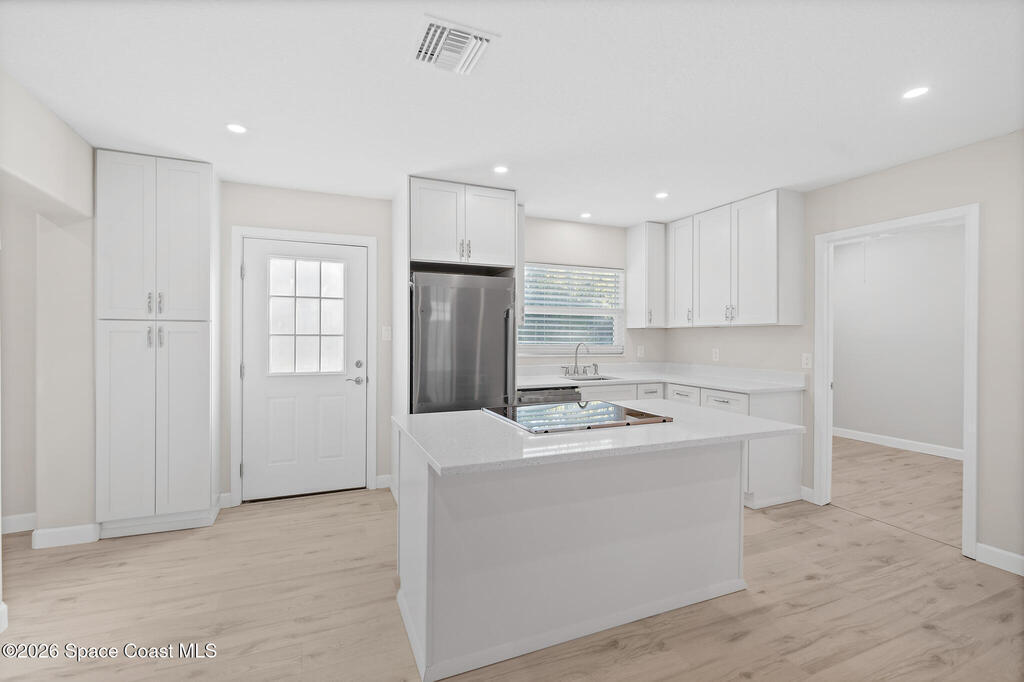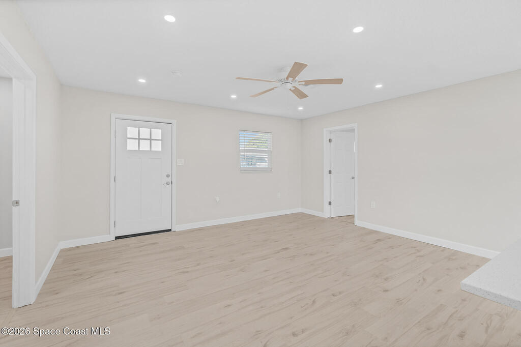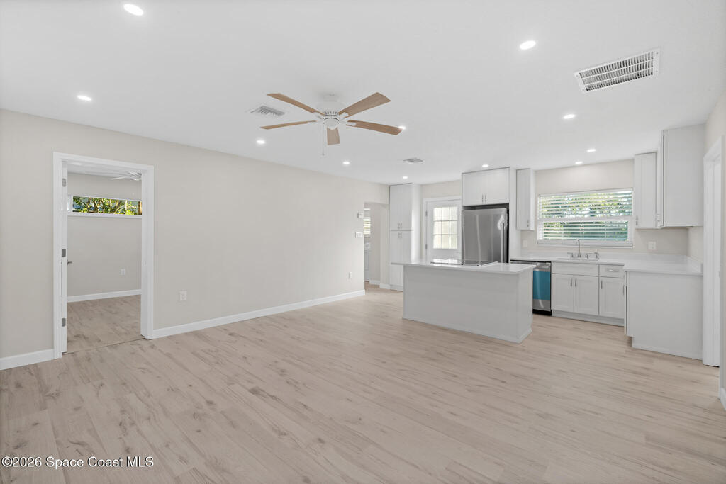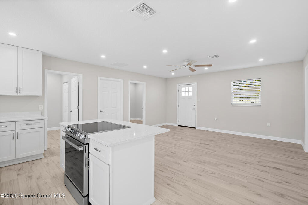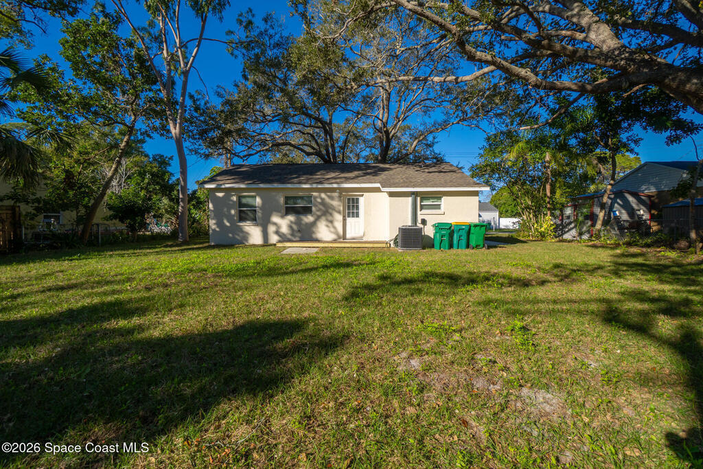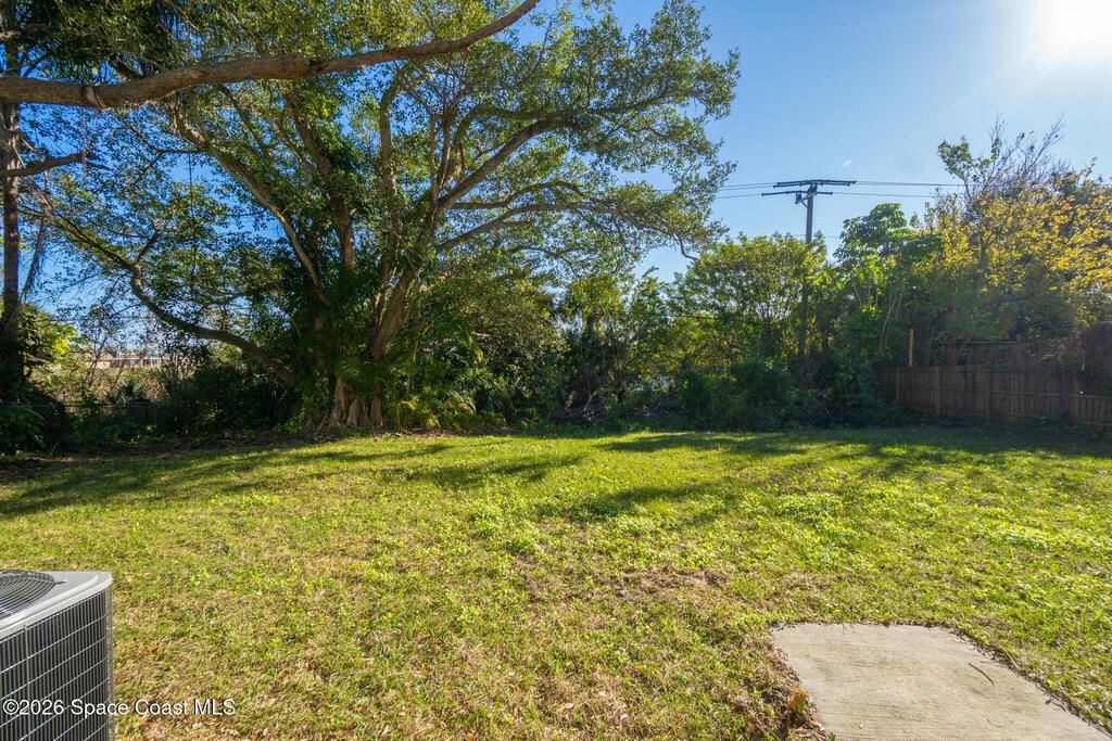 Discover this COMPLETELY RENOVATED 3-bedroom, 1.5-bathroom home, where every detail has been thoughtfully updated for modern living. This fully remodeled residence features a brand-new roof (12/2024), 2025 HVAC & water heater, stainless steel appliances, electrical panel, wood-look vinyl flooring, and beautifully renovated bathrooms.Enjoy the open-concept kitchen with island flowing seamlessly into the living room--perfect for entertaining and family gatherings. Nestled on a private lot surrounded by majestic oak trees and tropical landscaping, relax on the back deck with peaceful pond views and no direct backyard neighbors. A concrete pad in the side yard is ideal for a carport, patio, or grilling area.Whether you're a first-time buyer or seeking your forever home, this turnkey property offers contemporary comfort with natural beauty and NO HOA! Centrally-located in desirable Merritt Island with easy access to beaches, shopping, and dining. Don't miss this rare opportunity!