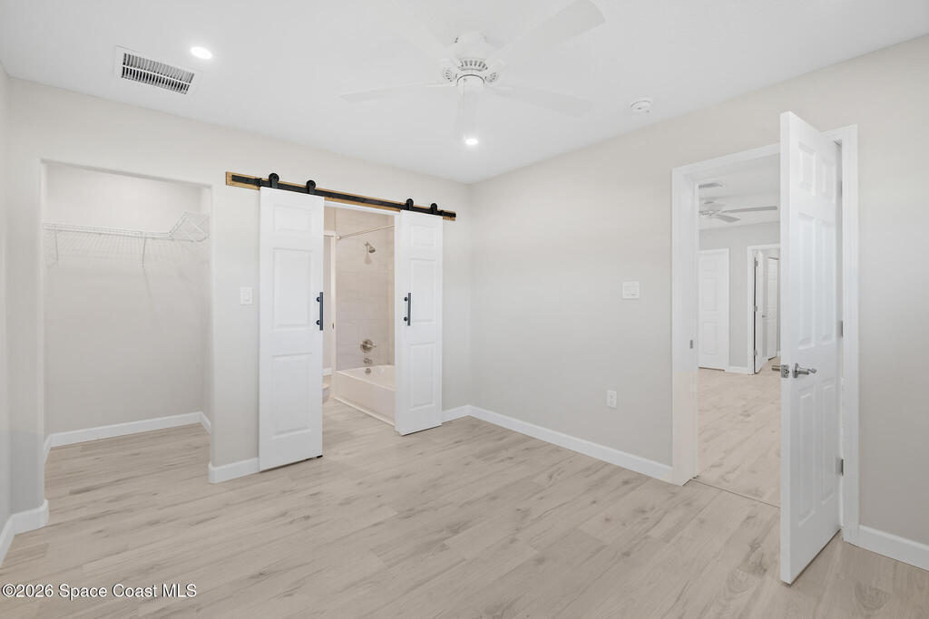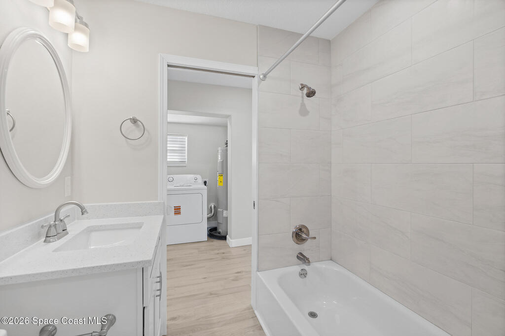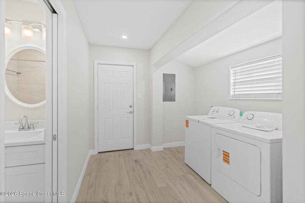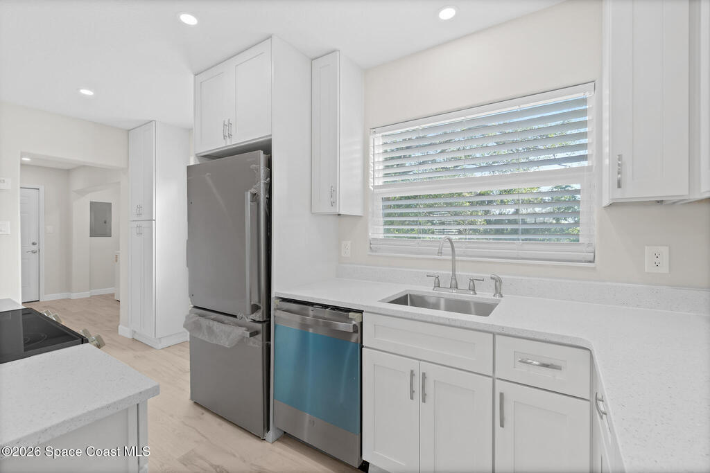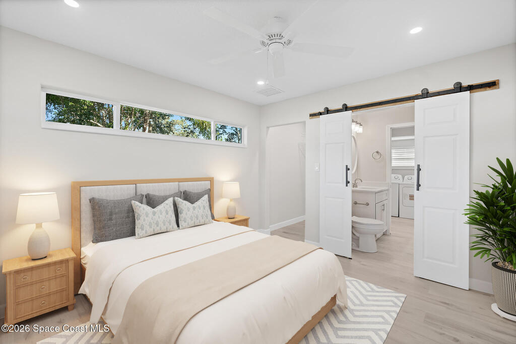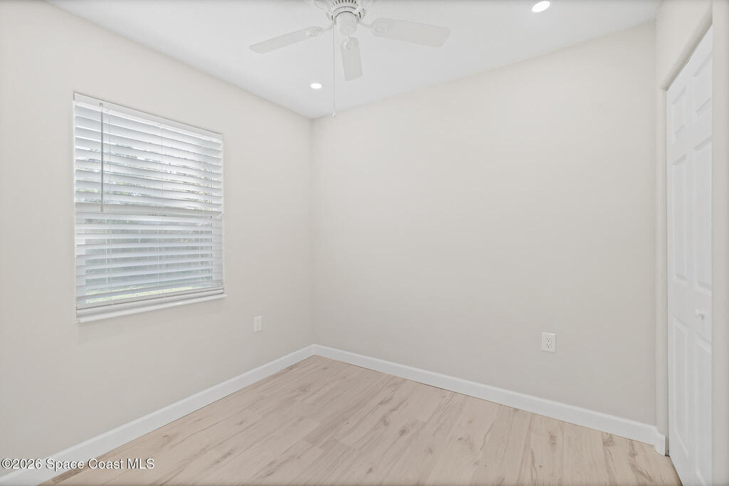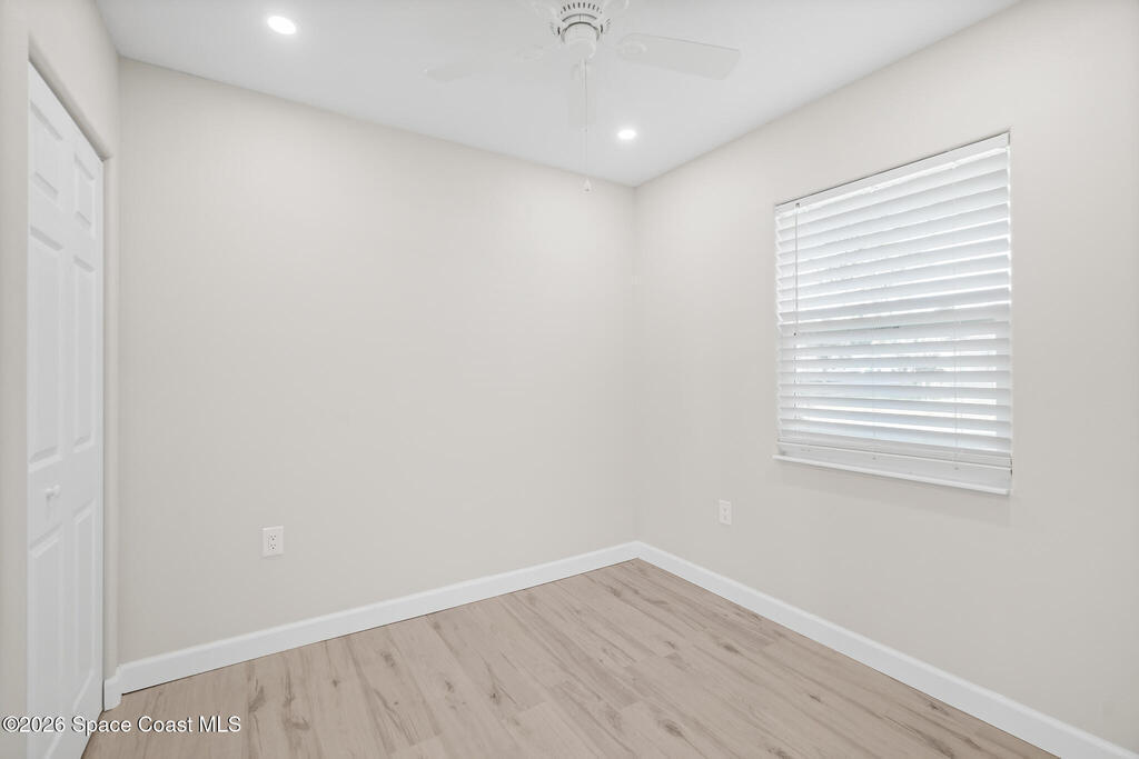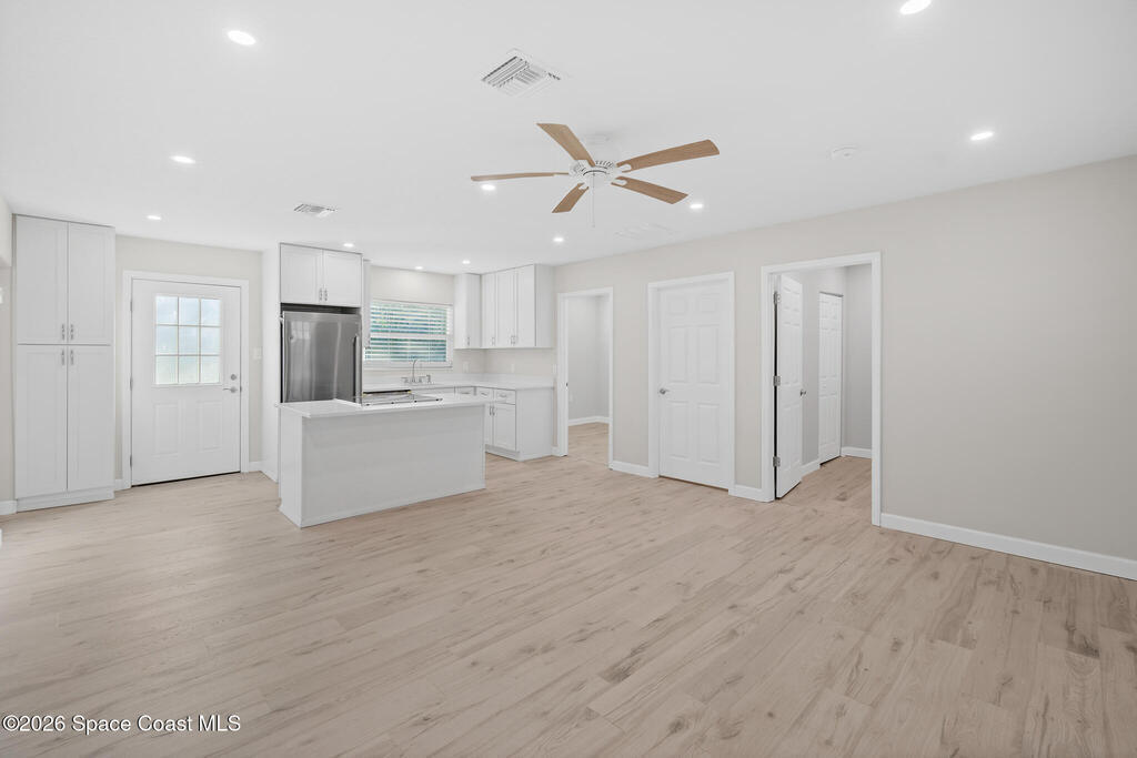 Discover this COMPLETELY RENOVATED 3-bedroom, 1.5-bathroom home, where every detail has been thoughtfully updated for modern living. This fully remodeled residence features a brand-new roof (12/2024), 2025 HVAC & water heater, stainless steel appliances, electrical panel, wood-look vinyl flooring, and beautifully renovated bathrooms.Enjoy the open-concept kitchen with island flowing seamlessly into the living room--perfect for entertaining and family gatherings. Nestled on a private lot surrounded by majestic oak trees and tropical landscaping, relax on the back deck with peaceful pond views and no direct backyard neighbors. A concrete pad in the side yard is ideal for a carport, patio, or grilling area.Whether you're a first-time buyer or seeking your forever home, this turnkey property offers contemporary comfort with natural beauty and NO HOA! Centrally-located in desirable Merritt Island with easy access to beaches, shopping, and dining. Don't miss this rare opportunity!