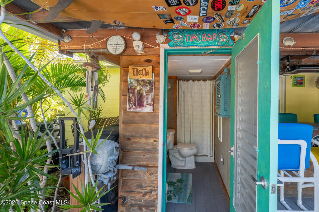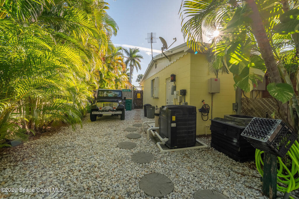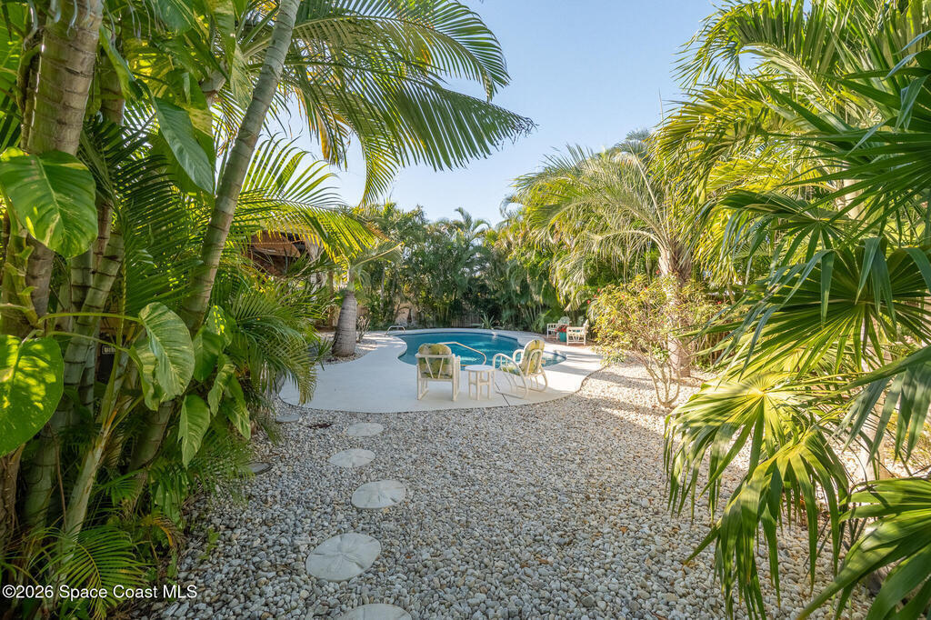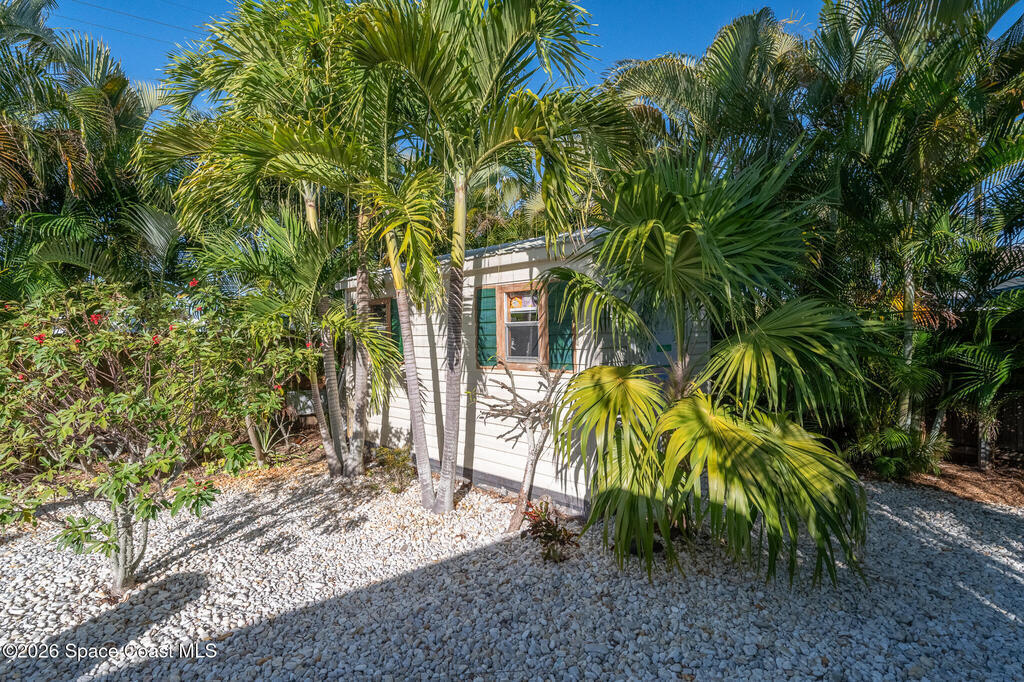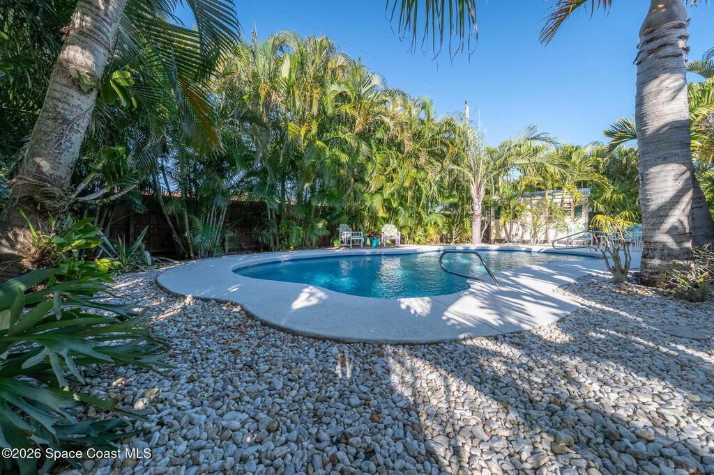 Bulletproof Satellite Beach 3/2 Pool Home. Just a 1,700-foot walk to the beach. CBS construction, 2021 standing seam metal roof secured with clips and straps, impact windows, and hurricane shutters. Energy efficiency with solar installed in 2021, average electric bill $27 per month, 14 SEER AC system, 200-amp service, and PVC Schedule 40 plumbing--no cast iron. Annual home insurance is $2,100. Enjoy outdoor living with a 2009 Aqua Blue pool, electric pool heater, insulated pool cover, new timer and pump, and a plastic/recycled patio deck with an epoxy-finished outdoor bar. The entire property is professionally rocked (no grass), and the fully fenced backyard offers privacy. This home has dedicated RV/boat parking with 30-amp electric and sewer hookups, plumbed with natural gas, new gutters, and polished terrazzo flooring throughout. City water and sewer. One hour from Orlando International Airport and Disney attractions. This is a rare, storm-hardened, energy-efficient coastal retreat.
