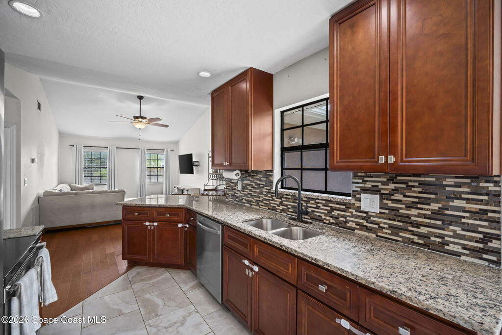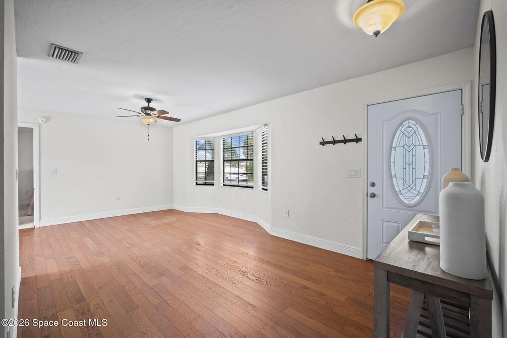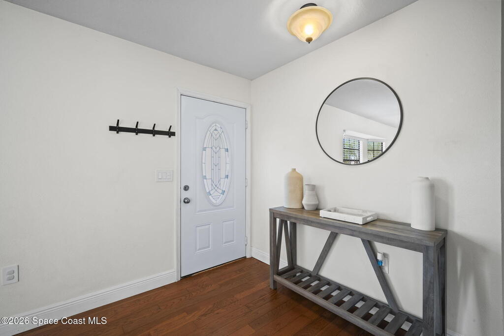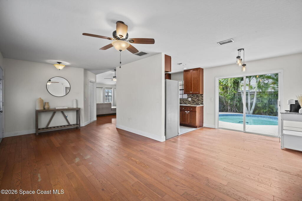 Three Bedroom, 2 Bathroom pool home on City/Sewer in Palm Bay! 408 Crystamist has notable features including updated kitchen, bathrooms, flooring, AC and pool pump. It features an open floor plan with great lighting throughout. Walk-in closets in each bedroom. REAL Hardwood floors, stainless steel appliances, updated cabinets and granite countertops. Completely fenced backyard with mature tropical landscaping and custom lattice. The back yard is perfect for a family that loves the outdoor Florida lifestyle. Transferable termite bond for preventative measures only. It is only minutes from all major amenities, but feels far enough where you are not in the day to day rush. Schedule your showing today.