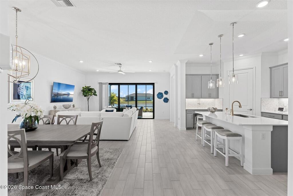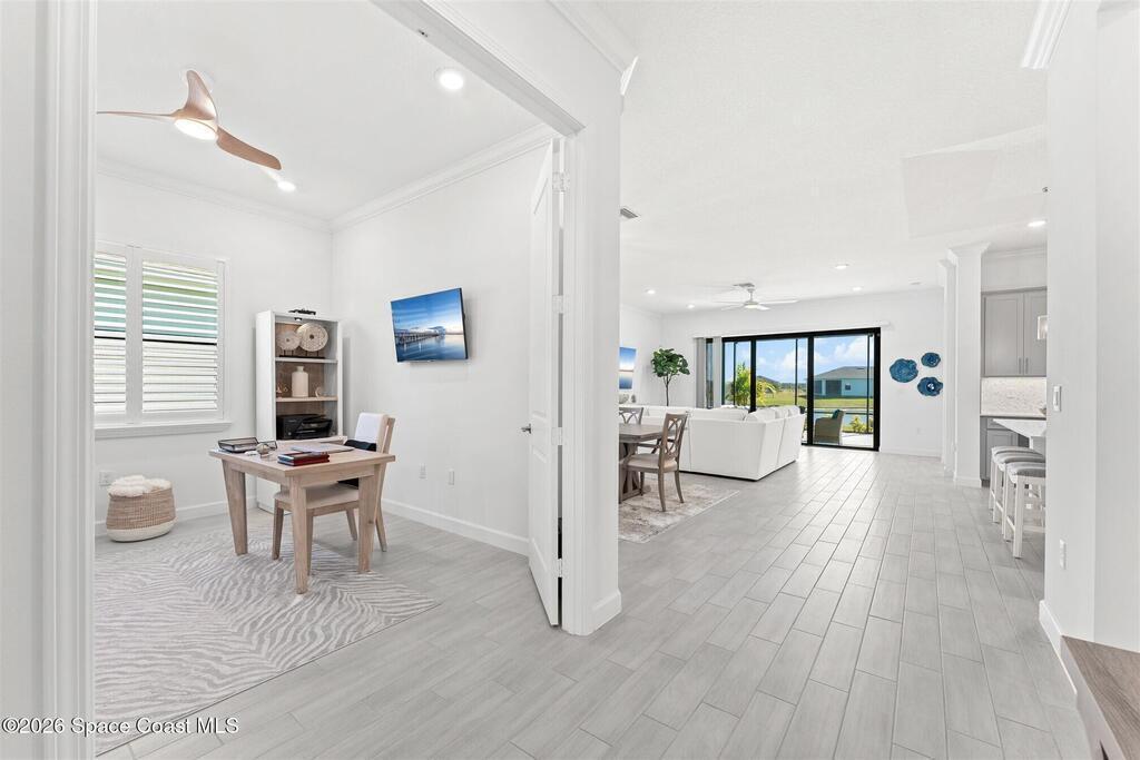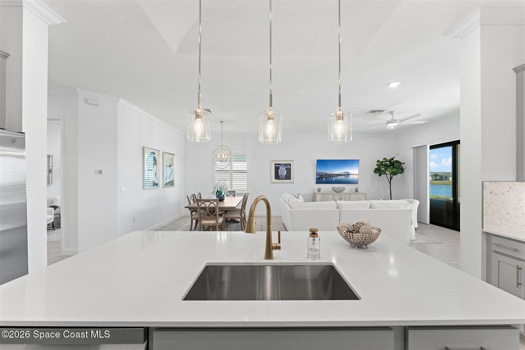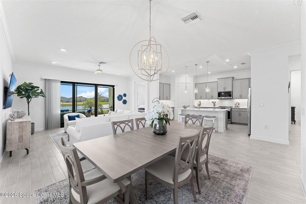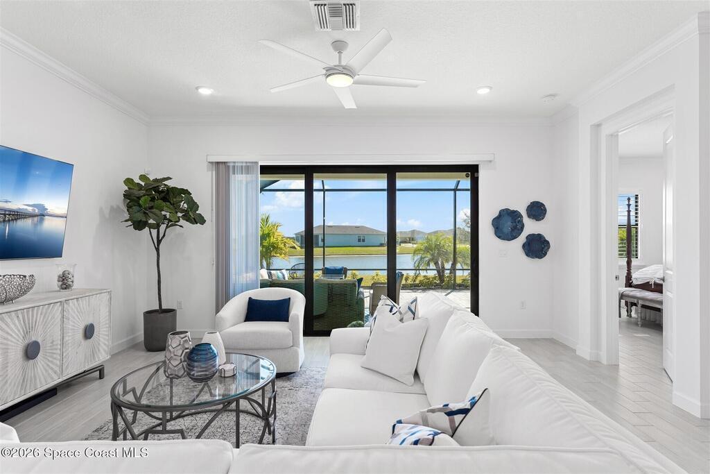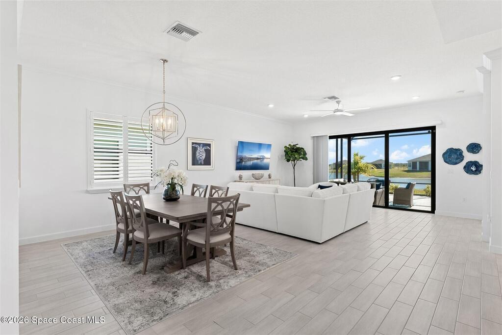 Waterfront, model home inspired, 3 bedroom plus den, 3 bath sophia plan in Bridgewater, Viera's resort style 55+ gated community! This stunning 3-year-old home is meticulously decorated in the popular palette of grays and whites and has every option: IMPACT WINDOWS & TRIPLE SLIDER, plank tile throughout, plantation shutters, crown molding, 8' doors, designer lighting, epoxy garage floors, and water filtration! The kitchen has a unique chamfered tray ceiling and is complete with upgraded appliances, a custom pantry and a gorgeous backsplash that highlights the gold toned faucet and cabinet pulls! One bedroom is an en-suite for those special overnight guests! Owner's suite has huge walk-in w/custom built-ins. Enjoy the lake views from the expanded screened lanai! Bridgewater's breathtaking private clubhouse has a heated pool & spa, fitness center, billiards room, lighted pickleball & tennis courts, and even a movie theater! Close to the ocean beaches, cruise ports, shopping and dining!