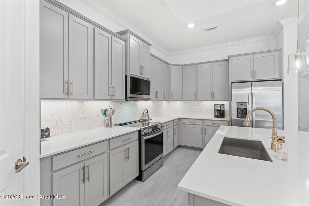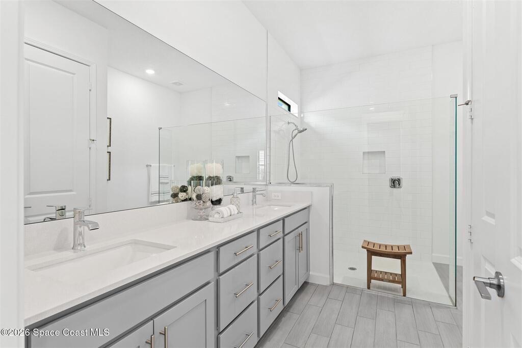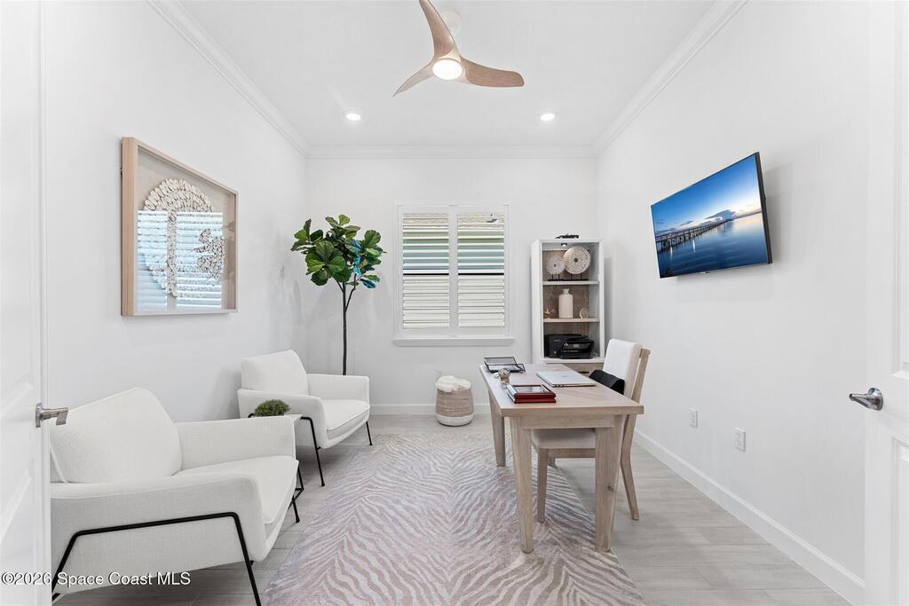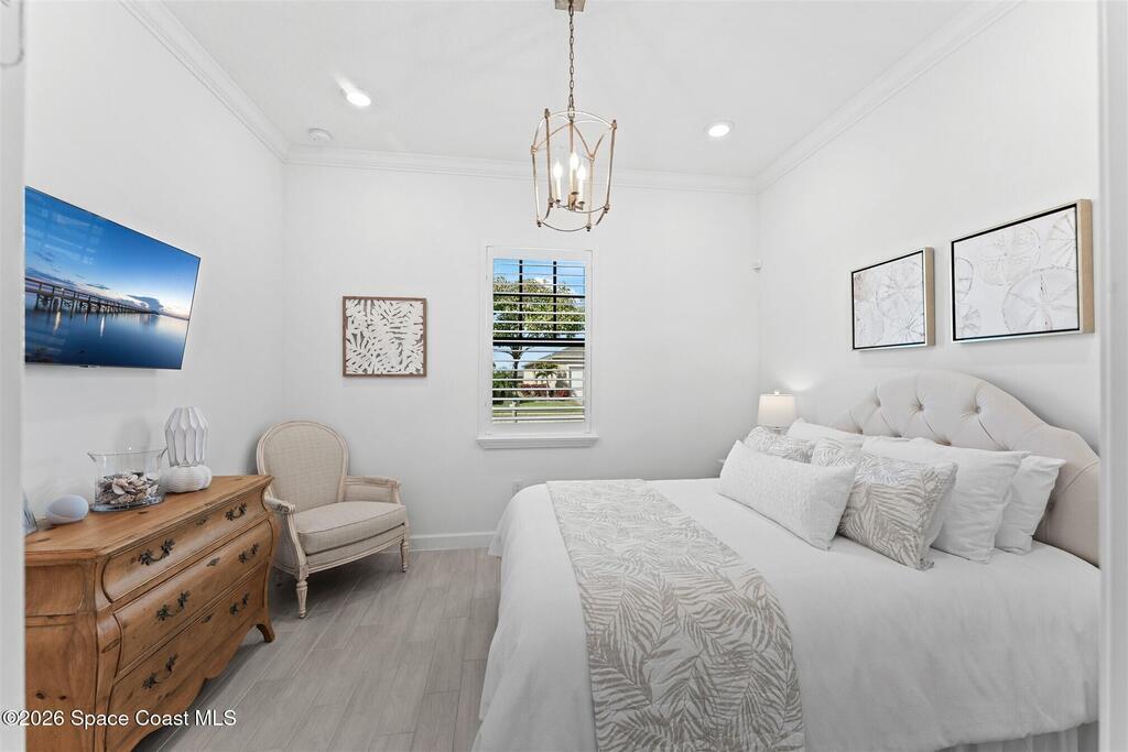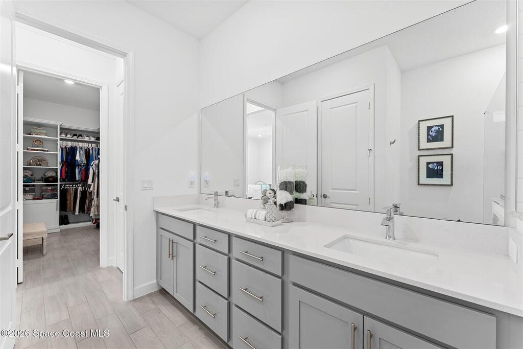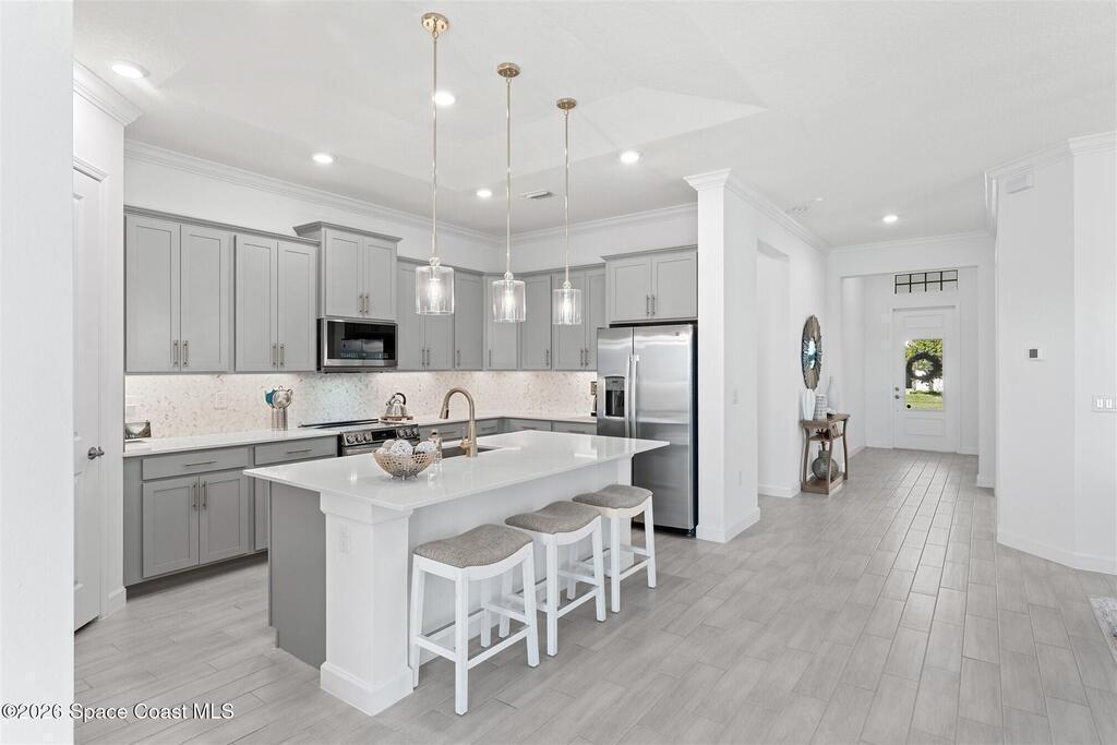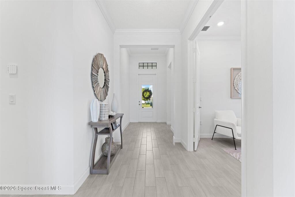 Waterfront, model home inspired, 3 bedroom plus den, 3 bath sophia plan in Bridgewater, Viera's resort style 55+ gated community! This stunning 3-year-old home is meticulously decorated in the popular palette of grays and whites and has every option: IMPACT WINDOWS & TRIPLE SLIDER, plank tile throughout, plantation shutters, crown molding, 8' doors, designer lighting, epoxy garage floors, and water filtration! The kitchen has a unique chamfered tray ceiling and is complete with upgraded appliances, a custom pantry and a gorgeous backsplash that highlights the gold toned faucet and cabinet pulls! One bedroom is an en-suite for those special overnight guests! Owner's suite has huge walk-in w/custom built-ins. Enjoy the lake views from the expanded screened lanai! Bridgewater's breathtaking private clubhouse has a heated pool & spa, fitness center, billiards room, lighted pickleball & tennis courts, and even a movie theater! Close to the ocean beaches, cruise ports, shopping and dining!