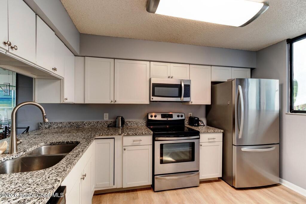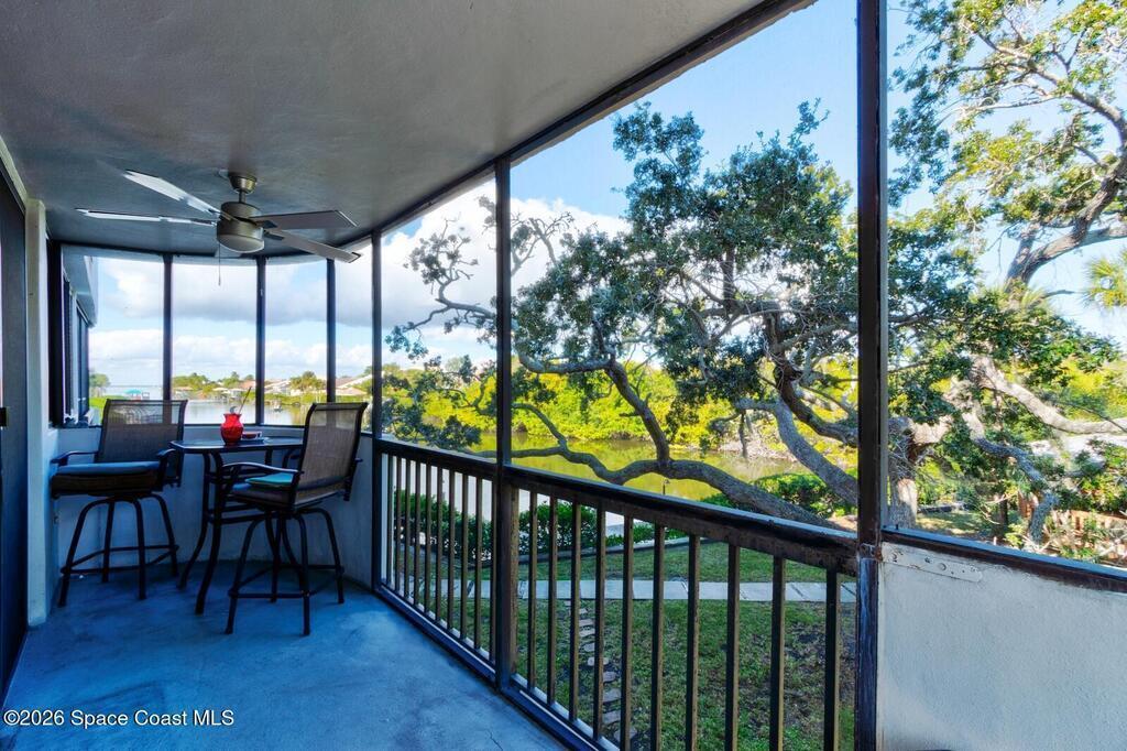 Experience relaxed waterfront living in this well-maintained two-bedroom, two-bath condo offering tranquil canal and riverfront surroundings in a gated community designed for boaters and nature lovers. This unit has been thoughtfully improved and is move-in ready, combining comfort, functionality, and long-term value. Inside, the residence features durable luxury vinyl plank flooring throughout, updated ceiling fans, and a bright, open living and dining area that flows seamlessly to a spacious wrap-around screened porch. The porch wraps two sides of the unit and provides peaceful water views, ideal for morning coffee, evening sunsets, or entertaining guests. The kitchen is equipped with granite countertops, stainless steel appliances, an electric range, garbage disposal, and updated shaker-style cabinetry, offering both style and practicality. An interior laundry room includes a full-size washer and dryer, conveniently located within the unit.