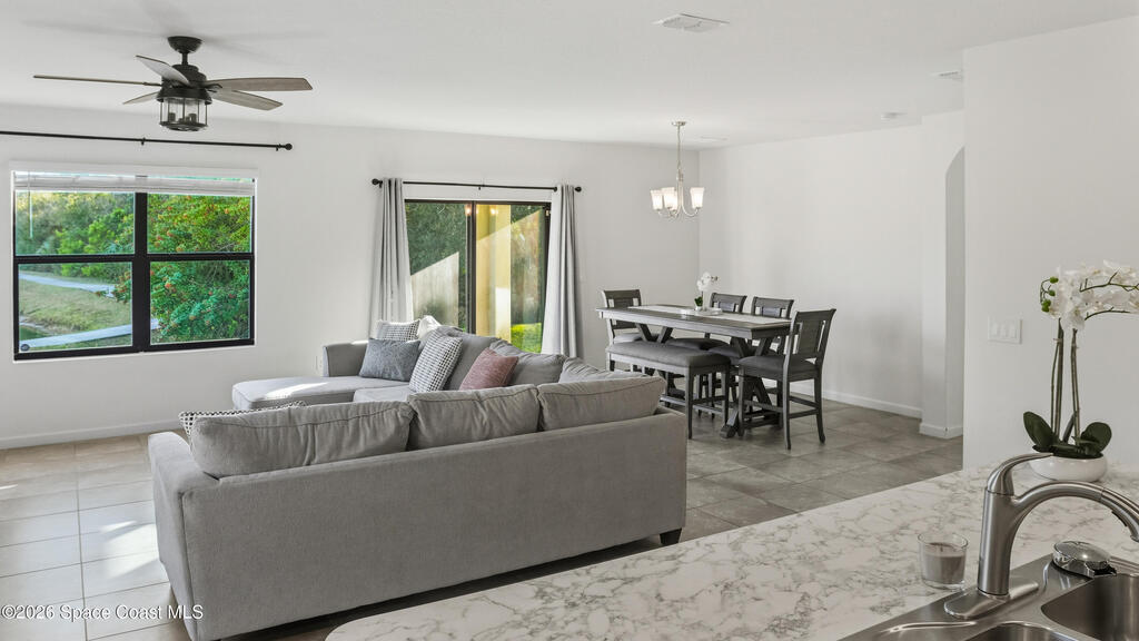 Relax on your covered lanai with serene waterfront views and effortless Florida living, or take the nearby walking trail that leads directly to the community pool and playground. The spacious kitchen is designed for both everyday living and entertaining, featuring a large center island, walk-in pantry, and seamless flow into the dining and living areas. The private owner's suite offers a generous layout, a double-vanity bath, and an oversized walk-in closet. Three additional bedrooms and a full guest bath provide plenty of space and flexibility. Ceiling fans throughout the bedrooms and living area add comfort, while the garage includes a built-in storage system for optimal organization. The home is pre-wired for smart technology and a security system. Outside, the lawn showcases new sod and an economical irrigation system powered by its own well. Adamson Creek offers convenient access to I-95, Cape Canaveral, and local beaches, and is 30 minutes from Orlando International Airport.