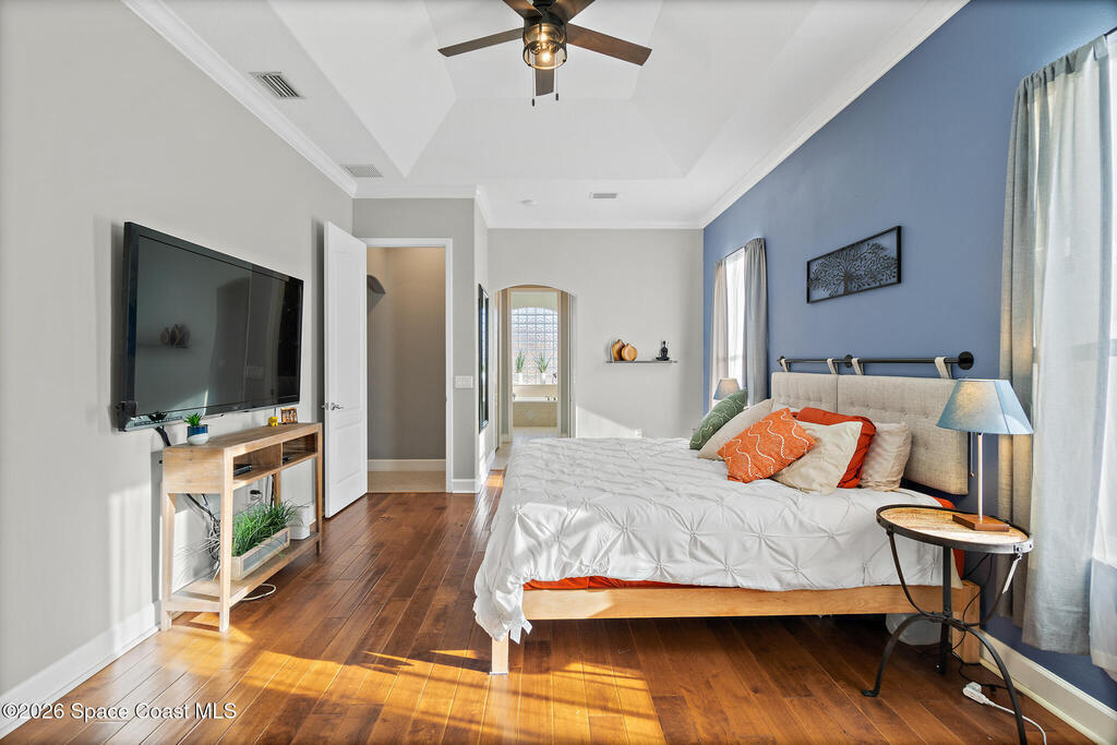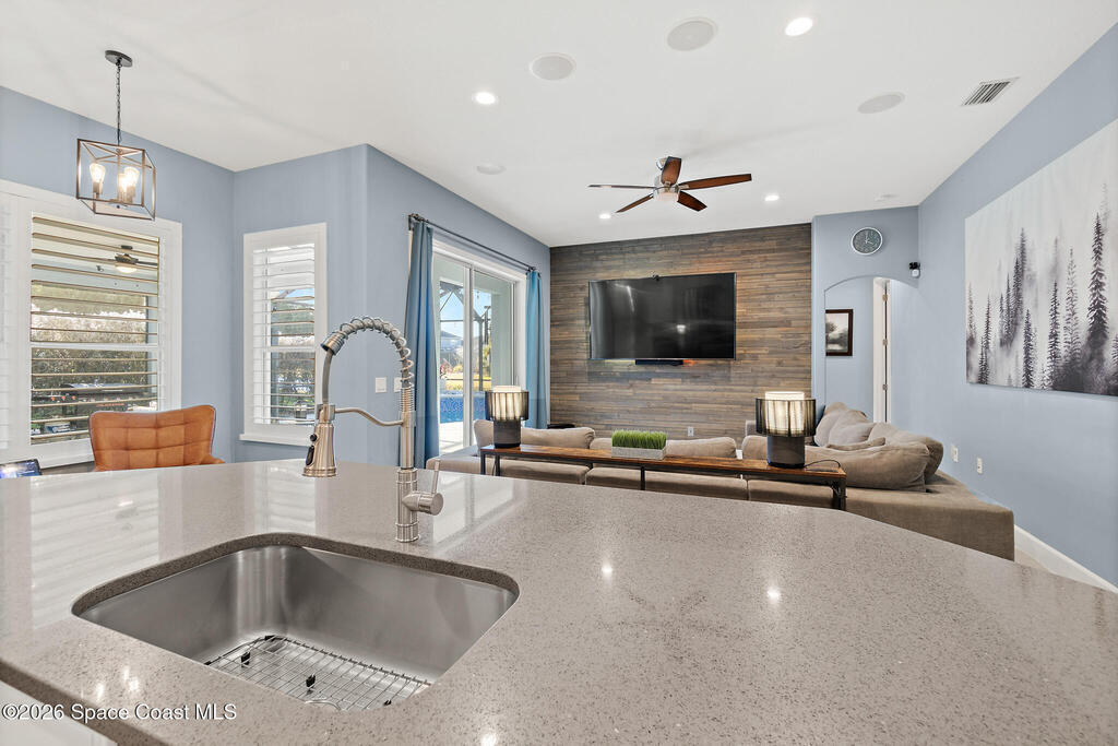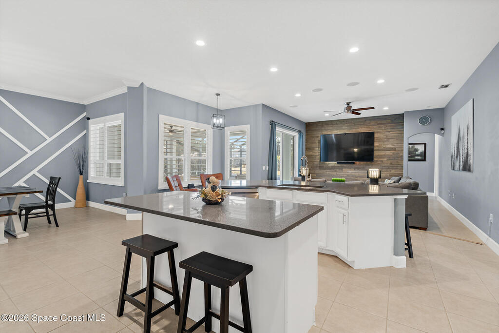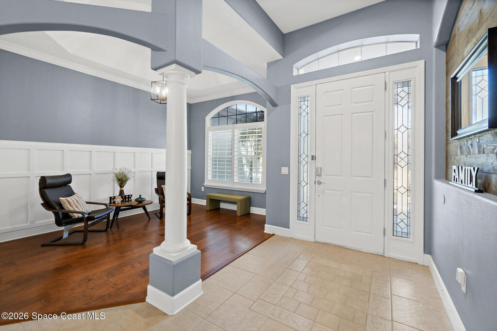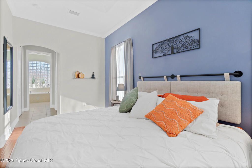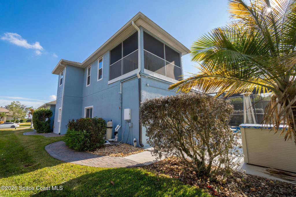 Transferable VA loan--ask for details on the approx. 2.75% INTEREST RATE! Welcome to this beautifully updated, lakefront pool home located in the gated Sunstone community of Viera. This 4-bedroom, 3-bath home with an upstairs BONUS ROOM blends timeless design with modern updates throughout. Recent improvements include fresh interior and exterior paint, an updated kitchen, and a recently resurfaced saltwater, solar-heated pool, creating a truly move-in-ready home. The open floor plan is filled with natural light and features tray ceilings, crown molding, 8-foot doors, and generous living spaces ideal for everyday living and entertaining. The oversized primary suite offers a sitting area perfect for a home office or flex space, dual walk-in closets, and a spa-style bath. Step outside to a screened lanai with a saltwater, solar-heated pool, summer kitchen, and tranquil lake views. Notable updates include roof (2018), upstairs A/C (2020), and downstairs A/C (2025).
