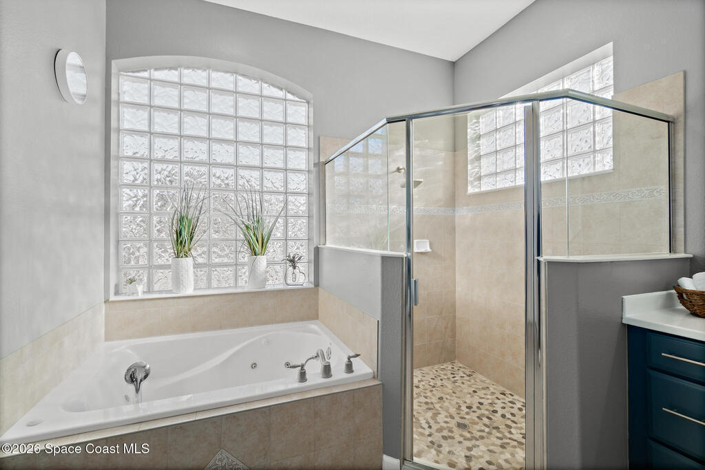 Breakfast Bar , Built-in Features , Ceiling Fan(s) , His and Hers Closets , Primary Bathroom - Tub with Shower , Primary Downstairs , Vaulted Ceiling(s)