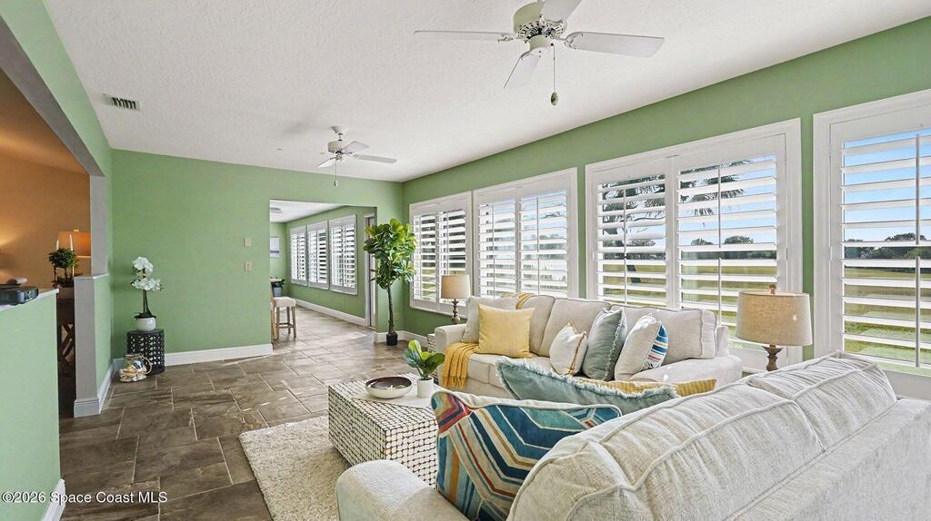 Located in a resort-style country club community offering top-notch amenities for an exceptional Florida lifestyle, this lovely remodeled, light-filled extended Raleigh model features stunning golf course and water views. Vaulted ceilings and an open floor plan create an inviting atmosphere, with formal living and dining areas plus an expansive Florida room and bonus space--perfect for relaxing or entertaining. Porcelain tile runs throughout the home, complemented by luxury blinds.The kitchen overlooks the living and dining areas and captures the beautiful views, offering a cozy breakfast nook and abundant cabinetry. Indoor laundry adds everyday convenience. The spacious primary suite features his-and-her walk-in closets, a double vanity, and a beautifully tiled walk-in shower.A charming front courtyard provides private outdoor
