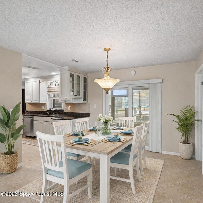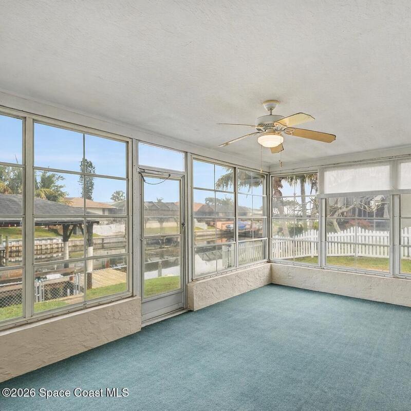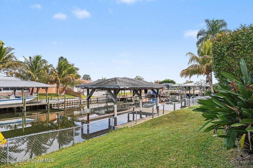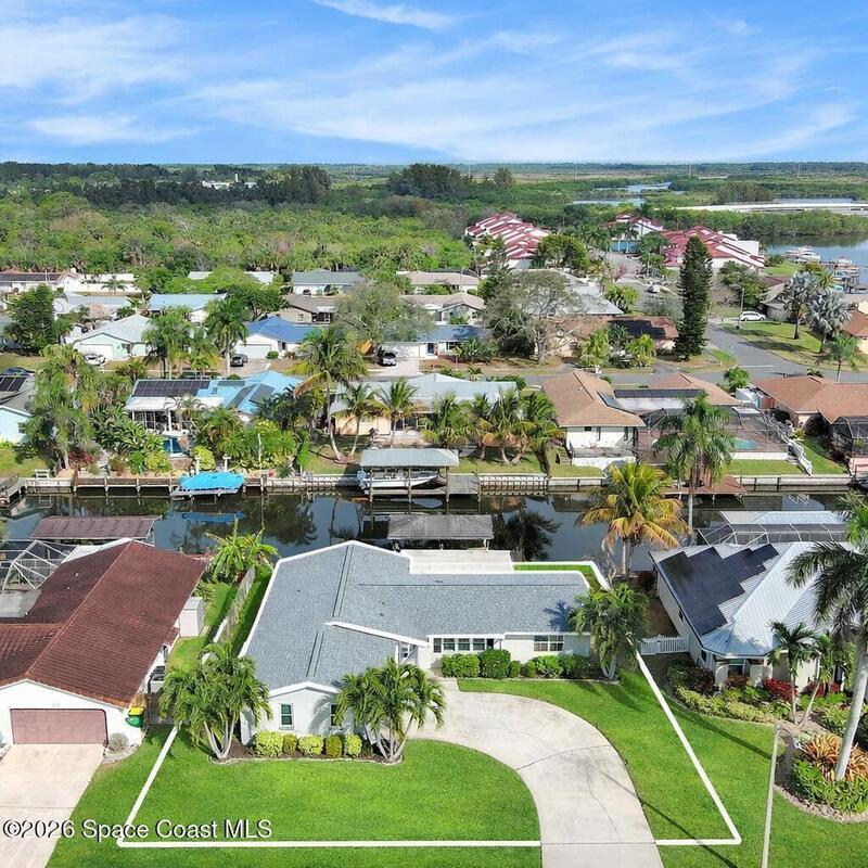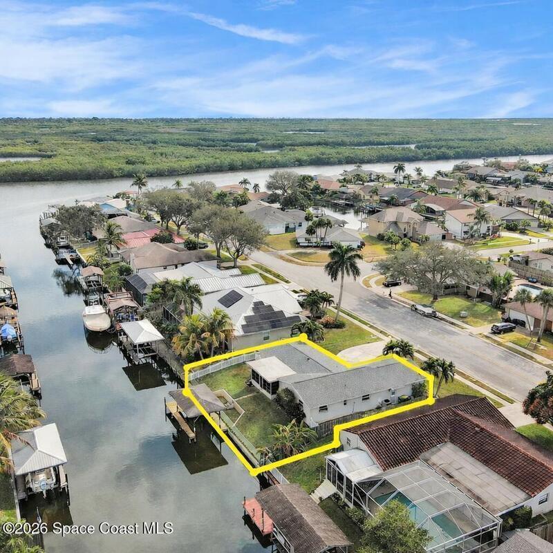 How do I love thee? Count all the ways you will LOVE this home. Impact windows and doors throughout. NEW ROOF in 2023, remodeled bathrooms and kitchen. Solid wood cabinets in the kitchen with built-in wine rack for entertaining. Plantation shutters in front windows, interior laundry room with pantry, first floor primary bedroom. 3 bedrooms and 2 bathrooms make it a perfect home! The WATERFRONT landscaped backyard creates a peaceful retreat, ideal for morning coffee or evening unwinding on the enclosed back porch. Additionally, this house features a large driveway and 2 car garage. Central to Blue Origin, Space X, NASA, Port Canaveral and beaches. So much to LOVE!