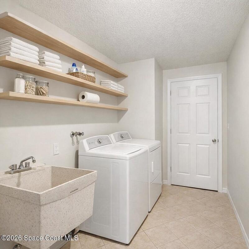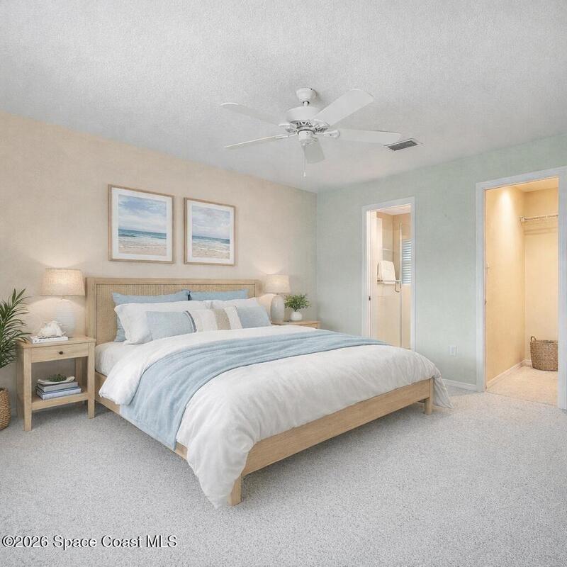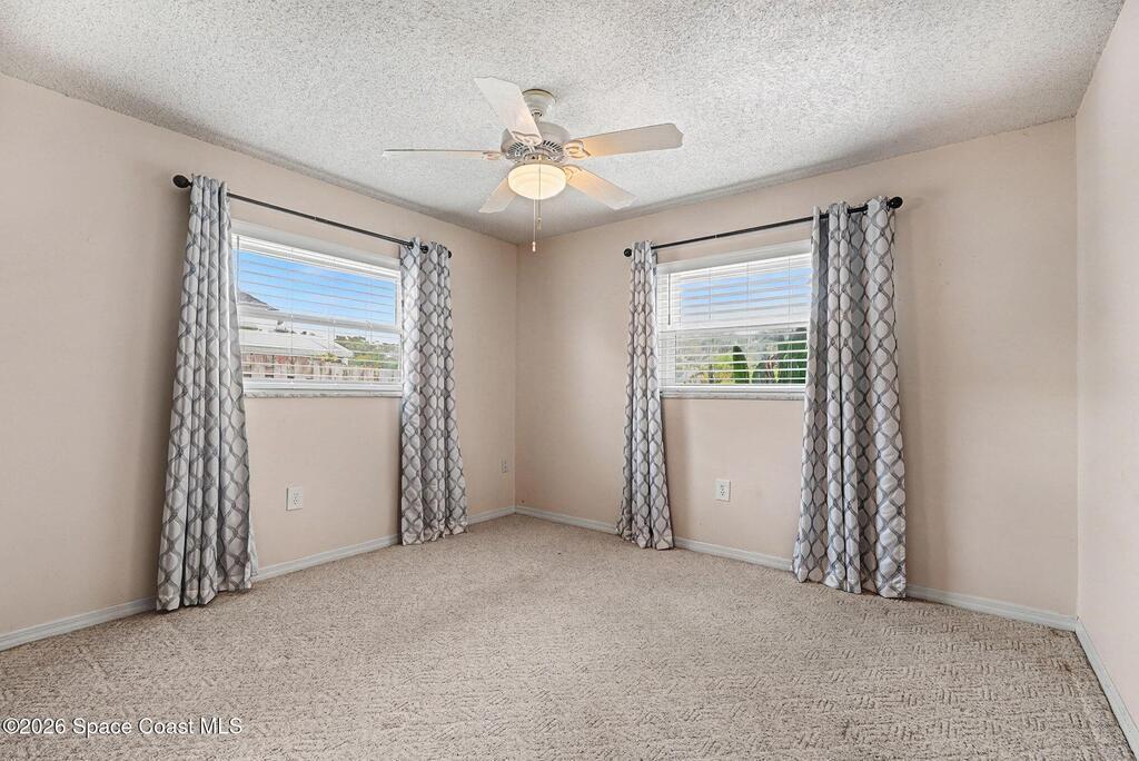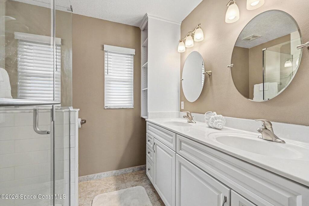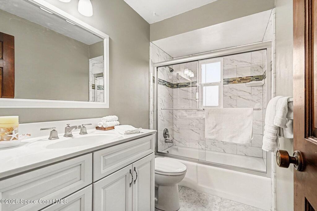 How do I love thee? Count all the ways you will LOVE this home. Impact windows and doors throughout. NEW ROOF in 2023, remodeled bathrooms and kitchen. Solid wood cabinets in the kitchen with built-in wine rack for entertaining. Plantation shutters in front windows, interior laundry room with pantry, first floor primary bedroom. 3 bedrooms and 2 bathrooms make it a perfect home! The WATERFRONT landscaped backyard creates a peaceful retreat, ideal for morning coffee or evening unwinding on the enclosed back porch. Additionally, this house features a large driveway and 2 car garage. Central to Blue Origin, Space X, NASA, Port Canaveral and beaches. So much to LOVE!