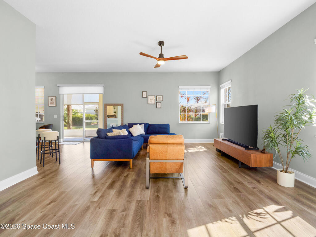 Tucked at the end of a quiet cul-de-sac, this end-unit offers rare privacy. Thoughtfully updated, the home features luxury vinyl flooring w/ tall baseboards throughout, white kitchen w/quartz countertops, SS appliances, all flowing into an open living and dining area designed for comfortable everyday living. The primary suite is a true retreat, complete with a large en-suite bath featuring an oversized garden tub, walk-in shower & private water closet. Enjoy peaceful mornings & evenings on the screened-in porch, perfect for unwinding. Located within the gated Capron Ridge community, residents enjoy a beautiful clubhouse, heated pool, walking trails, parks, tennis shuffleboard courts. Lawn care, exterior maintenance & roof coverage provide low-maintenance living, all within top-rated Viera schools & minutes from shopping, dining, medical facilities, & major employers. A great opportunity to enjoy privacy, convenience & community living in one of Viera's most established neighborhoods.