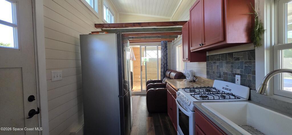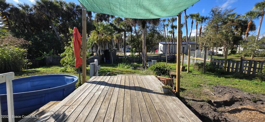 Ready for less house and more life? HERE IS YOUR SIGN! Tiny home on wheels plus built on addition 12X15 primary bedroom with washer and dryer hookups. Home has 2 lofts providing ample storage. The overwhelming character is undeniable! Butcherblock counters and new porcelain sink. Custom sized propane gas stove and large fridge. Set up perfectly for farm to table meals. Full bathroom with open shelves and zero entry shower behind a 100 yr old bard sliding door. Fenced backyard wrapped with a large custom deck and screened porch. Great for aspiring homesteaders with garden and chickens allowed. Butterfly attracting plants and mature palms create a backyard oasis. This tiny home is the perfect balance between simplicity and expression. If you have a creative sprit this is the home for you.