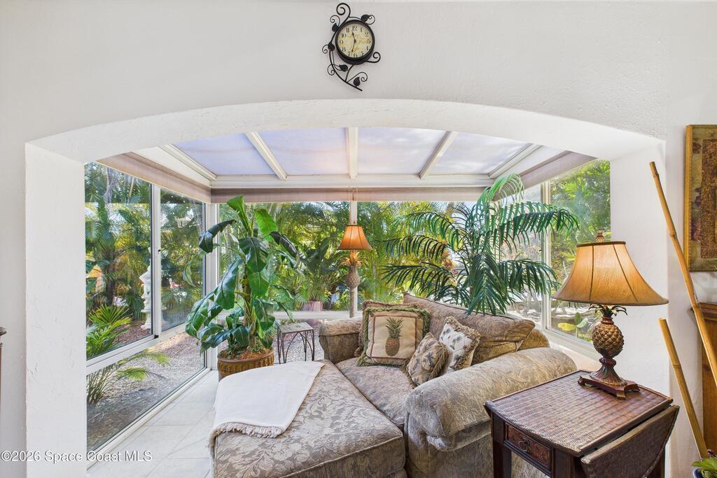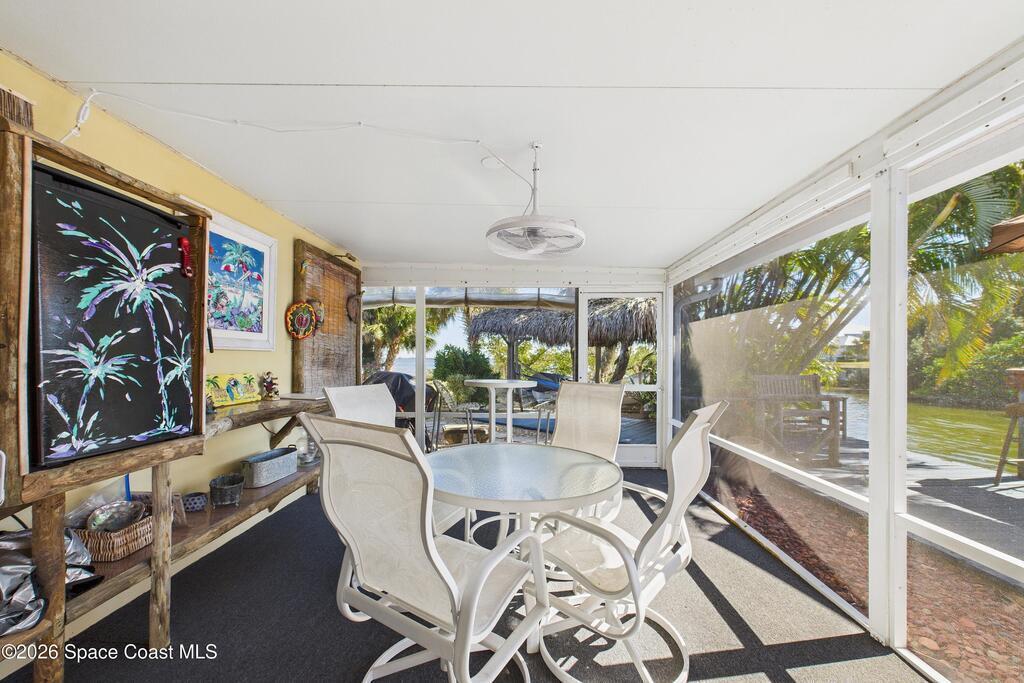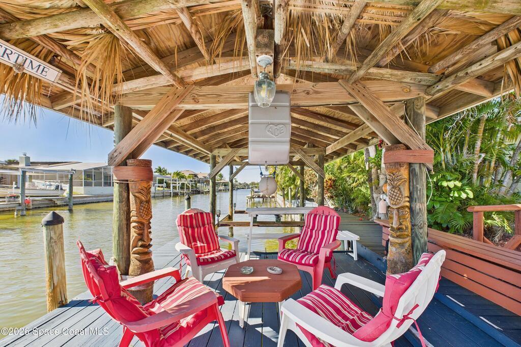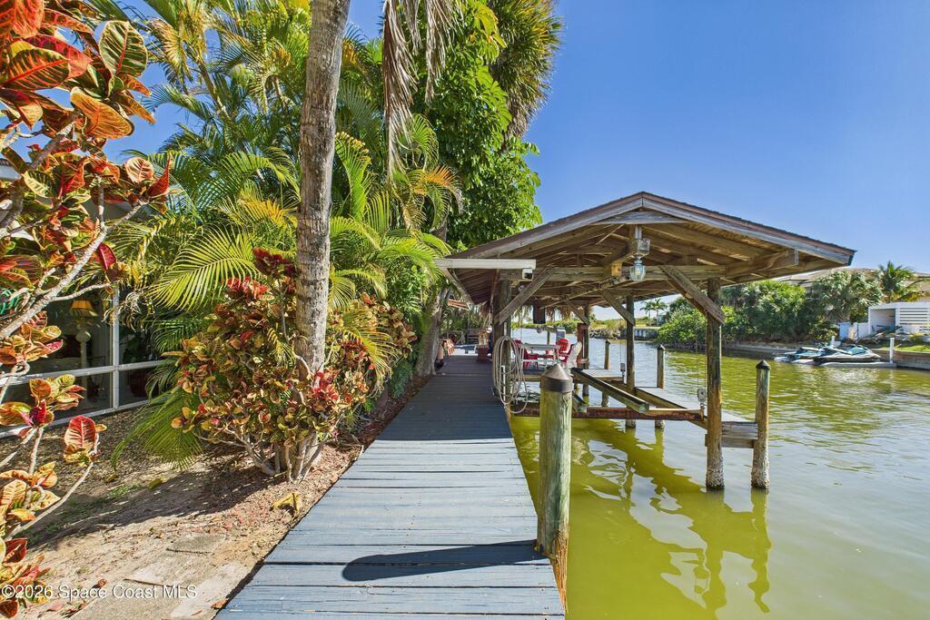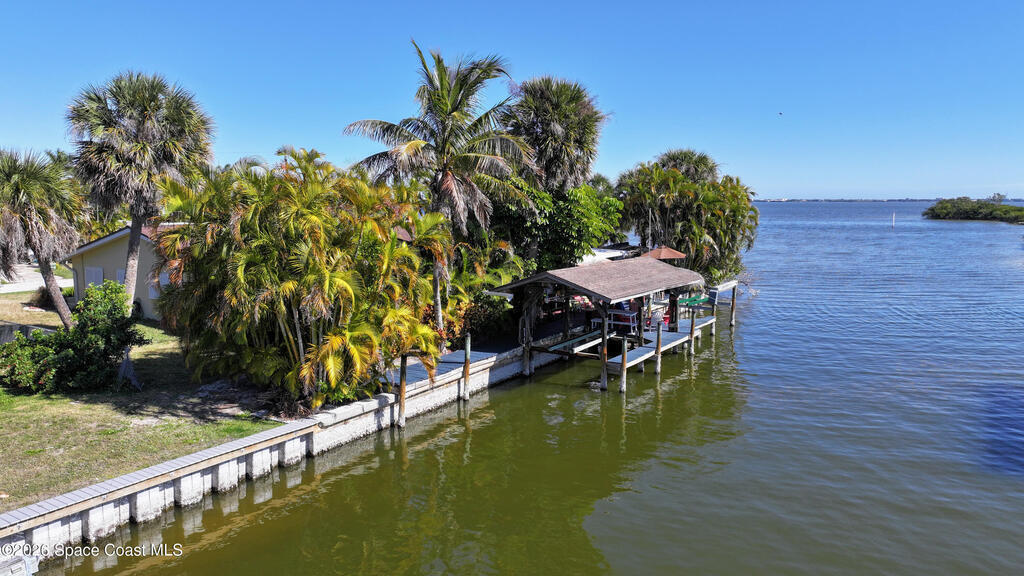 Waterfront living at its finest on an oversized lot with 224 feet of direct river and deep-water canal frontage offer breathtaking River views. This 3-bedroom, 2-bath home offers two additional bonus rooms, currently used as an art studio and home gym, providing flex space for work, creativity, guests or open it all up. Enjoy daily waterfront beauty with the ability to watch rocket launches and cruise ships from your own backyard, with nearby Port Canaveral. The primary features a full window solarium sitting area, perfect for taking in canal scenery. Boaters will appreciate two boat lifts with ample dock space. The property also offers Accordion shutters and impact sliders for added storm protection and peace of mind. extra parking for boats, RVs, or trailers, complete with RV water and electrical hookups for easy plug-and-play convenience. This is a rare opportunity to own a versatile, well-positioned waterfront home with unmatched views, storage, and lifestyle amenities.