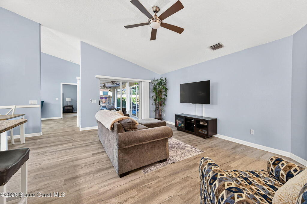 This 4 bedroom, 2 bathroom home offers a fantastic open floor plan with a dedicated dining area & two separate living spaces, providing plenty of room for living & entertaining. The kitchen features stainless steel appliances, granite countertops & separate laundry room with a washer & dryer that remain with the home. New luxury vinyl plank flooring adds a fresh, modern feel throughout the main living areas & the primary bedroom.Spacious primary suite includes a walk-in closet & bathroom with a walk-in shower and large garden tub. Outdoor features include mature landscaping, a screened-in porch, extended paver patio with fire pit, and a fully fenced private backyard. Additional highlights include a 2025 HWH, 2021 roof, low HOA, and easy access to I-95 and US-1, making commuting simple to Patrick Space Force base, Melbourne's aerospace employers & so much more. Enjoy a short drive to the Indian River, beaches, Cocoa Village & Port Canaveral for dining, recreation & more!