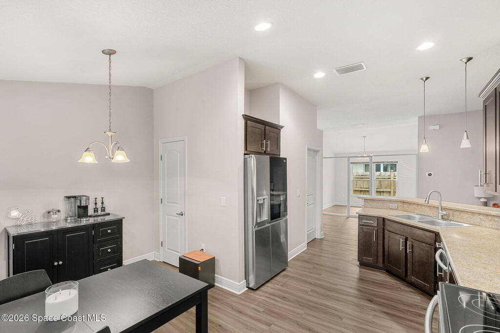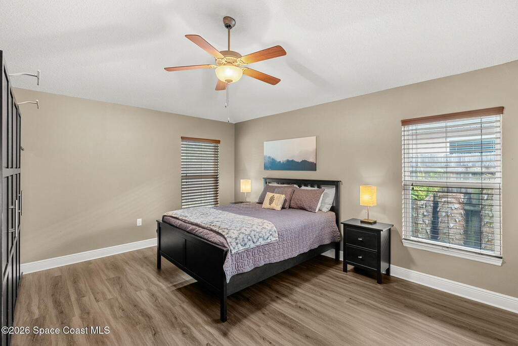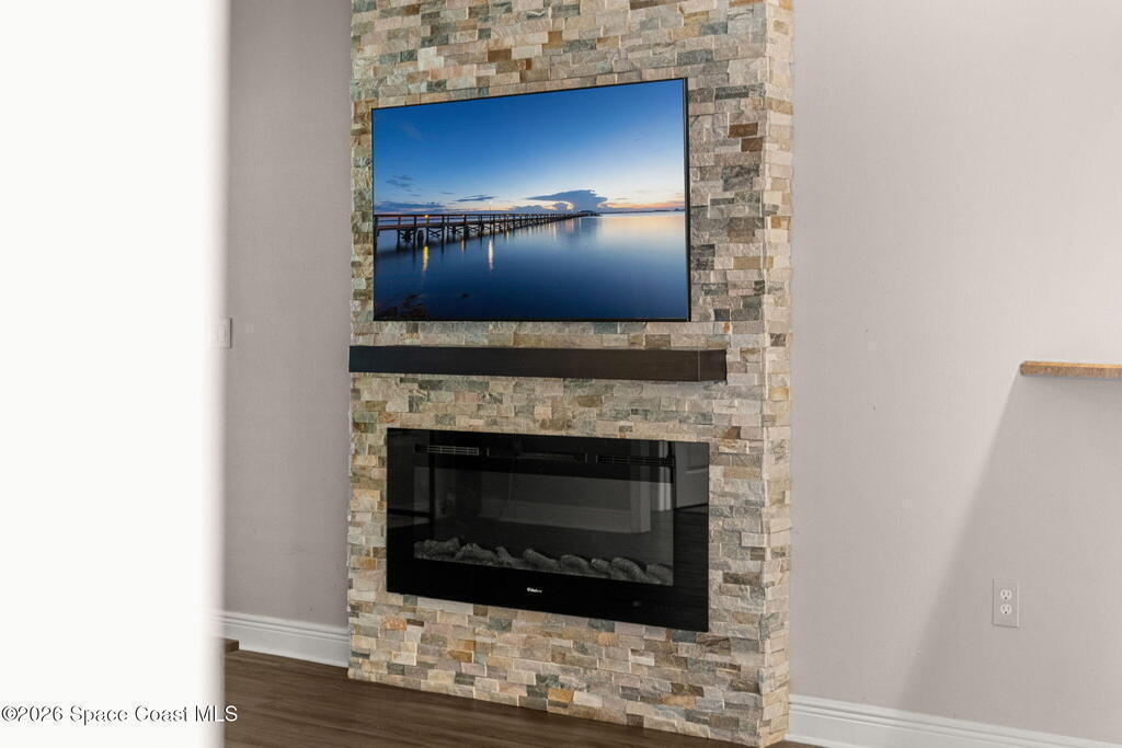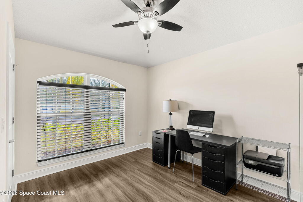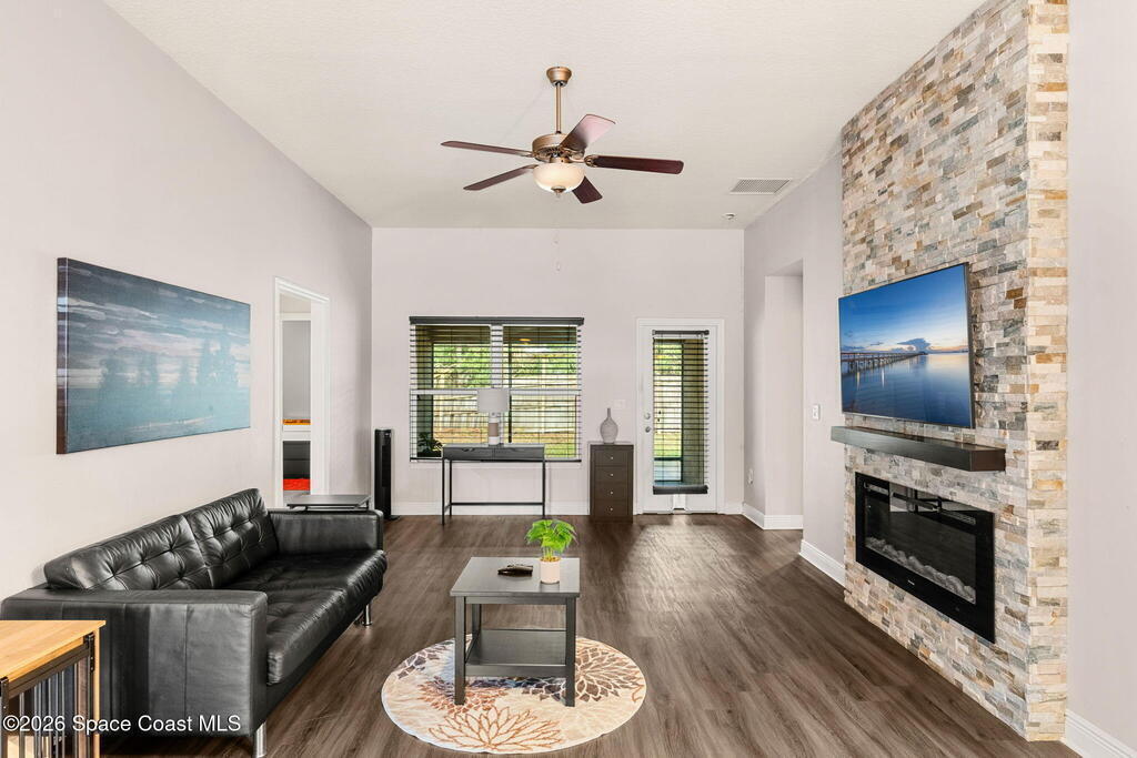 Conveniently located in the gated community of Hammock Trace Preserve, this spacious 4BD/2BA home offers a welcoming layout designed for everyday family living w/ a low yearly HOA of $500! The open-concept design & split floor plan provide the perfect balance of shared space & privacy, while vaulted ceilings create a bright & airy atmosphere. The eat-in kitchen features a breakfast bar, stainless steel appliances & tile backsplash, opening to the main living area highlighted by a cozy stacked-stone electric fireplace. The spacious primary suite serves as a relaxing retreat w/ dual sinks, a walk-in shower & soaking tub. Double doors lead to the 4th bedroom, perfect for a home office, playroom or flex space. Additional highlights include a dedicated laundry room, a trussed screened lanai & backyard ready for play, pets, or outdoor entertaining. Residents enjoy access to a community pool & a central location, minutes to major employers such as GE, Northrop Grumman, L3Harris, I-95 & more!