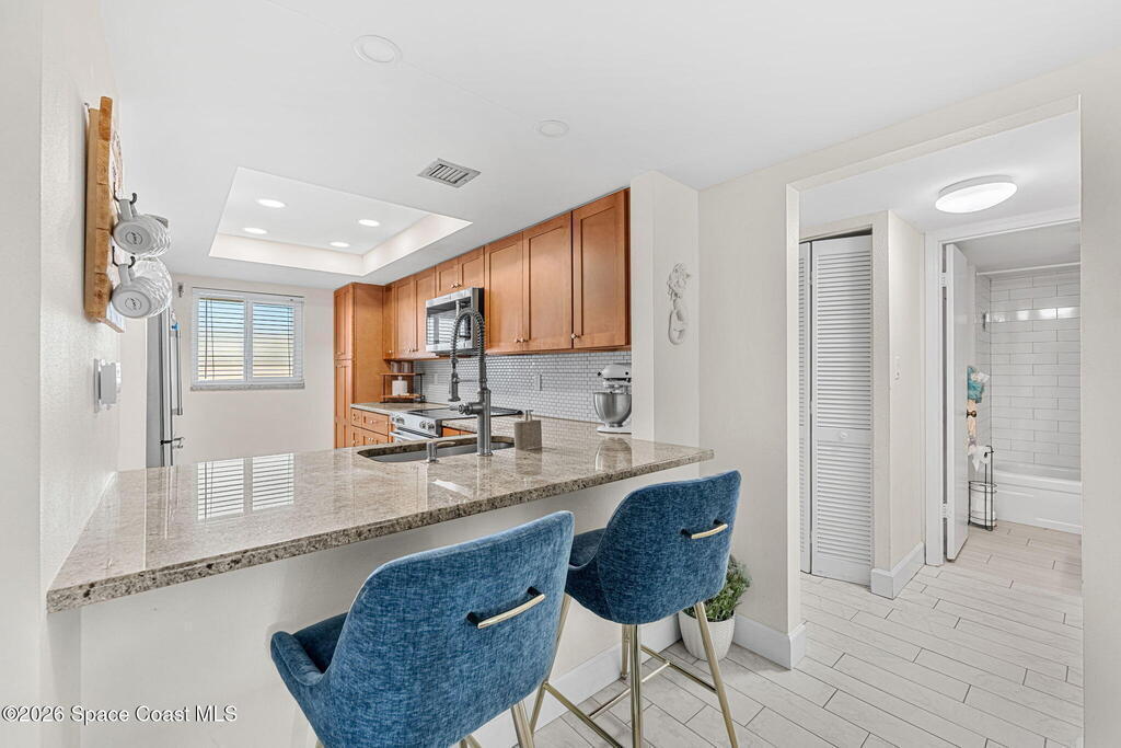 Wake up to the sound of the waves in this oceanfront 3-bedroom, 2-bath condo in the heart of Cocoa Beach, Florida. This spacious residence offers breathtaking Atlantic Ocean views from your private balcony, the perfect spot for morning coffee or sunset unwinding.The open living and dining areas are filled with natural light and flow seamlessly to the balcony, creating an ideal space for relaxing or entertaining. The kitchen is well-appointed with ample cabinetry and counter space, making everyday living effortless. The primary suite features a generous closet, and an en-suite bath, while two additional bedrooms provide flexibility for guests, a home office, or family living. Additional highlights include a private garage, in-unit laundry, and easy beach access just steps from your door. Located close to local dining, shopping, and entertainment, this condo offers the best of beachfront living with everyday convenience. Live where others vacation. Coastal Florida living at its best