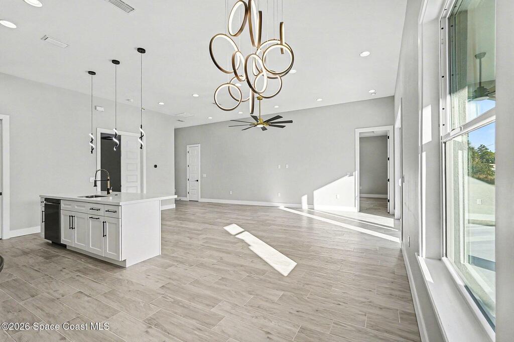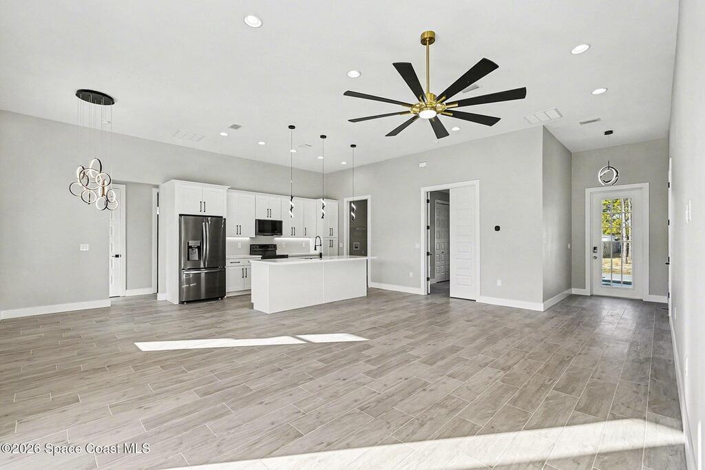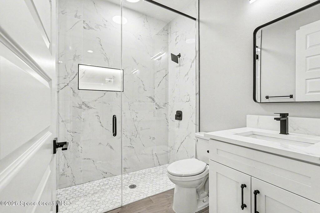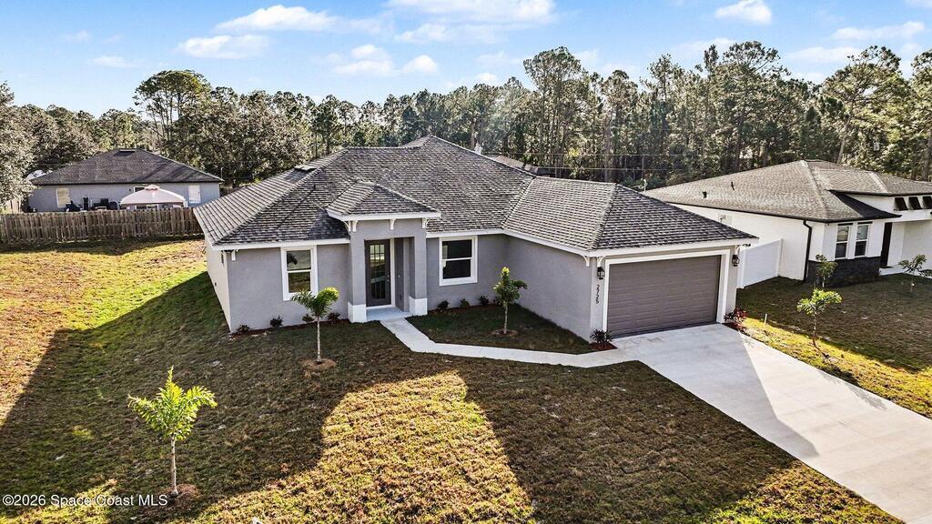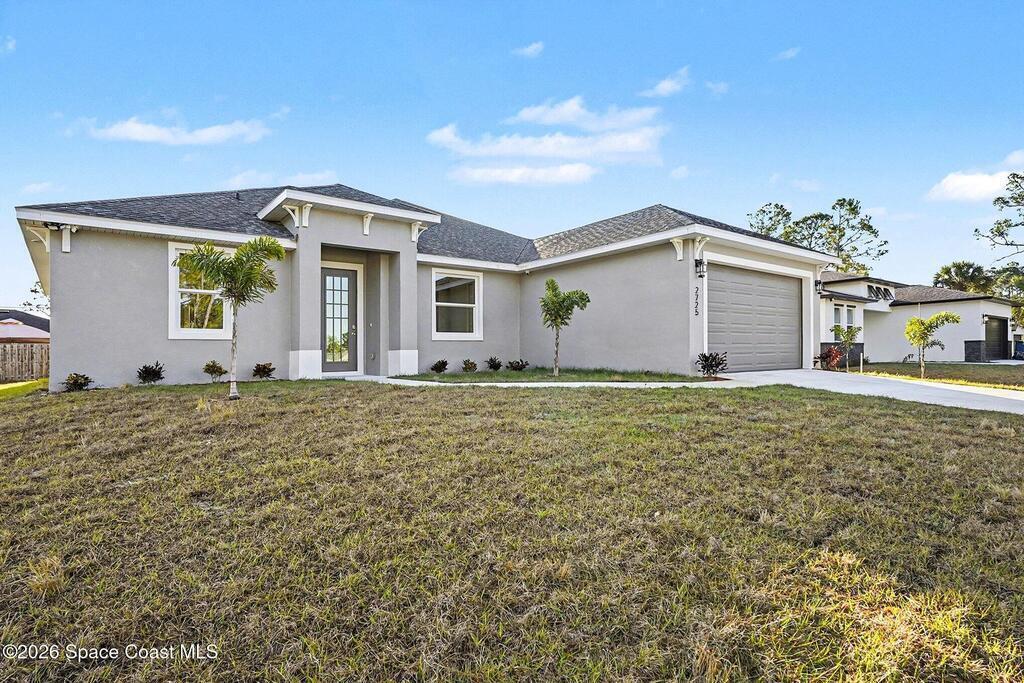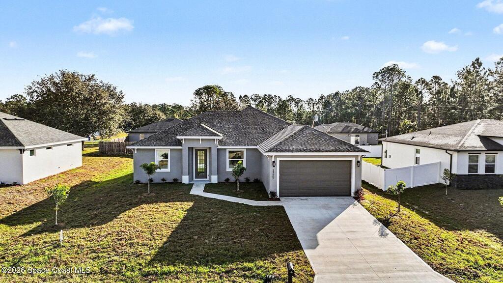 Impeccable craftsmanship and sophisticated design in the heart of Palm Bay, Florida. This stunning home embodies the essence of understated luxury, offering a serene retreat that blends modern high-end finishes with the relaxed atmosphere of the Space Coast. Every detail has been thoughtfully curated to provide a living experience that is both grand and inviting. The kitchen is anchored by a sprawling center island, perfect for entertaining or casual dining. This residence features lustrous quartz countertops not just in the kitchen, but carried seamlessly throughout the home, creating a cohesive aesthetic of elegance. Pristine tile flooring runs throughout the entire property, offering a cool, hypoallergenic, and sophisticated foundation that enhances the open, airy feel of the living spaces. The primary suite is a true sanctuary of relaxation. The en-suite bathroom rivals a high-end spa, featuring a grand walk-in shower equipped with dual rain shower heads, and a stand-alone bathtub