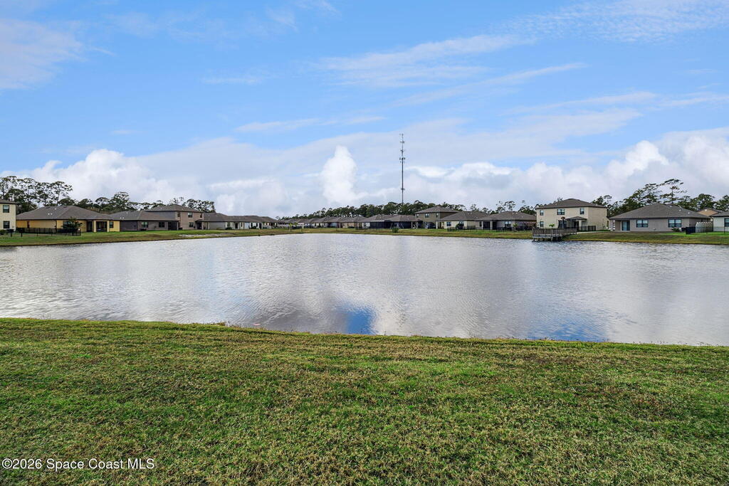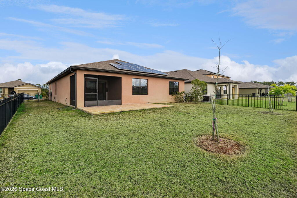 PAID OFF SOLAR panels make this move-in ready 4-bedroom, 2-bath home in Cocoa, Florida an exceptional value in the highly desirable Adamson Creek community. Built in 2022, this single-story, energy-efficient residence offers 1,830 square feet of open-concept living with a split-bedroom floor plan for privacy and functionality. The modern kitchen features a large island, pantry, and eat-in dining area, flowing seamlessly into spacious living and dining spaces with tile and carpet flooring throughout. The primary suite includes a walk-in closet and a walk-in shower. Enjoy peaceful pond views from the screened rear porch and a fully fenced backyard ideal for outdoor living and entertaining. Additional highlights include a 2-car garage, central air conditioning, in-unit laundry, and low quarterly HOA. Conveniently located near top-rated schools, shopping, dining, and major highways, this newer construction home offers the perfect blend of comfort, efficiency, and location in Brevard Cty,