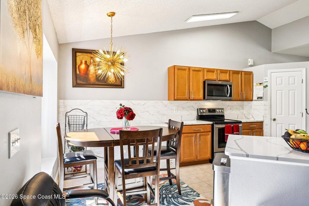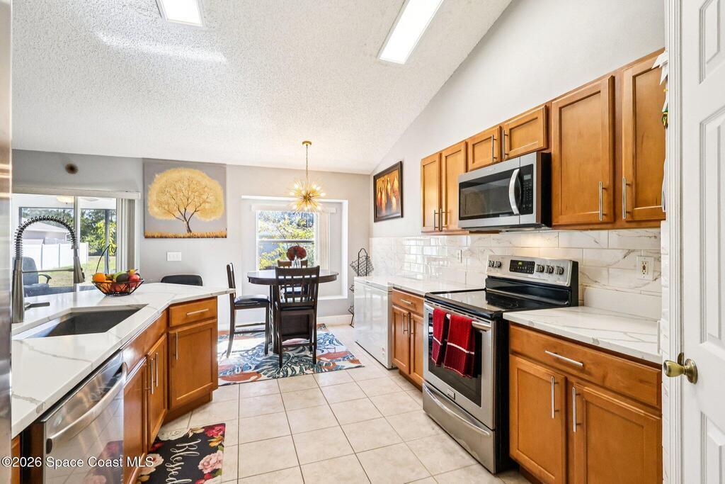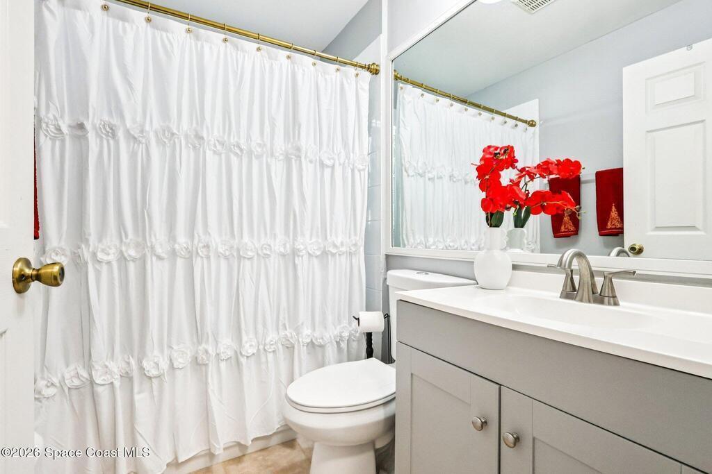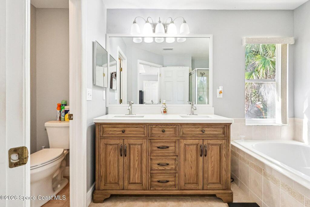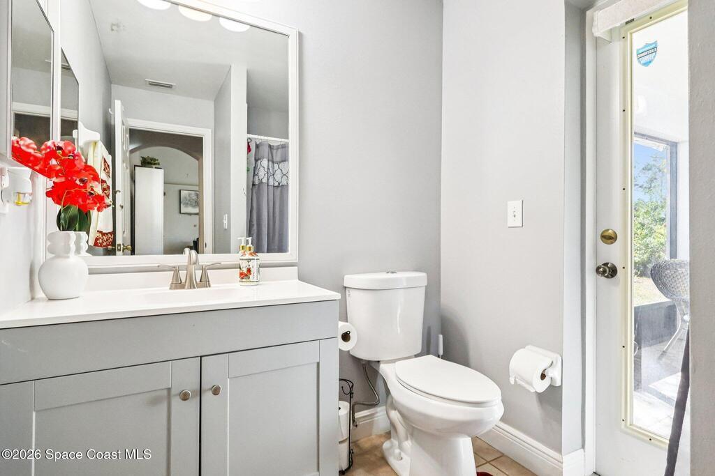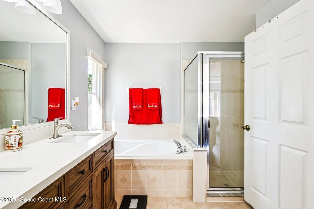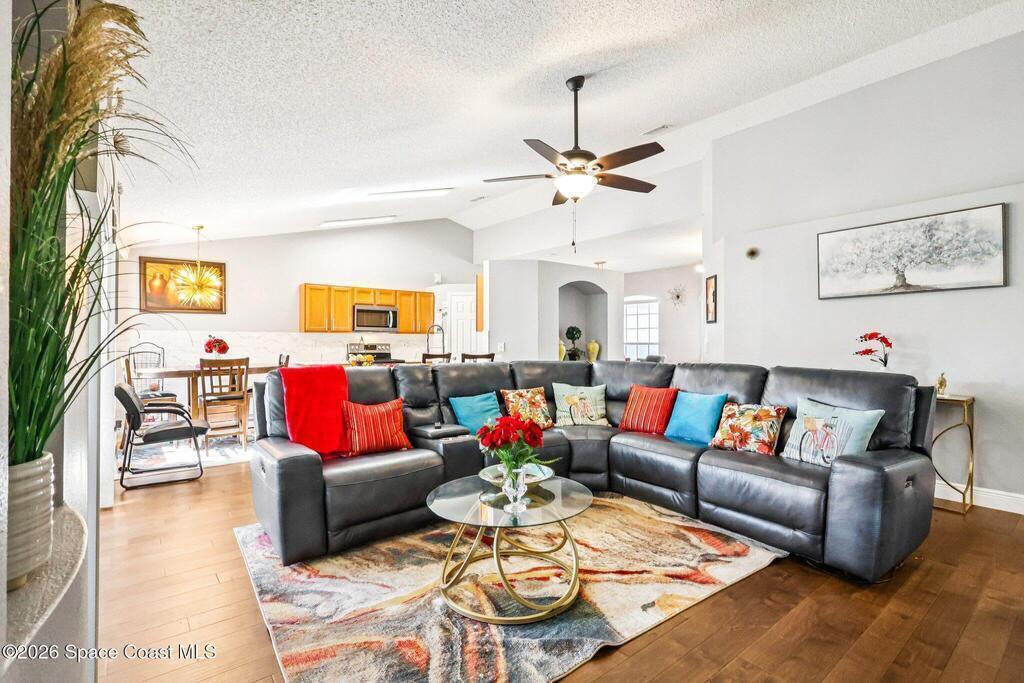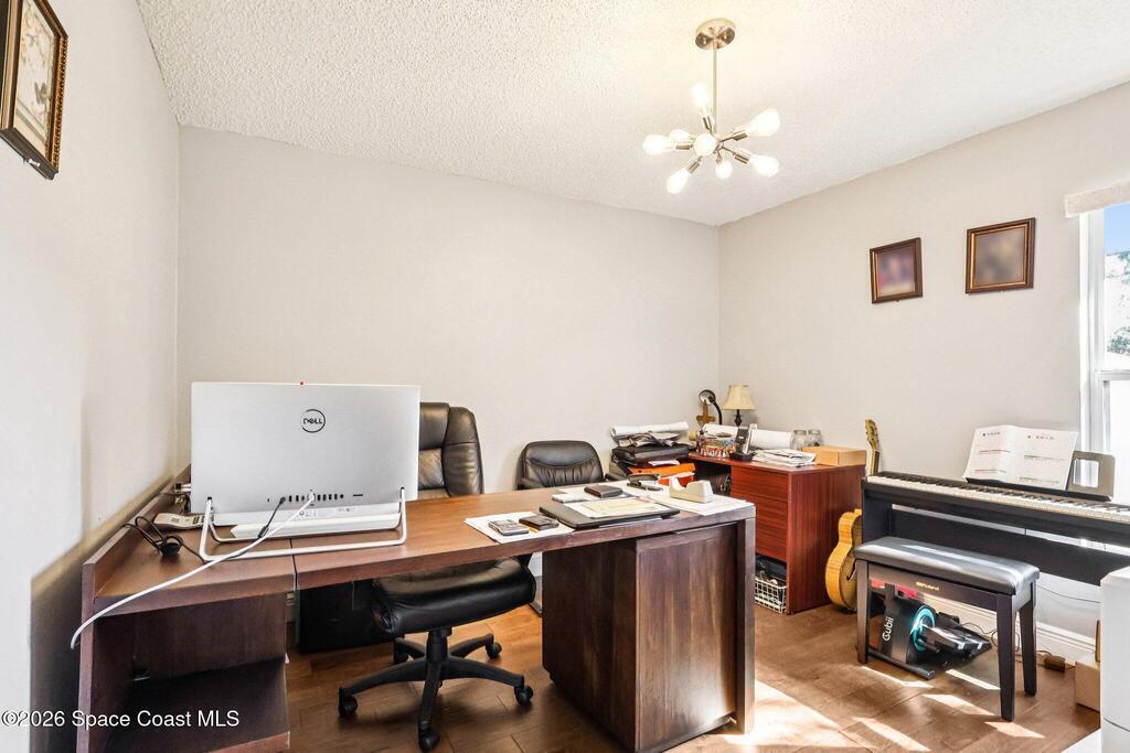 Hard-to-find Palm Bay home featuring 3 bedrooms + a dedicated office and 3 full bathrooms, thoughtfully designed with a split floor plan and multiple living spaces. The home offers an updated kitchen with quartz countertops, stainless steel appliances, and an open floor plan that flows beautifully into the main living areas. Enjoy newer wood plank flooring throughout, adding warmth and style. Additional highlights include a formal living room and formal dining room, ample closet space throughout, and a large primary suite with double closets. The primary bathroom features a water closet, soaking tub, and walk-in shower. Step outside to a private backyard with a screened lanai, perfect for relaxing or entertaining. Major updates include a roof (approx. 5 years old), water heater (approx. 5 years), renovated bathrooms, and newer washer and dryer. Conveniently located just 10 minutes from Publix, 25 minutes to the beaches, and centrally positioned near dining and shopping. Seller is