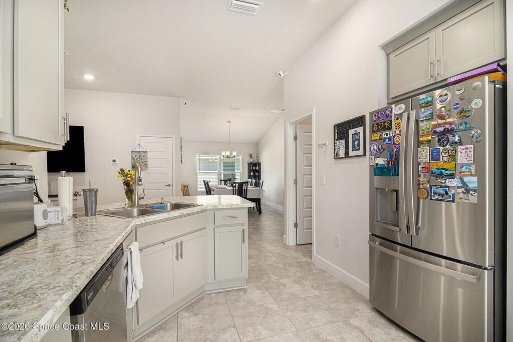 Nearly new, this one-owner home built in 2023 offers a spacious open-concept floor plan with 4 bedrooms, 2 bathrooms, and a 2-car garage. The kitchen features a breakfast bar, eat-in breakfast nook, pantry and separate dining area. The great room has French doors leading out to the covered patio that backs up to a wooded area for added privacy. This split plan home provides privacy, while the primary suite includes a walk-in closet, bath with dual sinks, and a walk-in shower. Additional features include indoor laundry, hurricane shutters, and irrigation system. Conveniently located minutes from shopping/dining, major highways, and Kennedy Space Center. Watch rocket launches from your own yard.