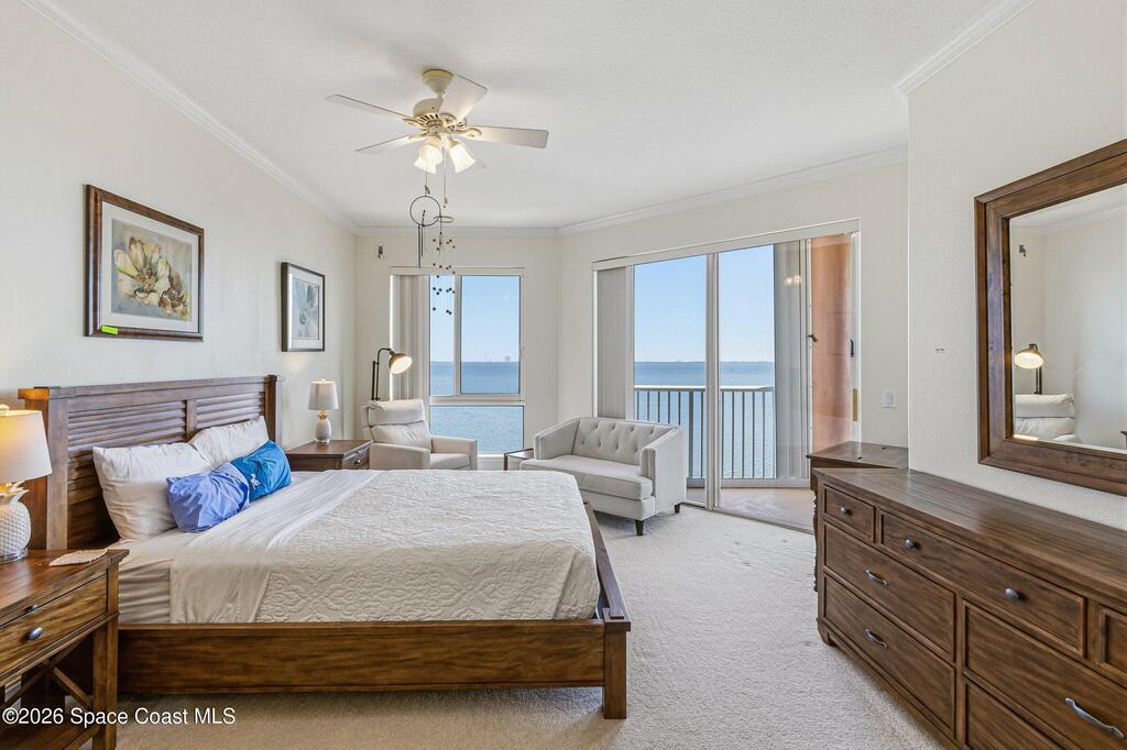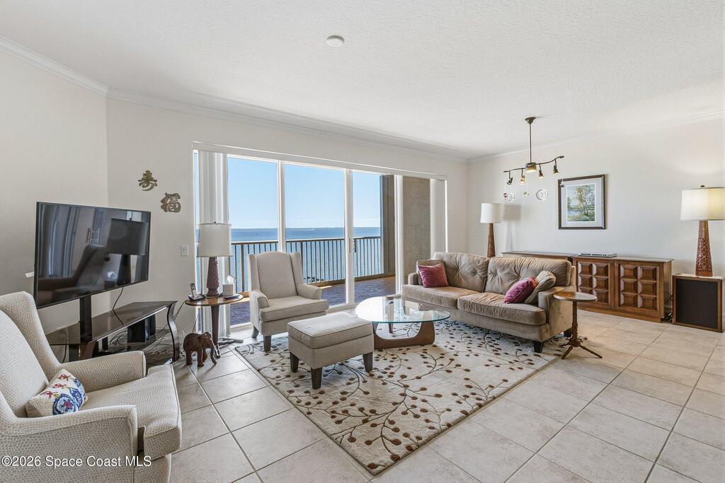 The most sought after direct Indian River views from this gorgeous 4th floor unit. Enjoy views of the Space Center and rocket launches, river wildlife and spectacular sunrises. 3 spacious bedrooms- main bedroom with slider to balcony for private enjoyment. His & her closets, large main bathroom with double vanity, garden tub and separate shower. Large kitchen with appliances all new in 2021. Eat in area off the kitchen. Dining room and great room both with views of the river. Unit also offers small sitting room/office. Water heater replaced in 2019, AC in 2024 and washer/dryer 2023. Beautifully maintained complex offers pool, underground parking and up to date security.