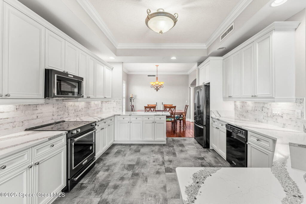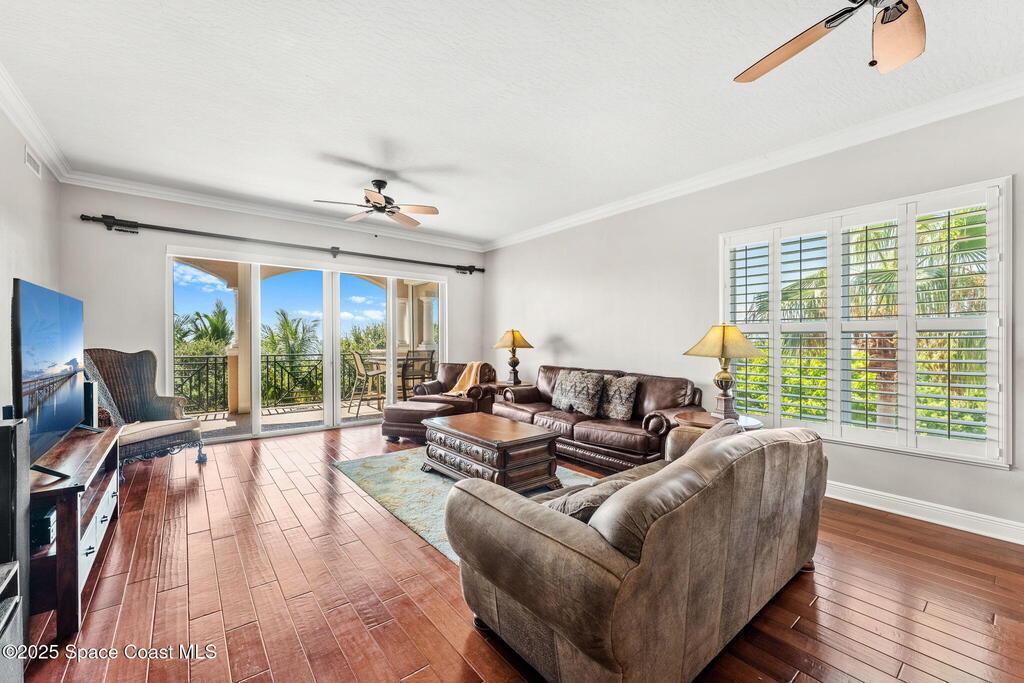 72 hr KOC. Riverfront living takes center stage in this top floor panoramic-view condo overlooking the scenic Intracoastal, where every detail is designed for comfort, beauty & ease. Behind 32ft of waterfrontage is a brand-new AC to keeps things crisp, while 10' ceilings, crown molding, & impact-rated windows w/ timeless plantation shutters elevate every space. 8' sliders--outfitted w/ electric blinds--open wide to a breezy balcony perfect for soaking in those endless water views. The kitchen shines w/ quartz counters, KitchenAid & Whirlpool appliances, a GE fridge & breakfast bar, while hardwood floors add warmth to the dining & living areas. All bedrooms feature en-suite baths, including a luxe primary suite w/ double-door entry, built-in closets, marble-floored bath, jetted tub & glass shower. Enjoy the ease of fresh paint, full laundry w/ sink & 3 garage spaces (32, 33, 34). The amenity-rich & SIRS complete building offers a spa, pool, gym, clubhouse, elevator & sunset dock.