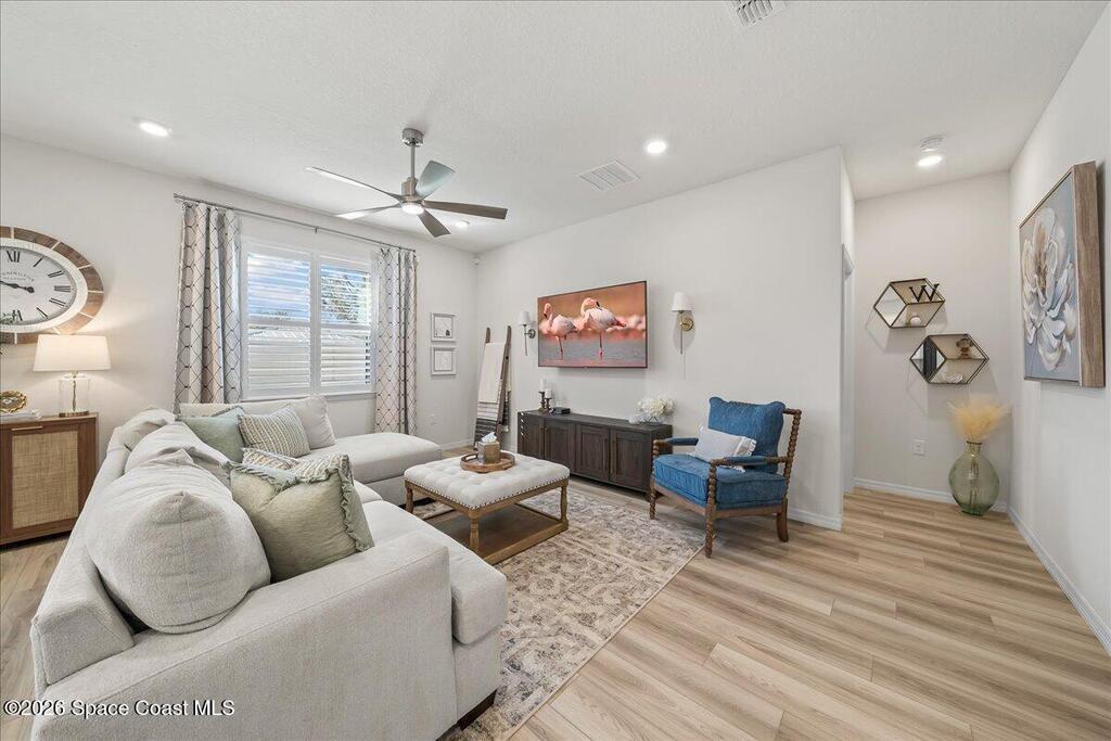 Scroll-stopper, Show-stopper!Built in 2023, located in the newer community of Huntington Cove is this upgraded Jupiter floor-plan that's a decorators dream come true. This move-in ready residence has the look and feel of not just a model home, but more like a home showcased on HGTV!Checking boxes all the way down the list!*Spacious great room open concept plan*Luxury plank flooring *Upgraded kitchen with white cabinetry, quartz counters, subway tile backsplash, stainless appliances *Designer lighting fixtures/fans*Custom Batten accent entry wall*Plantation shutters*Frameless glass shower in primary*Custom window treatments *Modern interior door handles *Spacious and privacy fenced (6ft PVC vinyl) *Epoxy coated garage floor*Custom landscape curbing*Screened lanai *Front storm glass door*Gutters around home*Convenient, central Rockledge location, community of newer homes, less than 10 min to Viera or Cocoa Village!