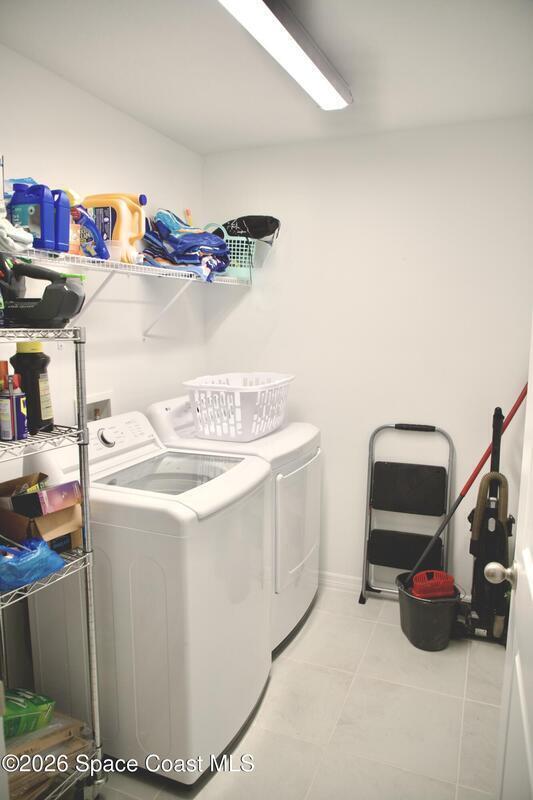 Spacious Great Room with vaulted ceilings and sliding glass doors that lead to a covered, private lanai--ideal for seamless indoor-outdoor living. The centrally located kitchen features a freestanding island, walk-in pantry, and opens to a bright dining area accented by a tray ceiling. The primary suite includes a generous walk-in closet and an en-suite bathroom with a dual-sink vanity, a walk-in shower, and a separate linen closet for added storage. Additional features include hurricane-impact windows and doors, tile flooring throughout the main living areas, designer cabinetry in both the kitchen and bathrooms, stainless steel appliances, and an attached two-car garage. A newly installed privacy fence enhances the outdoor space, offering both comfort and seclusion. This home is move-in ready, and even Includes the washer and dryer!