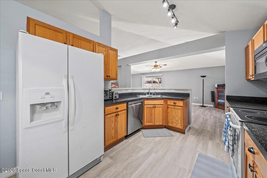 Welcome home to this well-maintained gem in Fairmont, a sidewalk-lined neighborhood in the heart of West Melbourne. This home shines with fresh exterior paint and a new roof, plus a bright, open layout featuring vaulted ceilings and tons of natural light. You'll love the central kitchen that anchors the home--perfect for everyday living and entertaining--and the beautiful tile plank flooring throughout for a clean, modern feel. Both bathrooms have been updated with tasteful tile, and the spacious primary suite offers a relaxing retreat. Step outside to a privacy-fenced backyard--ideal for pets, play, or weekend grilling. Move-in ready, thoughtfully updated, and easy to love!