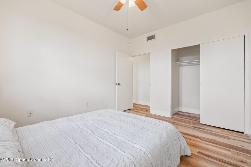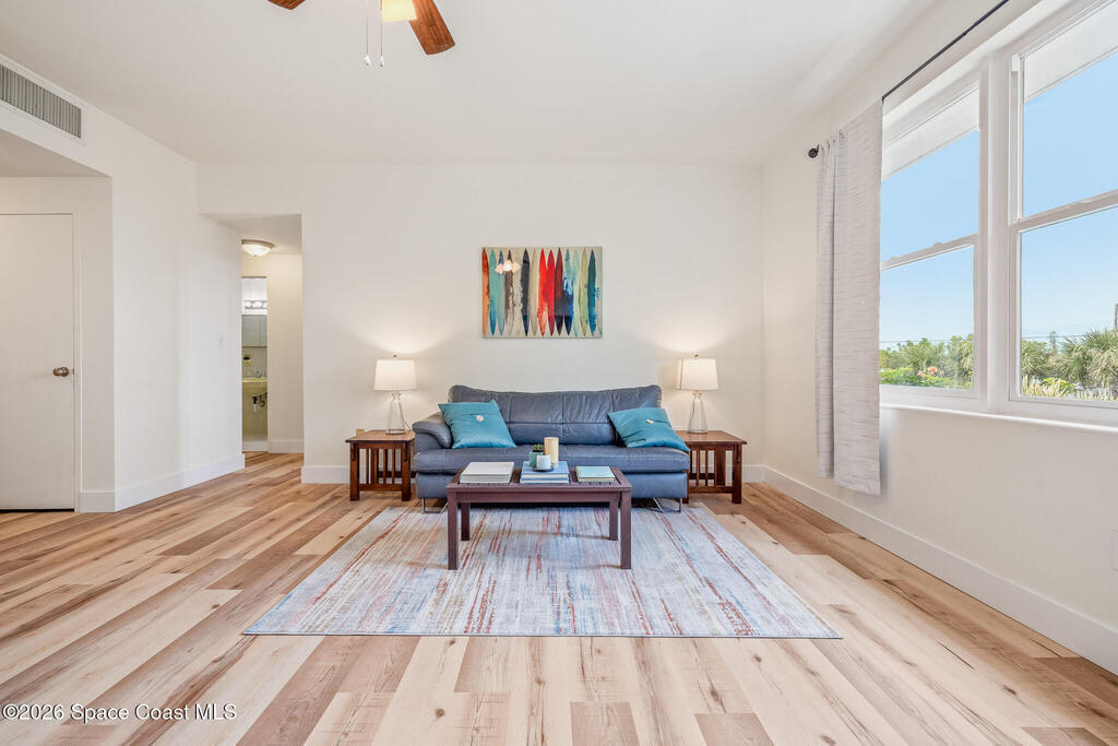Wake up to the sound of waves in this beautifully remodeled 1 bedroom, 1 bath condo located directly across from the ocean in the heart of Satellite Beach. This second-floor retreat features new waterproof vinyl flooring, fresh paint and new baseboards in 2026, along with major updates including an AC handler, condenser, and water heater. Enjoy peace of mind with hurricane impact rated windows. Extra storage is available in a communal hallway room. Condo fees cover internet (currently being installed with completion expected in March at no added cost), water, sewer, trash, pest control, grounds maintenance, and insurance. Residents enjoy resort-style amenities including an Olympic-size pool, BBQ area, shuffleboard, basketball court, and recreation room. Assigned parking plus ample guest spaces add convenience. Best of all beach access is directly across the street.