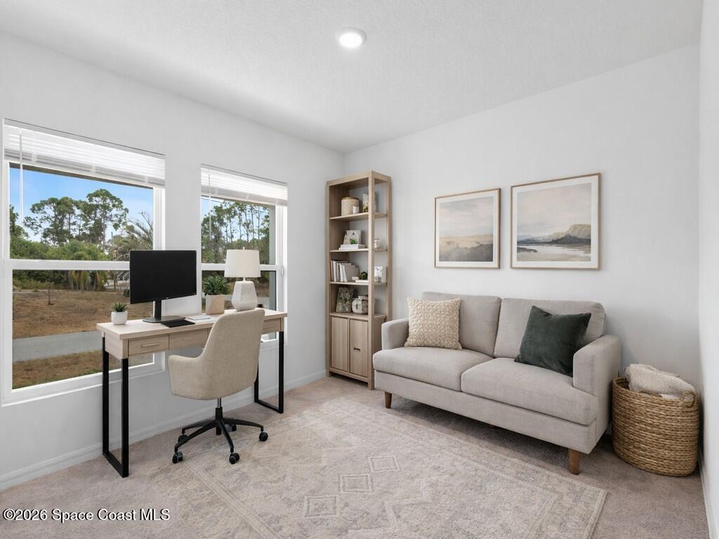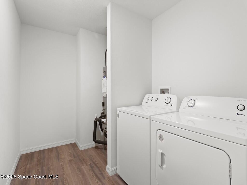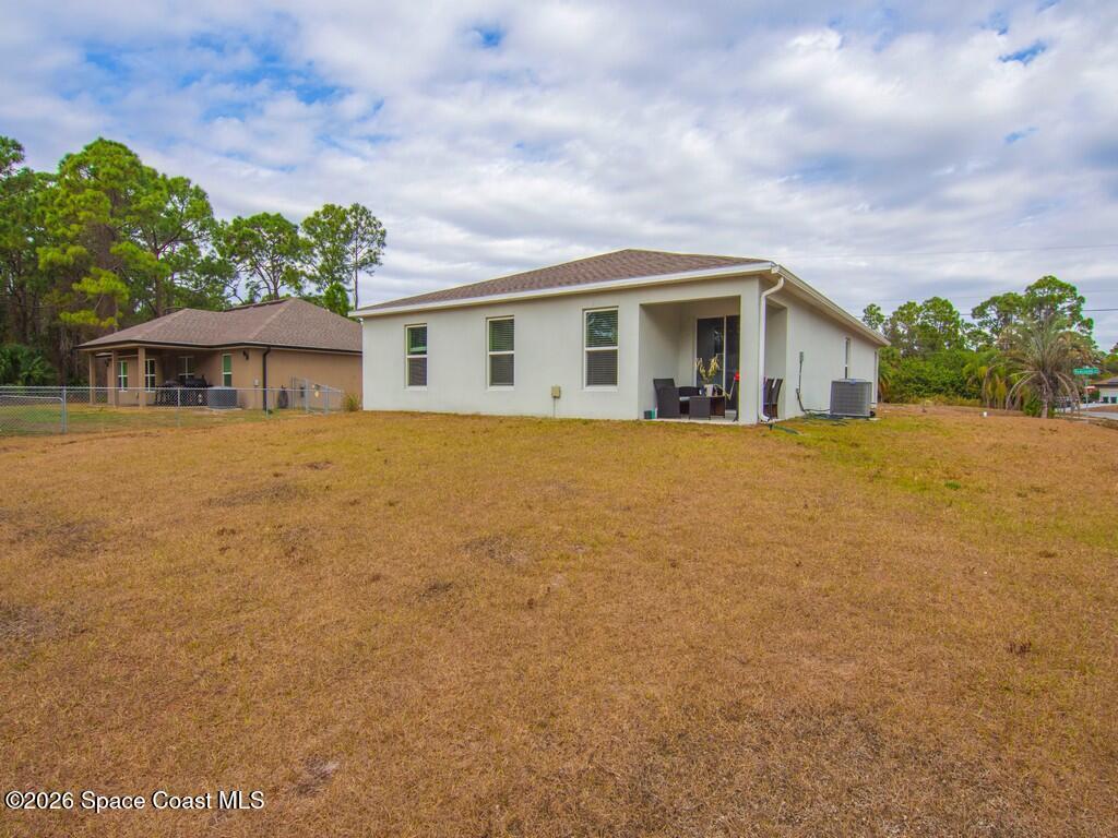 Gorgeous and spacious 3-bedroom, 2-bath single-family home located in the desirable Palm Bay community. This home offers a split-bedroom floor plan, providing privacy with the primary suite situated on its own side of the home. A versatile den with a door functions perfectly as a fourth bedroom, home office, or guest space. The thoughtfully designed layout offers ample storage and comfortable living throughout. Enjoy a full-size laundry room with full-size washer and dryer. The beautiful kitchen features white cabinetry, granite countertops, stainless steel appliances, and is open to the living and dining areas, ideal for entertaining. The primary suite includes a generously sized walk-in closet and dual vanity sinks. Additional highlights include a two-car garage, rear porch, and a large corner-lot yard, perfect for families or pets, with only one neighboring home. Conveniently located minutes from Publix, shopping, dining, and everyday conveniences in a growing community.