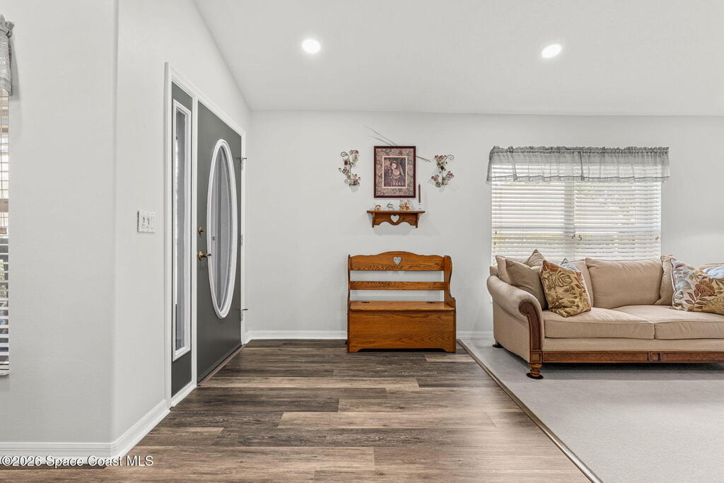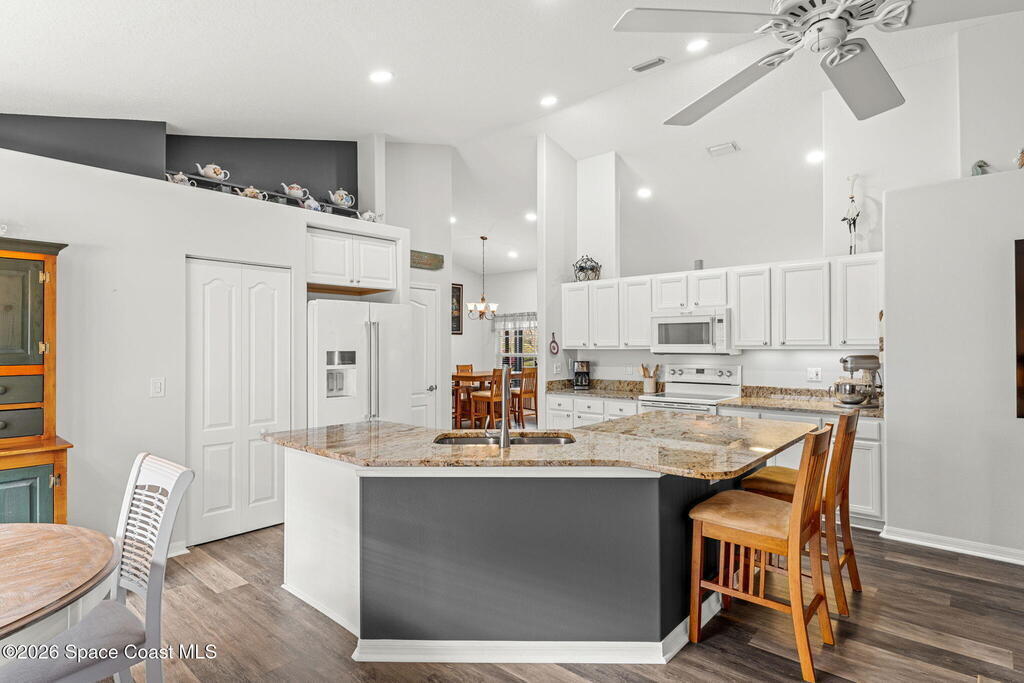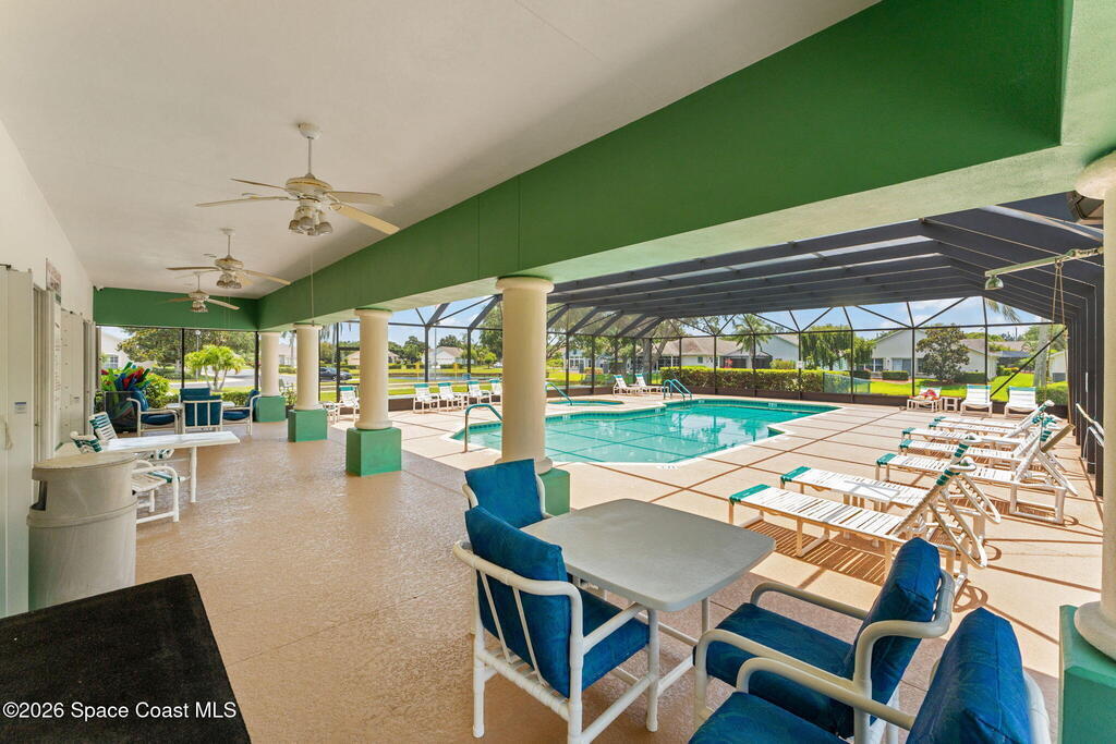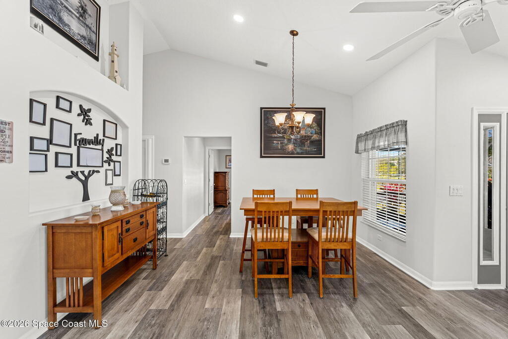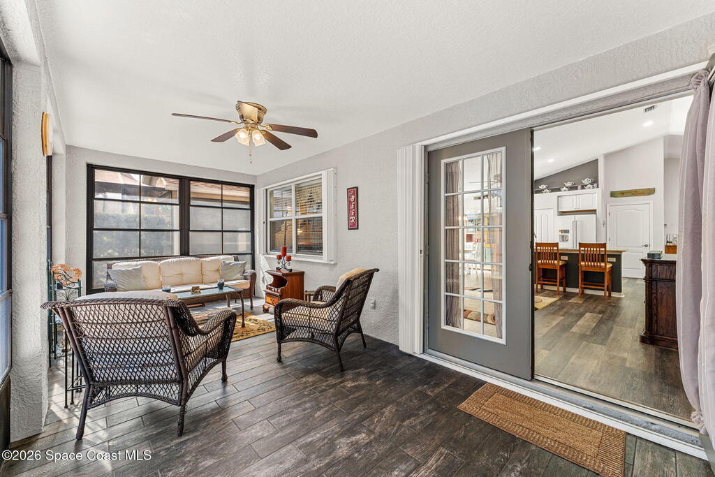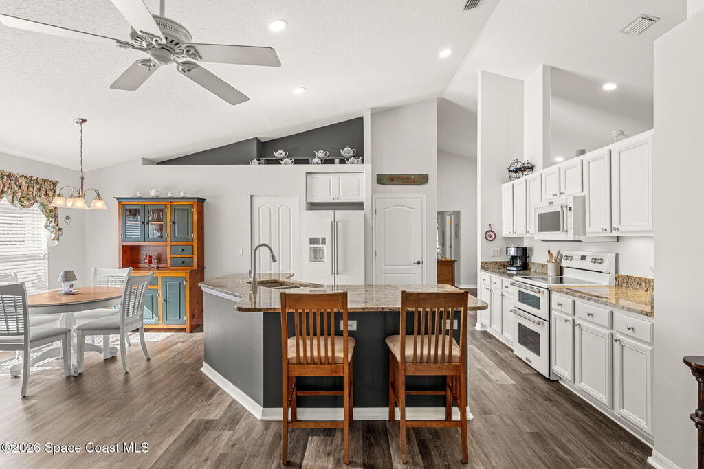 Enjoy the best of Active Adult living in the desirable 55+ gated community of Compass Pointe in West Melbourne! This beautifully updated 3BD/2BA home welcomes you through a screened front porch. Inside, vaulted ceilings, recessed lighting, and LVP flooring create an inviting feel. The layout offers separate living and dining, a family room, and a breakfast nook--ideal for entertaining or everyday comfort. The kitchen features white cabinetry, granite counters, a pantry, and KitchenAid appliances. A barn door opens to the remodeled primary en-suite with dual sinks, granite counters, and a custom-tiled walk-in shower. French doors lead to the lanai, and accordion shutters add peace of mind. Updates: electric garage door screen, paver driveway and walkway, and walkway. Roof and HVAC new in 2022, water heater in 2020. Resort-style amenities: pool, spa, fitness center, clubhouse, putting green, shuffleboard, bocce, and daily activities. Close to golf, shopping, dining, and beaches.