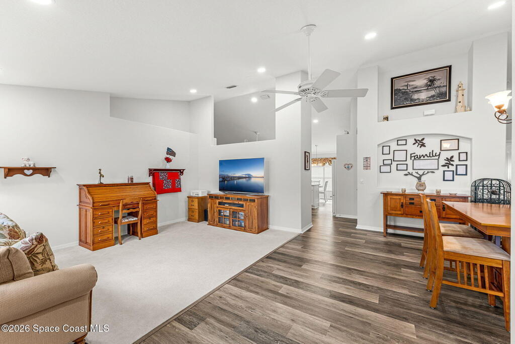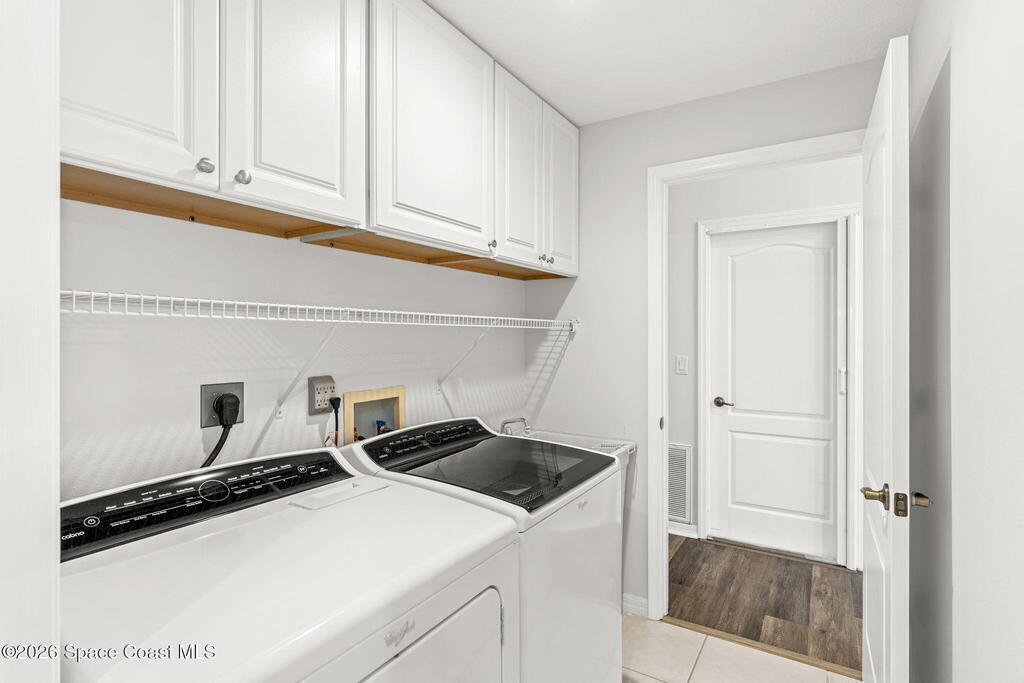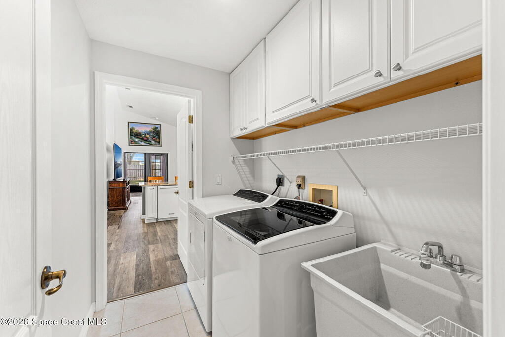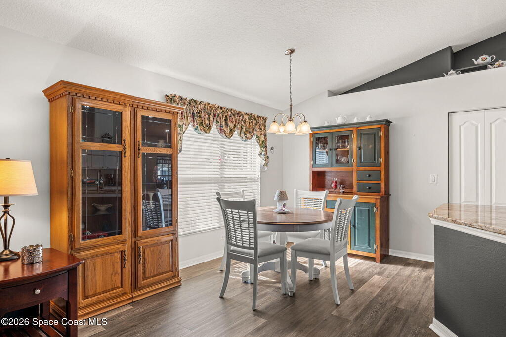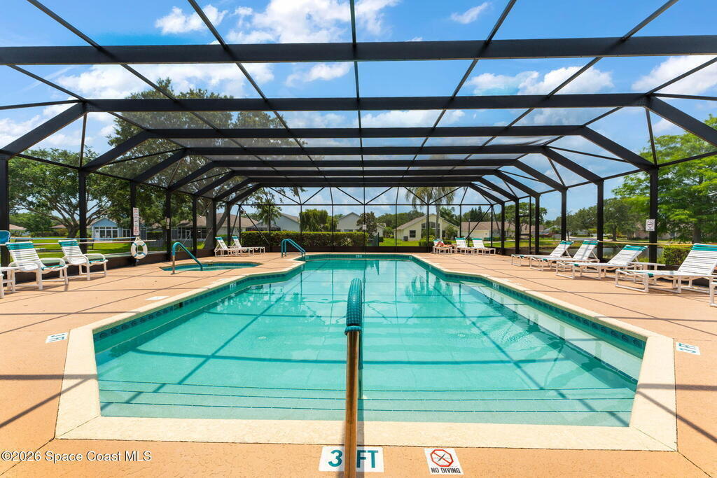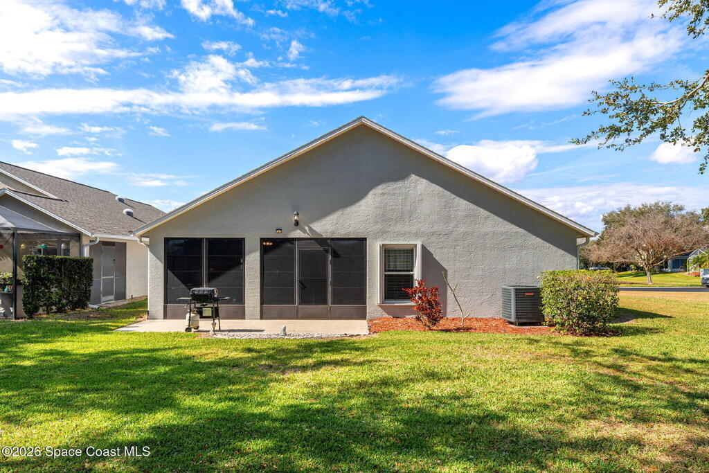 Enjoy the best of Active Adult living in the desirable 55+ gated community of Compass Pointe in West Melbourne! This beautifully updated 3BD/2BA home welcomes you through a screened front porch. Inside, vaulted ceilings, recessed lighting, and LVP flooring create an inviting feel. The layout offers separate living and dining, a family room, and a breakfast nook--ideal for entertaining or everyday comfort. The kitchen features white cabinetry, granite counters, a pantry, and KitchenAid appliances. A barn door opens to the remodeled primary en-suite with dual sinks, granite counters, and a custom-tiled walk-in shower. French doors lead to the lanai, and accordion shutters add peace of mind. Updates: electric garage door screen, paver driveway and walkway, and walkway. Roof and HVAC new in 2022, water heater in 2020. Resort-style amenities: pool, spa, fitness center, clubhouse, putting green, shuffleboard, bocce, and daily activities. Close to golf, shopping, dining, and beaches.