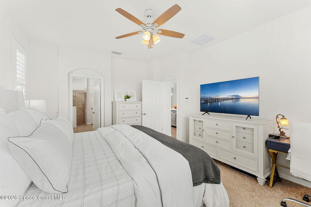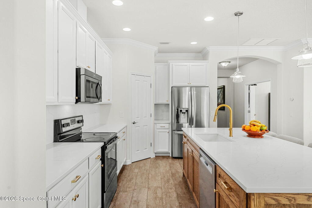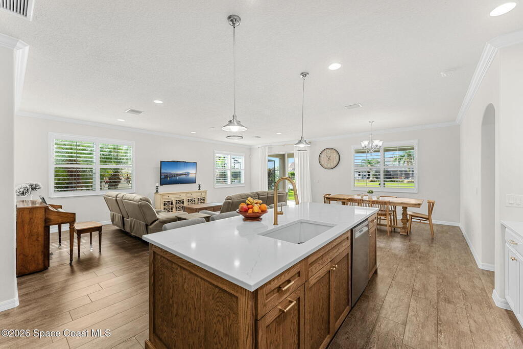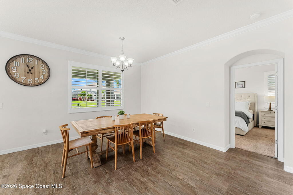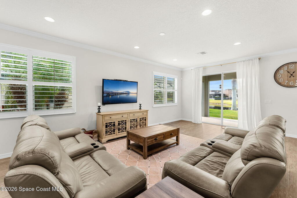 Water views set the tone the moment you walk in, and from there the upgrades keep stacking: an extended great room with crown molding (2016) opens into an updated kitchen featuring quartz counters, stainless steel appliances, and a renovated island (2022), creating a clean, modern space that actually feels made for everyday living and easy entertaining. Plantation shutters (2022) add that finished, polished look, while the extended lanai (2016) pulls you outdoors to soak in the view. And if a pool is on your wish list, the heavy lifting is already done with a pool pre-wire in place (2016). All of it sits right in the center of West Viera--close to everything you want, zoned for A-rated schools, and set up for a lifestyle that's equal parts effortless and upgraded.