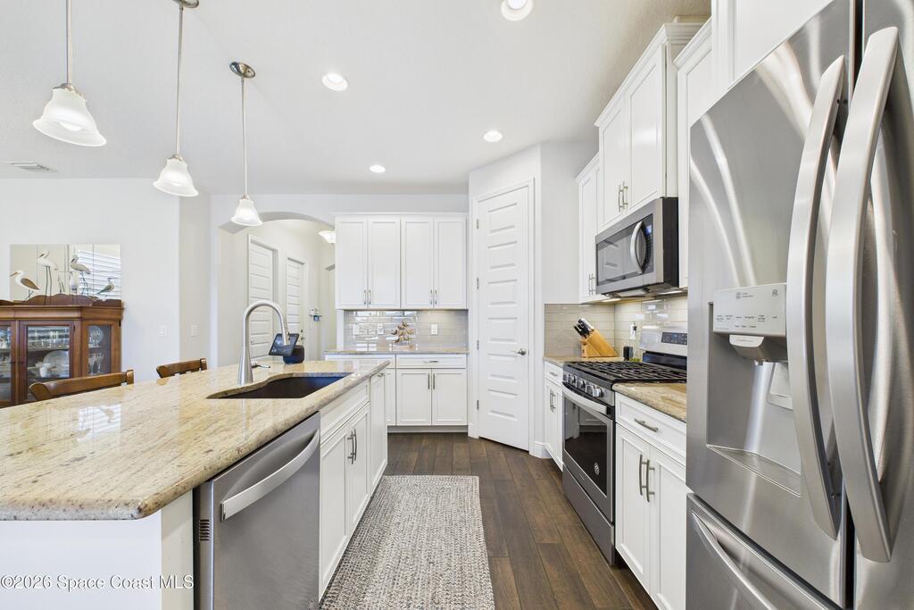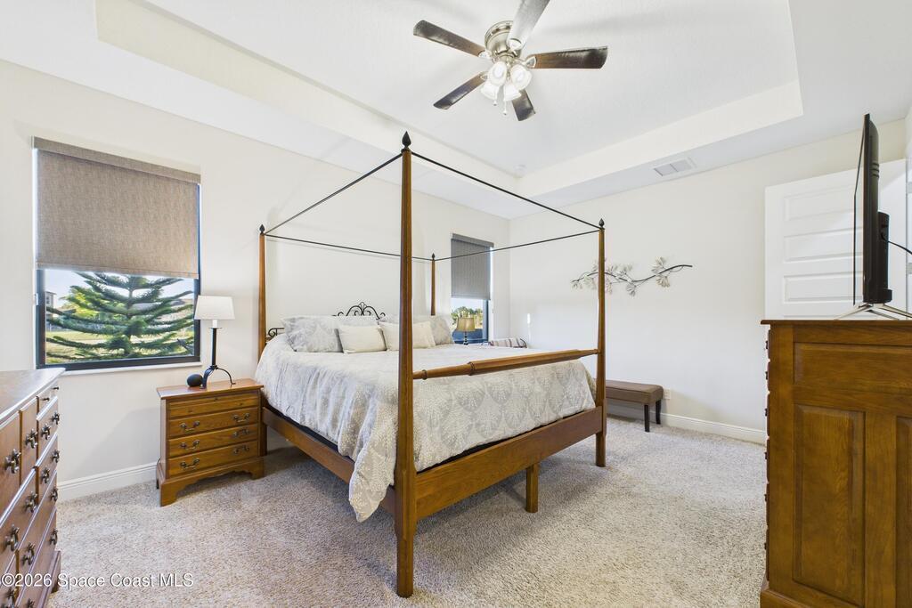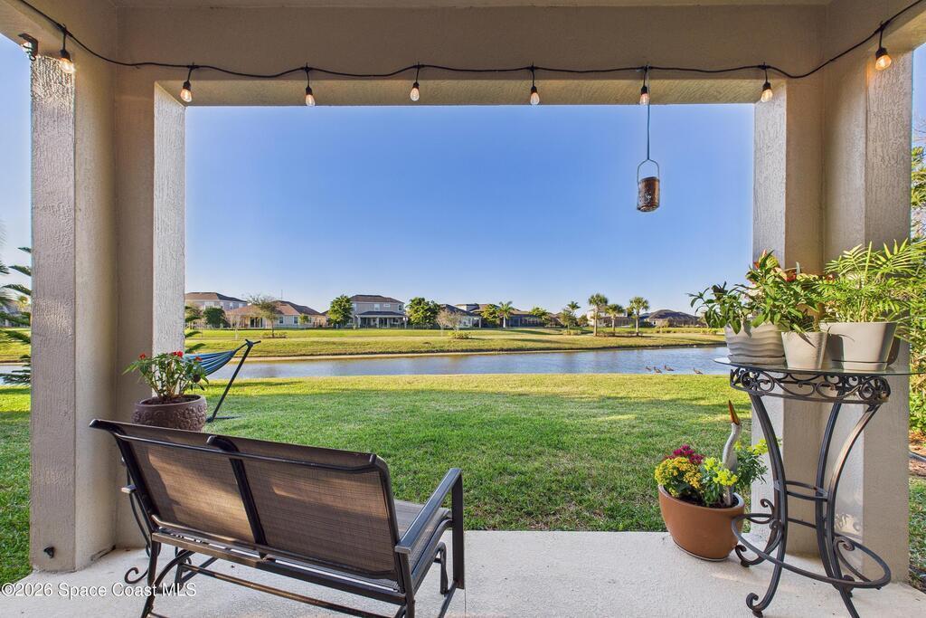 Welcome to this stunning waterfront home, full of UPGRADES, located in the highly desirable Trasona Cove Community. Built in 2019, the Juniper model offers 3 bedrooms, 2.5 bathrooms, and just under 2,000 square feet of thoughtfully designed living space. Tile flooring flows throughout the main living areas, with carpeted bedrooms providing comfort and warmth. The kitchen features 42-inch cabinetry, granite countertops, a tiled backsplash, stainless steel appliances newly replaced in 2025, and a walk-in pantry. Upgraded 51/4-inch baseboards are featured throughout the home. High ceilings are complemented by interior 8-foot doors, enhancing the home's open feel. The bright and spacious great room overlooks the tranquil lake and includes plantation shutters, while custom window shades are installed throughout the remainder of the home. Guest bedrooms are generously sized, and the guest bathroom offers a tiled shower and a double-sink granite vanity. Multiple closets provide ample storage.