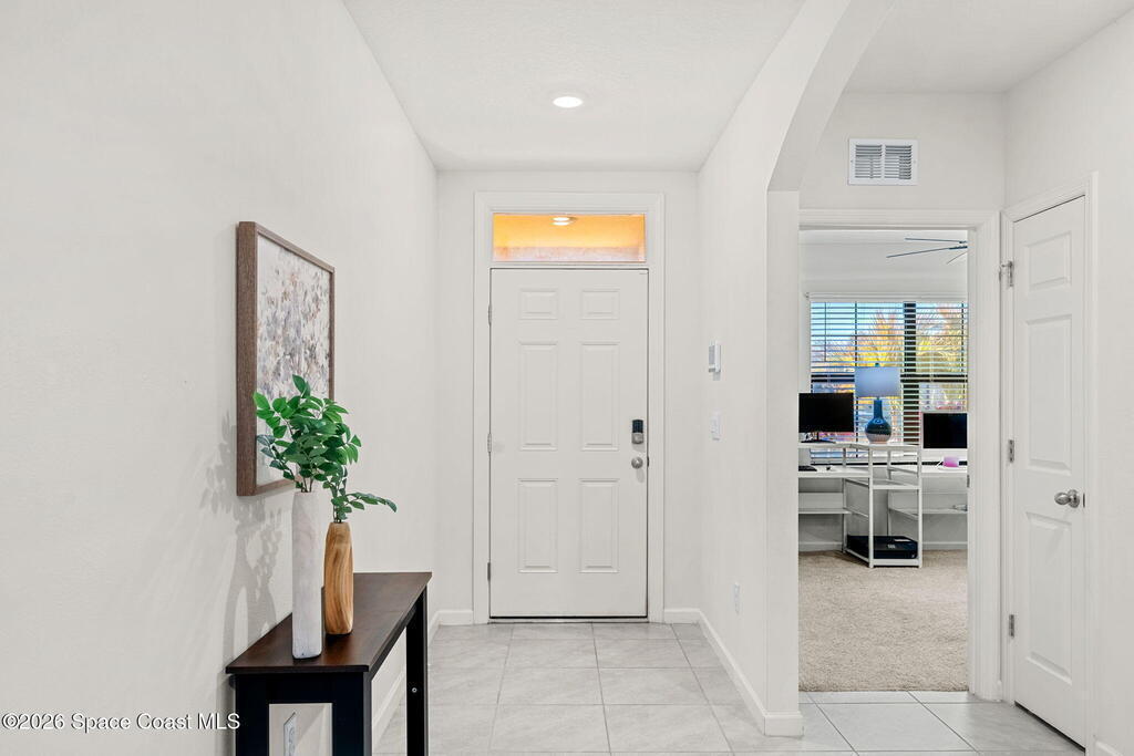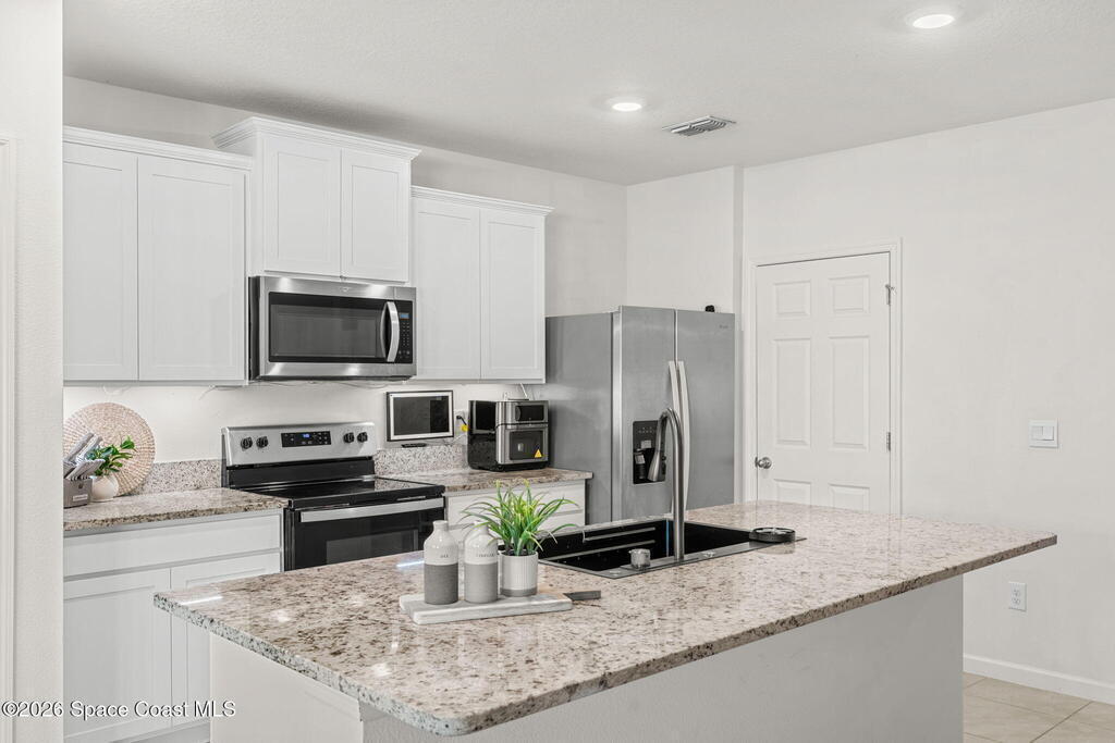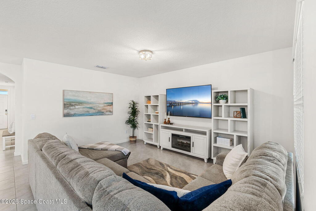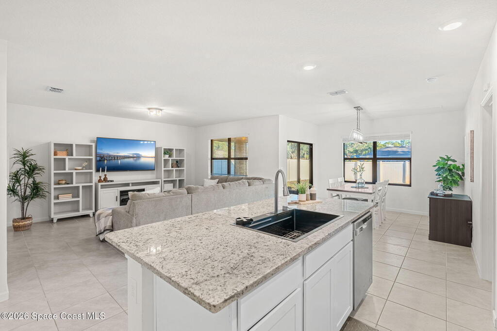 Step inside and feel the calm, easy flow of a home designed for real life. From the moment you arrive, the charming front porch and clean architectural lines set the tone--welcoming you into a space that feels both modern and warm. As you enter, natural light draws you through the foyer and into the heart of the home, where an open-concept layout brings the kitchen, dining, and living areas together seamlessly.The kitchen is the kind of space where mornings begin slowly and gatherings linger--featuring crisp cabinetry, stainless steel appliances, a spacious island with breakfast bar seating, and plenty of counter space for cooking, entertaining, or simply enjoying a quiet cup of coffee. Tile floors flow throughout the main living areas, enhancing the bright, airy feel and making everyday living effortless.