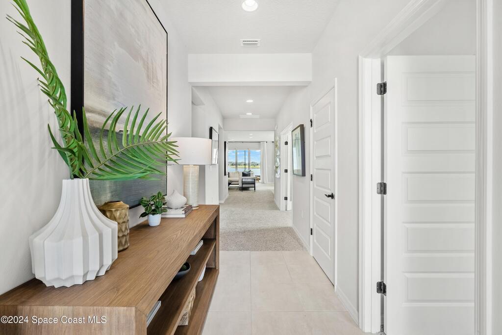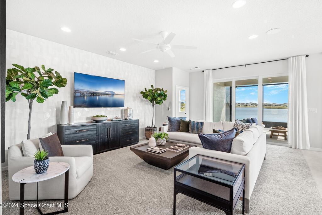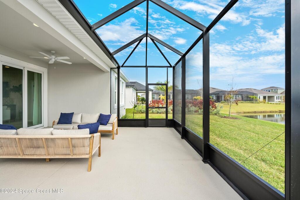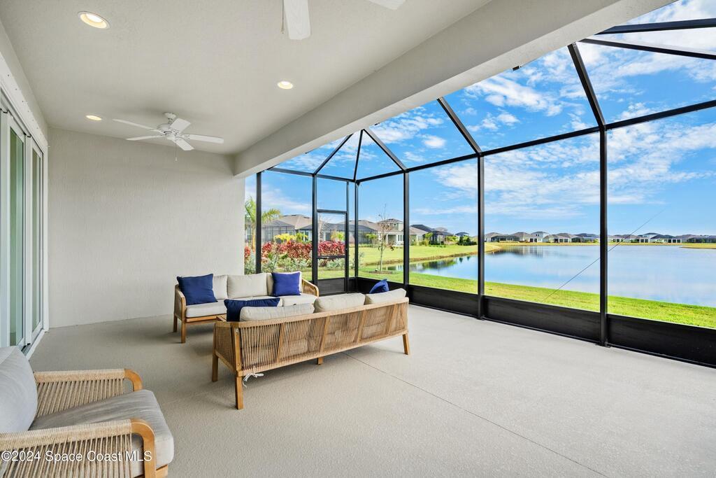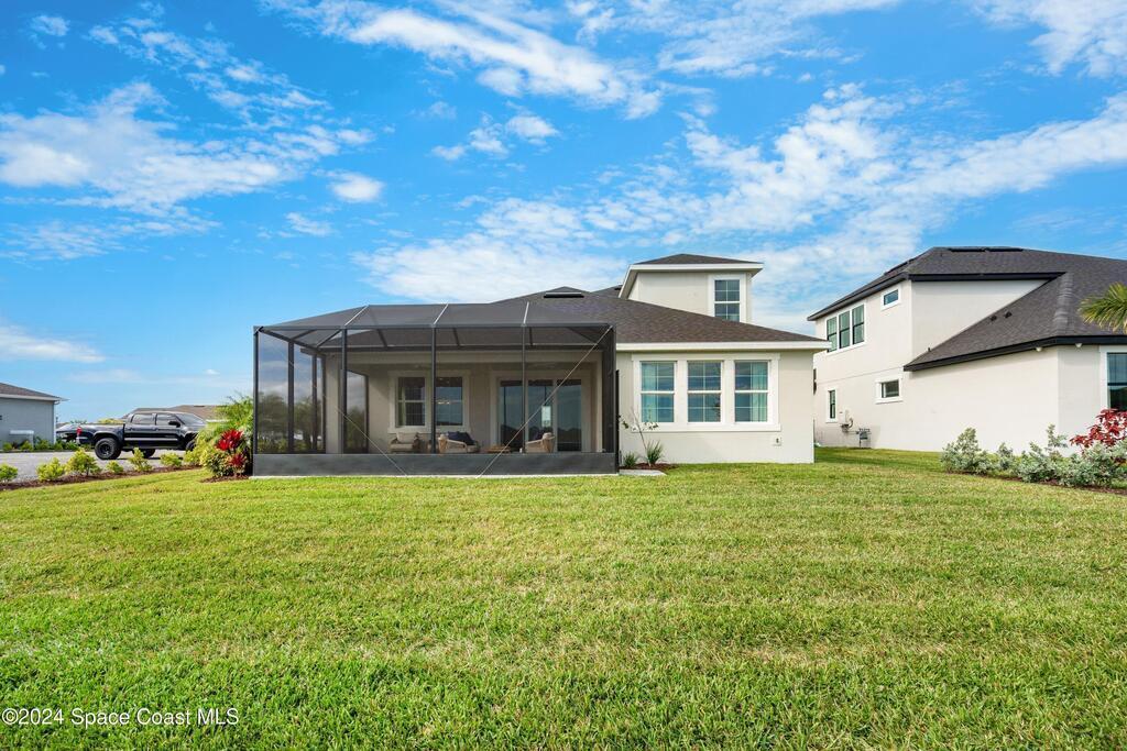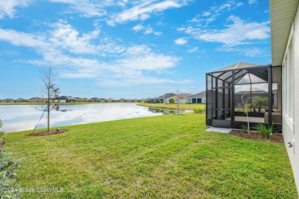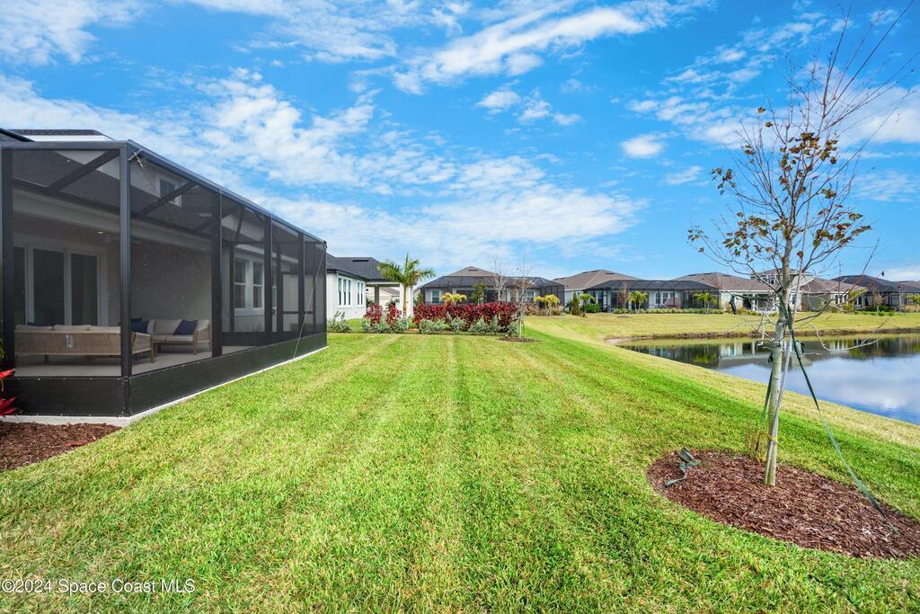 Lakefront Former Model Home in Viera where modern elegance meets an active, amenity-rich lifestyle. Built in 2023 and sited for long water views, this home welcomes you with brand new luxury vinyl plank flooring through the main living areas and an open floorplan with high ceilings that frame the lake from an oversized screened porch an ideal spot for morning coffee, sunset gatherings, or relaxed entertaining. The gourmet island kitchen features quartz countertops, stainless steel appliances, a pantry, and a large dining area overlooking the water, while a dedicated office with French doors provides a quiet workspace. The downstairs primary suite offers an expansive walk-in closet and a spa-like bath with double sinks, and two additional bedrooms plus two full baths on the main level ensure comfortable space for family and guests. Upstairs a spacious loft serves as a flexible family or recreation room accompanied by an additional bedroom and full bath. Located in Viera's award